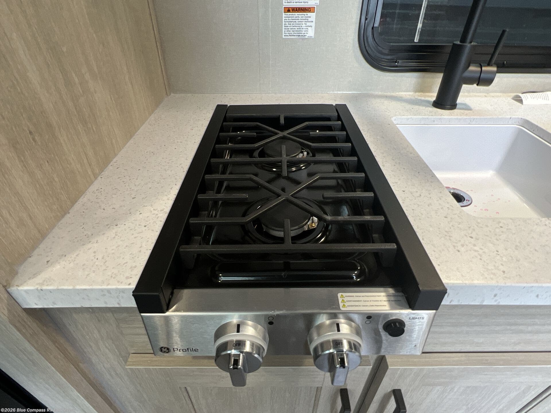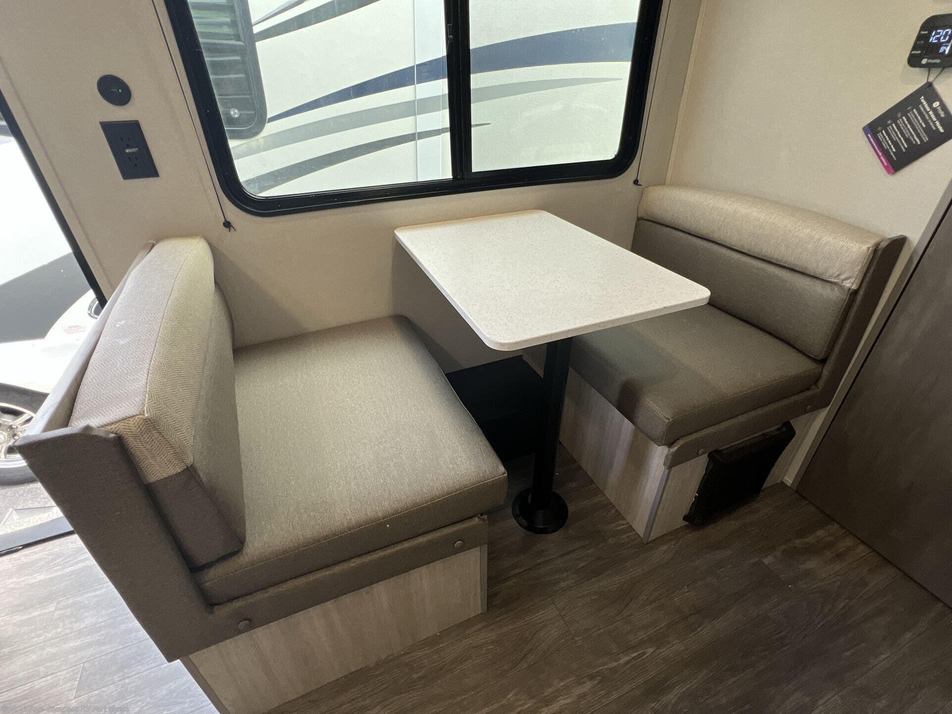 This cozy couples trailer with a queen bed is the perfect travel companion! You will have a queen bed up front to sleep on each night. The booth dinette, just to the left of the entry door, is a great place to enjoy meal and your morning cup of coffee! Use the two burner cooktop and microwave oven to create camp meals inside. This model includes plenty of storage space, including a large overhead in front, nightstands on either side of the sofa, a pantry for dry goods and snacks, and a linen cabinet in the rear bath that also offers a 36" x 30" shower, toilet and shelf for towels and such. There is even storage beneath the bar top as well.