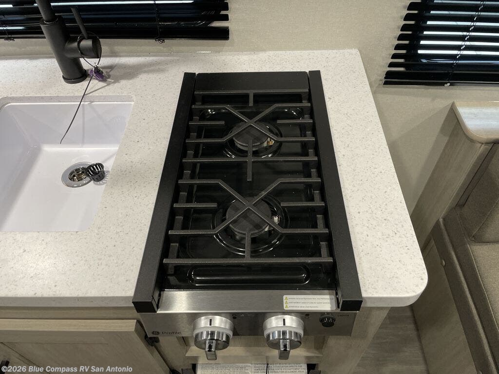 You will enjoy every adventure in this travel trailer for two to four! You will have a queen bed up front to sleep on each night, and the rear U-shaped dinette can easily be folded down to create additional sleeping for one or two more depending on size. Use the two burner cooktop and microwave oven to create meals inside. A centrally located bathroom is easily accessible from the entry and features a 36" x 30" shower, toilet, and mirror plus storage shelf. You also have an 11' electric awning on the outside with multi-colored lights with remote to select from depending on your mood, and exterior storage in front for all of your camp chairs and outdoor gear, plus more!