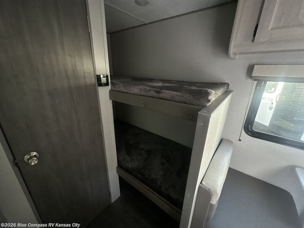 This cozy travel trailer can sleep five, so pack up and head out! You will have a queen bed up front to sleep on each night instead of an air mattress, and the little ones can take the 28" x 70" bunk beds! There is also a 60" sofa here that can sleep an additional guest and is perfect for relaxing during the day. The two burner cooktop and microwave oven means you won't have to cook over a campfire, and the private toilet and shower lets you clean up after a day outdoors. This model includes plenty of storage space, including bedroom storage, an exterior pass-through, plus additional outside storage beneath the bunks for hiking gear!