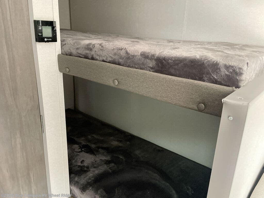 This cozy travel trailer can sleep five, so pack up and head out! You will have a queen bed up front to sleep on each night instead of an air mattress, and the little ones can take the 28" x 70" bunk beds! There is also a 60" sofa here that can sleep an additional guest and is perfect for relaxing during the day. The two burner cooktop and microwave oven means you won't have to cook over a campfire, and the private toilet and shower lets you clean up after a day outdoors. This model includes plenty of storage space, including bedroom storage, an exterior pass-through, plus additional outside storage beneath the bunks for hiking gear!