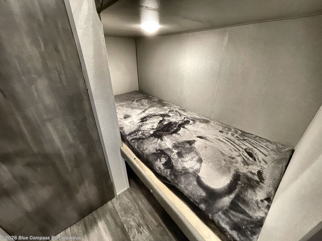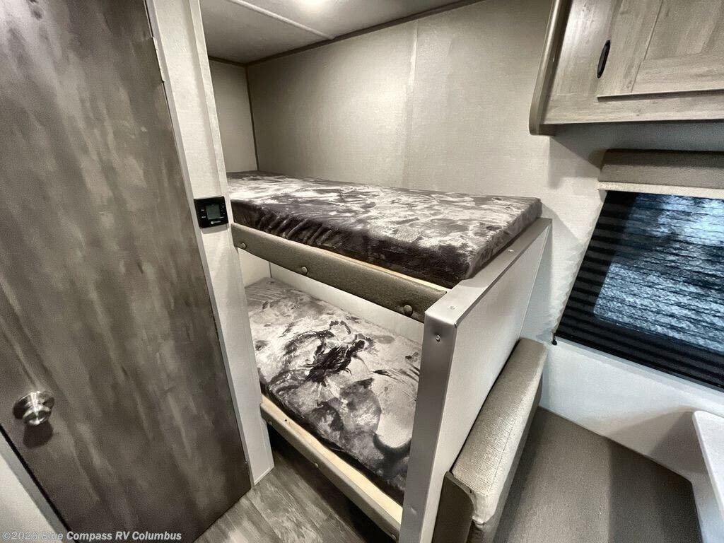 This cozy travel trailer can sleep five, so pack up and head out! You will have a queen bed up front to sleep on each night instead of an air mattress, and the little ones can take the 28" x 70" bunk beds! There is also a 60" sofa here that can sleep an additional guest and is perfect for relaxing during the day. The two burner cooktop and microwave oven means you won't have to cook over a campfire, and the private toilet and shower lets you clean up after a day outdoors. This model includes plenty of storage space, including bedroom storage, an exterior pass-through, plus additional outside storage beneath the bunks for hiking gear!