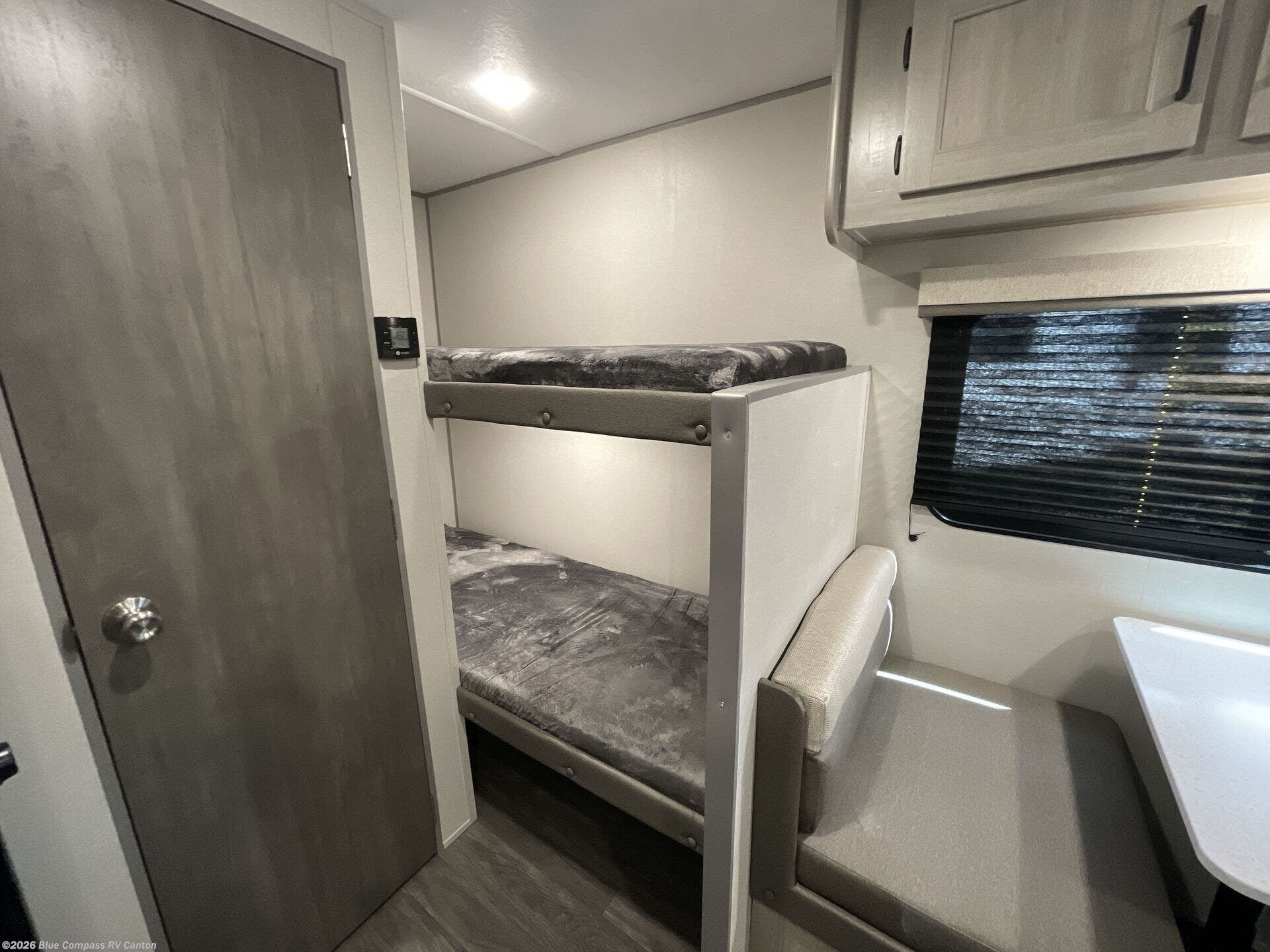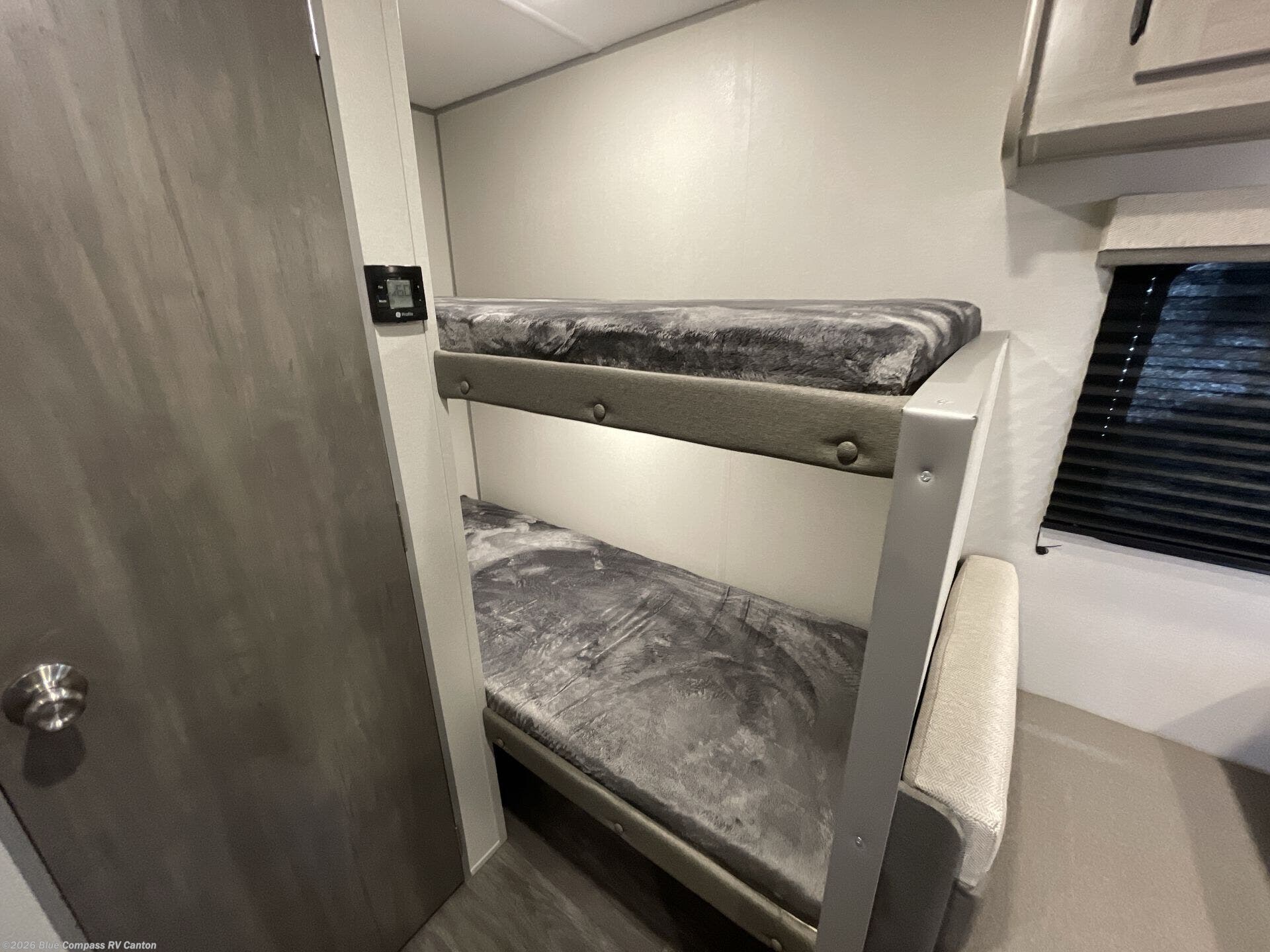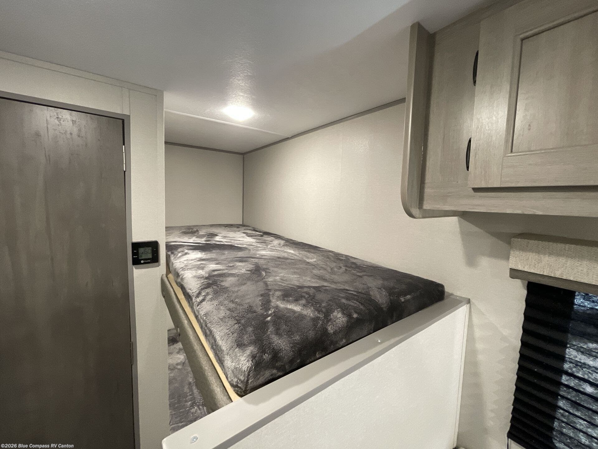 This cozy travel trailer can sleep five, so pack up and head out! You will have a queen bed up front to sleep on each night instead of an air mattress, and the little ones can take the 28" x 70" bunk beds! There is also a 60" sofa here that can sleep an additional guest and is perfect for relaxing during the day. The two burner cooktop and microwave oven means you won't have to cook over a campfire, and the private toilet and shower lets you clean up after a day outdoors. This model includes plenty of storage space, including bedroom storage, an exterior pass-through, plus additional outside storage beneath the bunks for hiking gear!
