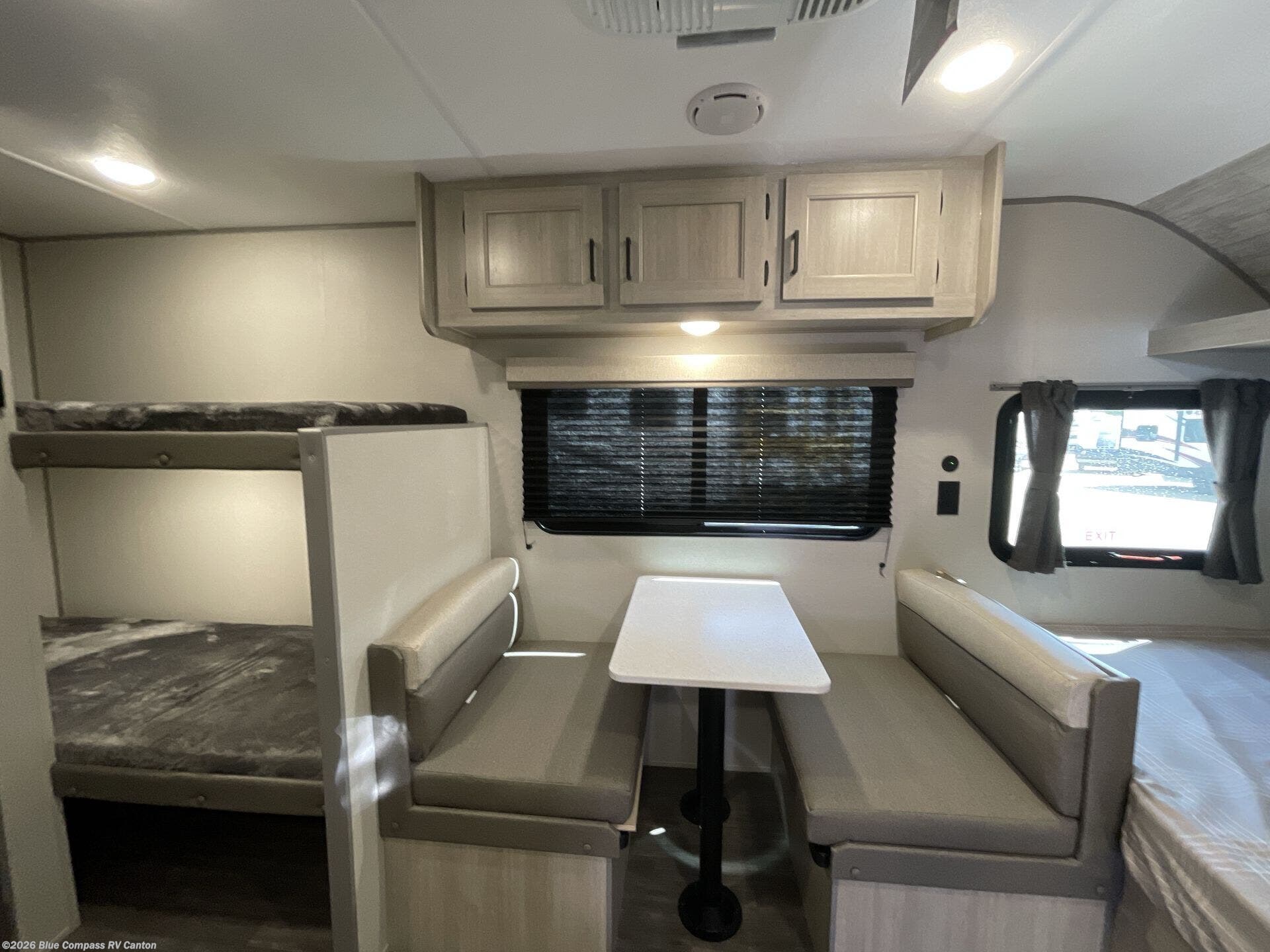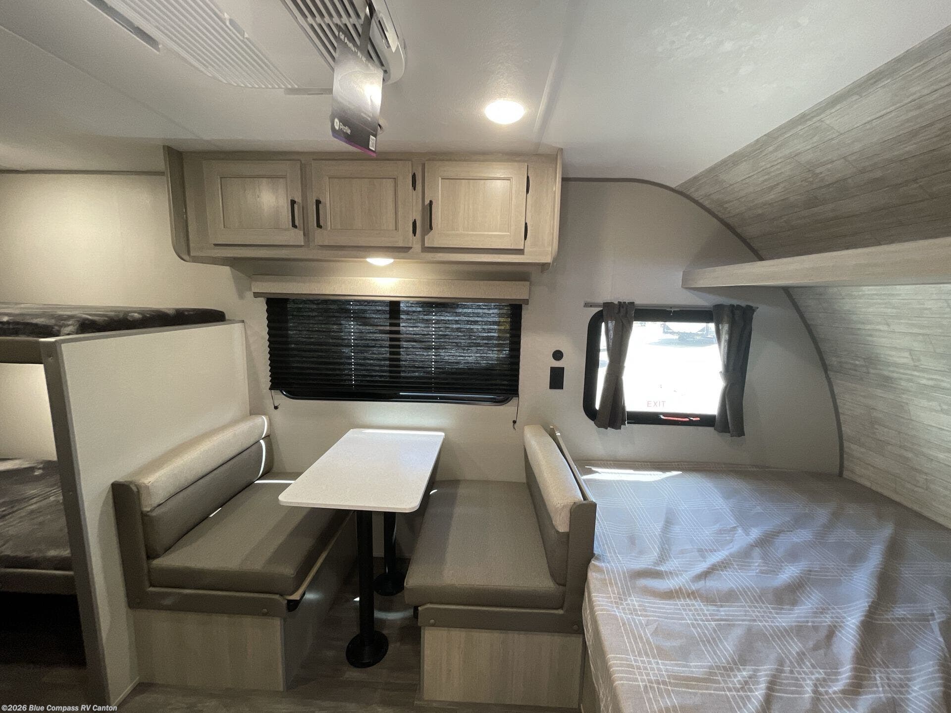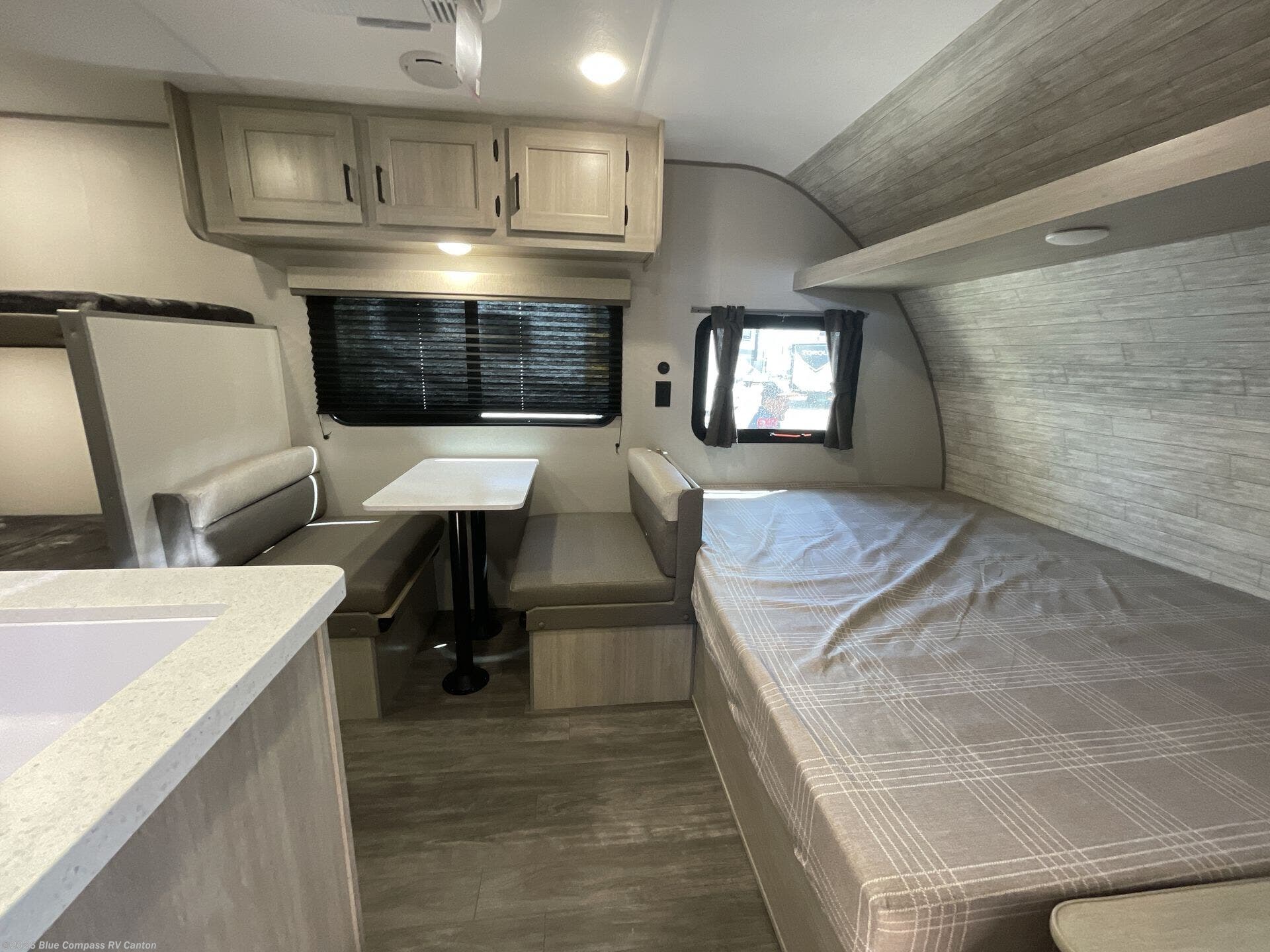 This cozy travel trailer can sleep five, so pack up and head out! You will have a queen bed up front to sleep on each night instead of an air mattress, and the little ones can take the 28" x 70" bunk beds! There is also a 60" sofa here that can sleep an additional guest and is perfect for relaxing during the day. The two burner cooktop and microwave oven means you won't have to cook over a campfire, and the private toilet and shower lets you clean up after a day outdoors. This model includes plenty of storage space, including bedroom storage, an exterior pass-through, plus additional outside storage beneath the bunks for hiking gear!