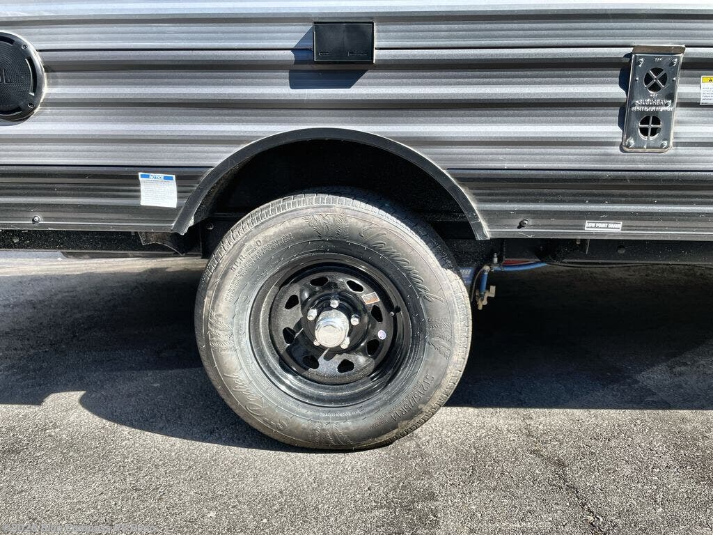 This cozy travel trailer can sleep five, so pack up and head out! You will have a queen bed up front to sleep on each night instead of an air mattress, and the little ones can take the 28" x 70" bunk beds! There is also a 60" sofa here that can sleep an additional guest and is perfect for relaxing during the day. The two burner cooktop and microwave oven means you won't have to cook over a campfire, and the private toilet and shower lets you clean up after a day outdoors. This model includes plenty of storage space, including bedroom storage, an exterior pass-through, plus additional outside storage beneath the bunks for hiking gear!
