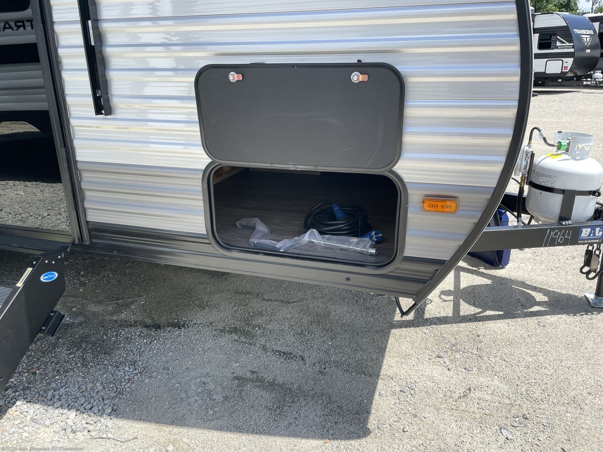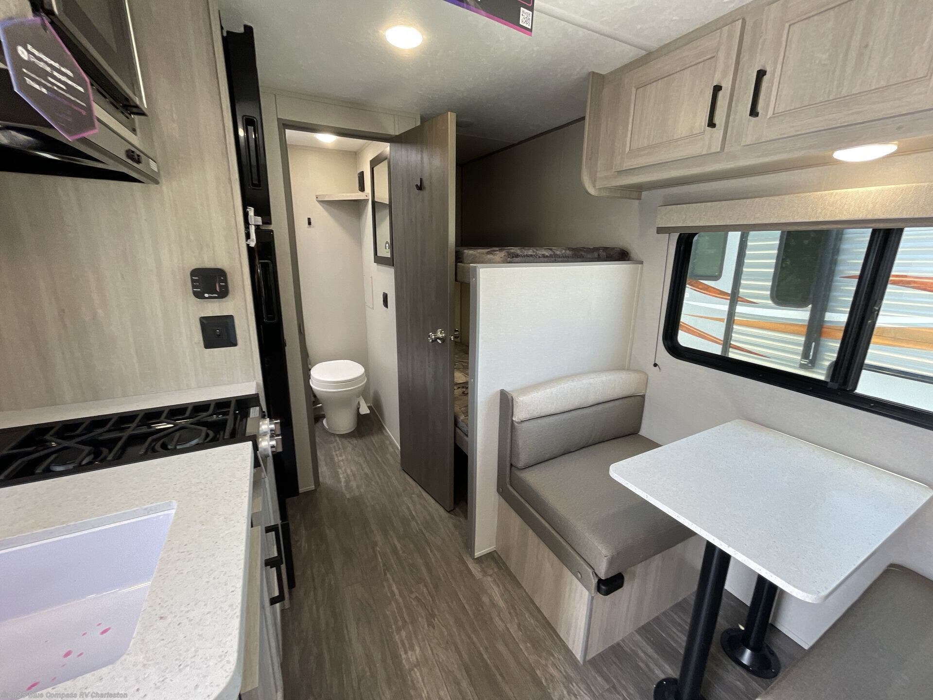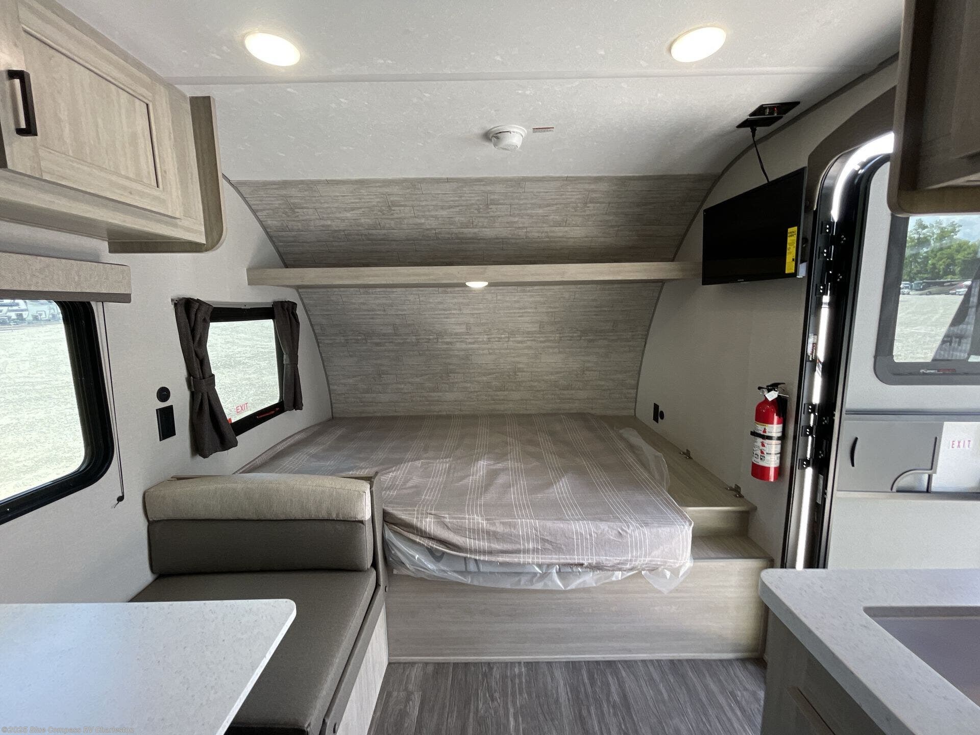 This cozy travel trailer can sleep five, so pack up and head out! You will have a queen bed up front to sleep on each night instead of an air mattress, and the little ones can take the 28" x 70" bunk beds! There is also a 60" sofa here that can sleep an additional guest and is perfect for relaxing during the day. The two burner cooktop and microwave oven means you won't have to cook over a campfire, and the private toilet and shower lets you clean up after a day outdoors. This model includes plenty of storage space, including bedroom storage, an exterior pass-through, plus additional outside storage beneath the bunks for hiking gear!