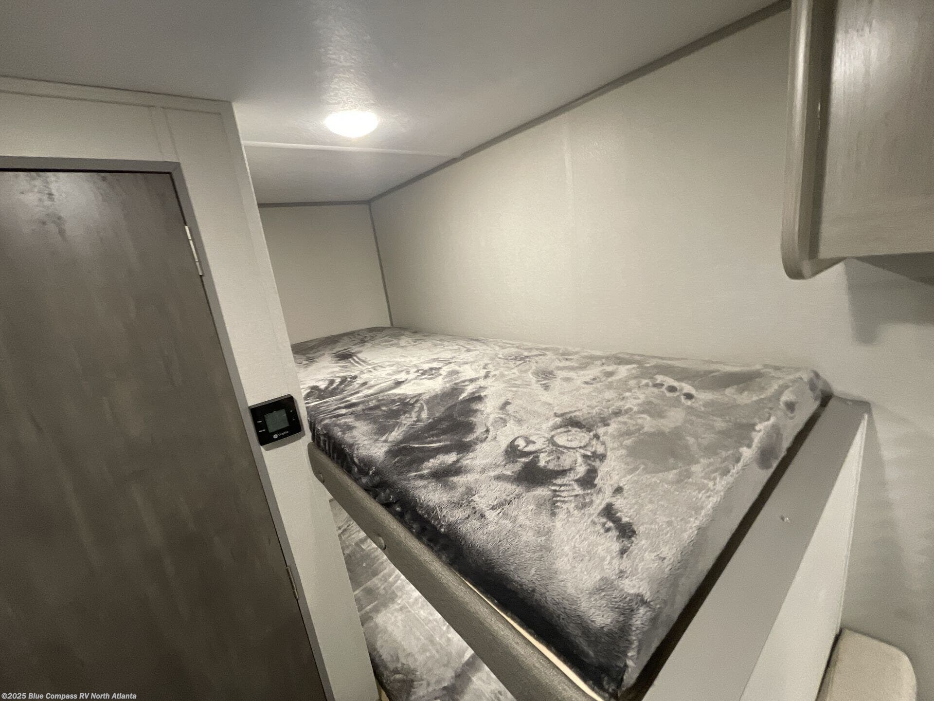 This cozy travel trailer can sleep five, so pack up and head out! You will have a queen bed up front to sleep on each night instead of an air mattress, and the little ones can take the 28" x 70" bunk beds! There is also a 60" sofa here that can sleep an additional guest and is perfect for relaxing during the day. The two burner cooktop and microwave oven means you won't have to cook over a campfire, and the private toilet and shower lets you clean up after a day outdoors. This model includes plenty of storage space, including bedroom storage, an exterior pass-through, plus additional outside storage beneath the bunks for hiking gear!
