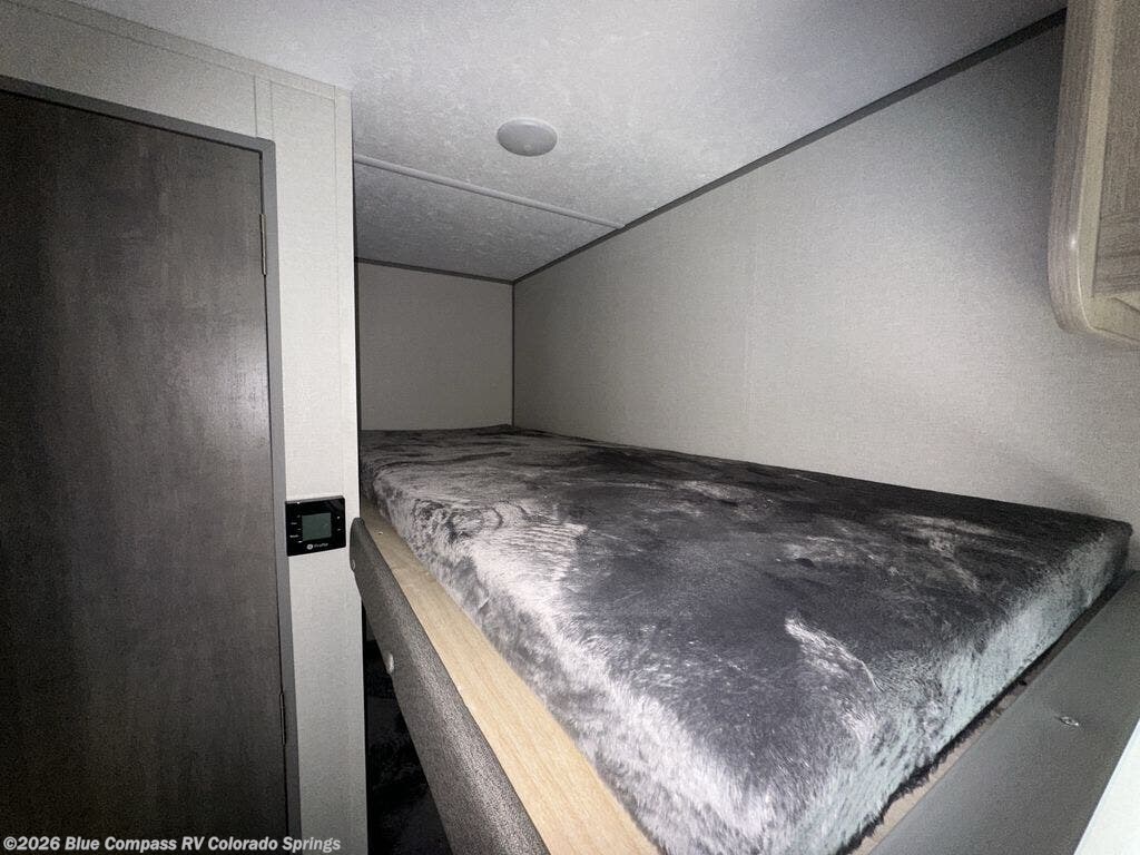 This cozy travel trailer can sleep five, so pack up and head out! You will have a queen bed up front to sleep on each night instead of an air mattress, and the little ones can take the 28" x 70" bunk beds! There is also a 60" sofa here that can sleep an additional guest and is perfect for relaxing during the day. The two burner cooktop and microwave oven means you won't have to cook over a campfire, and the private toilet and shower lets you clean up after a day outdoors. This model includes plenty of storage space, including bedroom storage, an exterior pass-through, plus additional outside storage beneath the bunks for hiking gear!