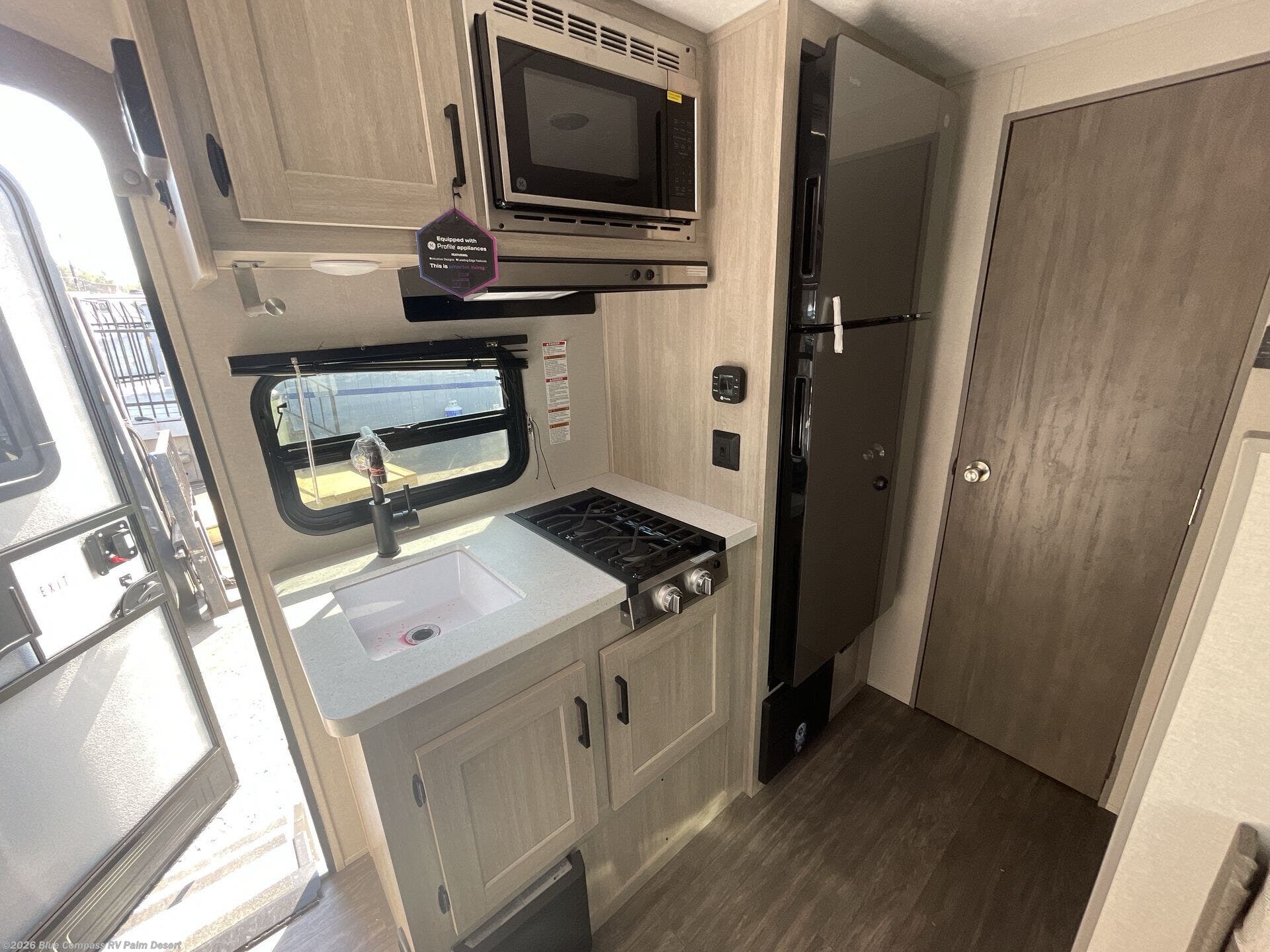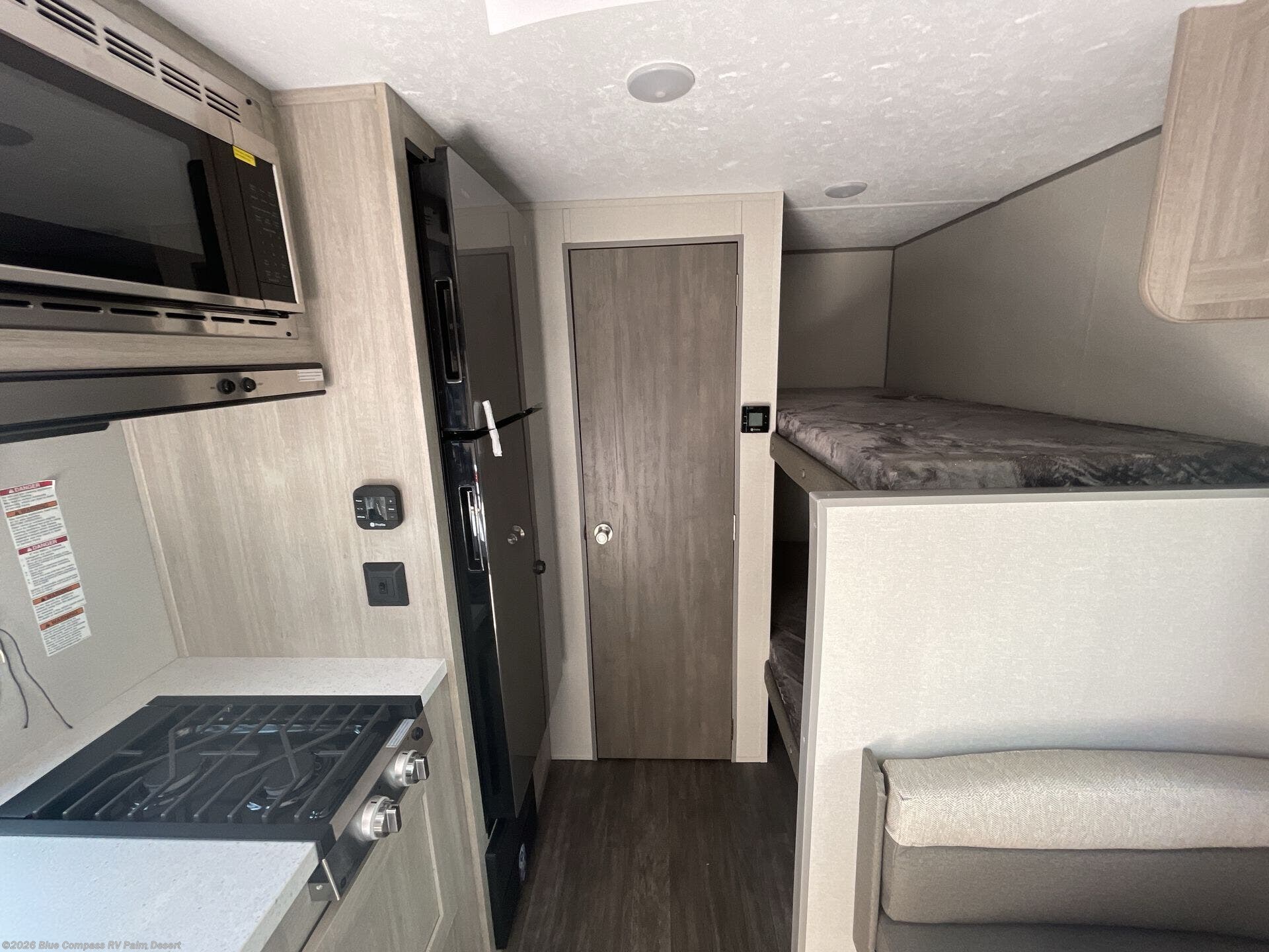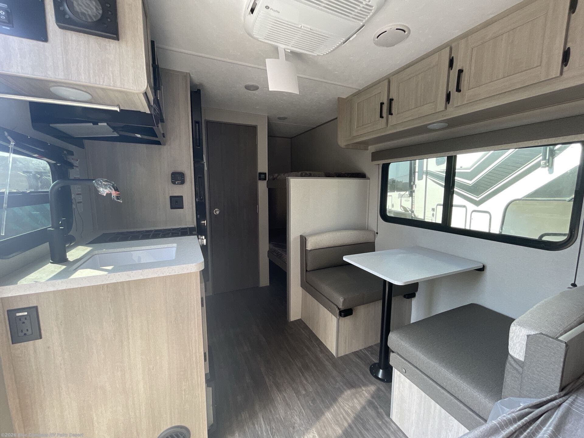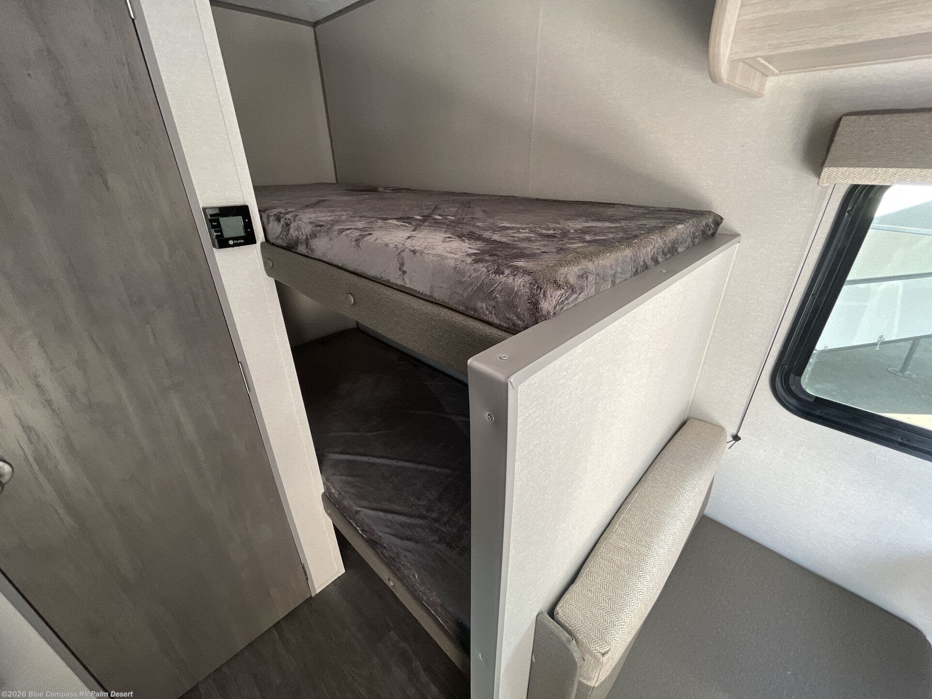 This cozy travel trailer can sleep five, so pack up and head out! You will have a queen bed up front to sleep on each night instead of an air mattress, and the little ones can take the 28" x 70" bunk beds! There is also a 60" sofa here that can sleep an additional guest and is perfect for relaxing during the day. The two burner cooktop and microwave oven means you won't have to cook over a campfire, and the private toilet and shower lets you clean up after a day outdoors. This model includes plenty of storage space, including bedroom storage, an exterior pass-through, plus additional outside storage beneath the bunks for hiking gear!