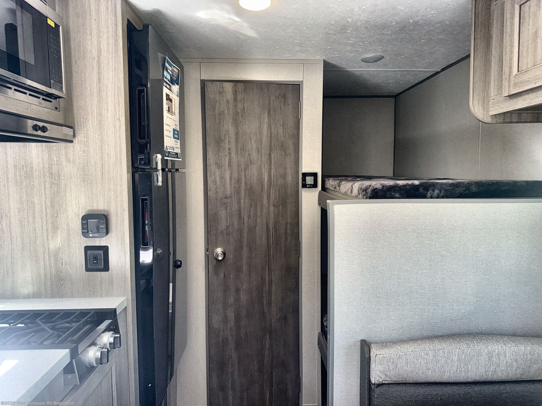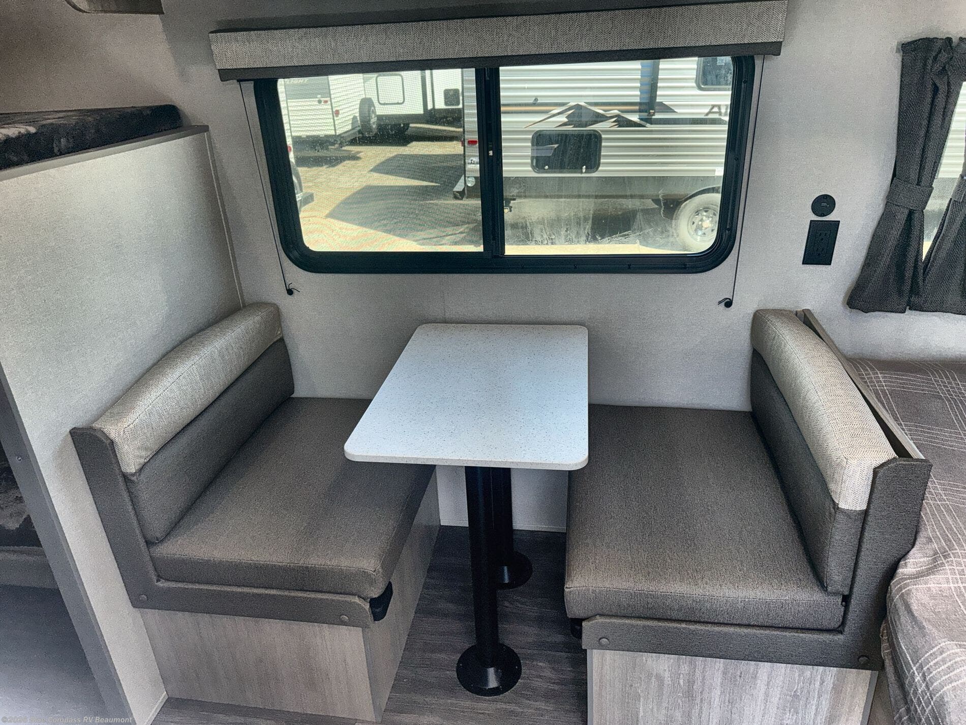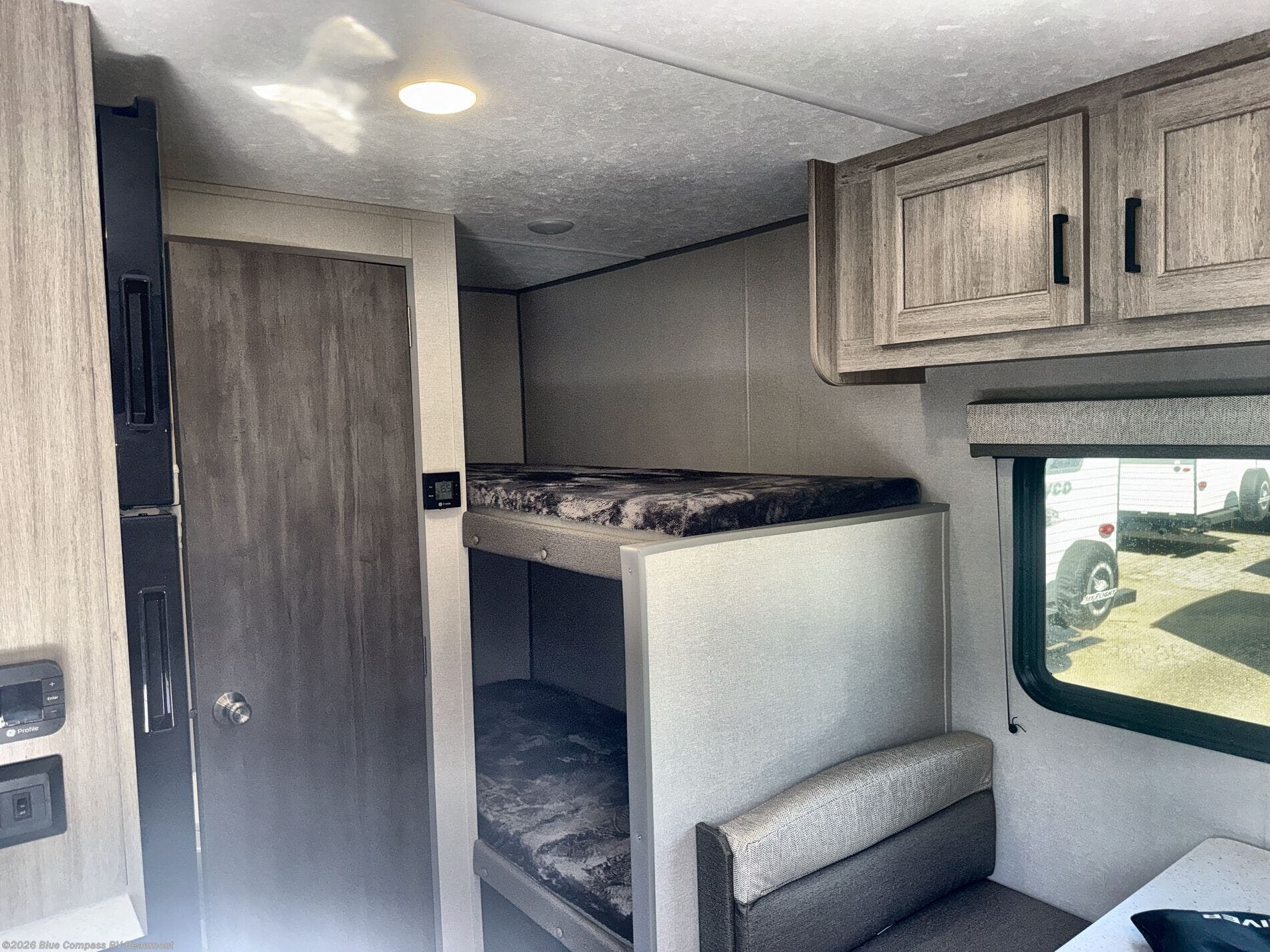 This cozy travel trailer can sleep five, so pack up and head out! You will have a queen bed up front to sleep on each night instead of an air mattress, and the little ones can take the 28" x 70" bunk beds! There is also a 60" sofa here that can sleep an additional guest and is perfect for relaxing during the day. The two burner cooktop and microwave oven means you won't have to cook over a campfire, and the private toilet and shower lets you clean up after a day outdoors. This model includes plenty of storage space, including bedroom storage, an exterior pass-through, plus additional outside storage beneath the bunks for hiking gear!