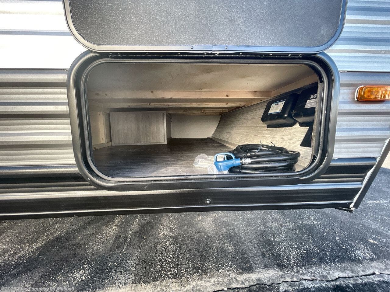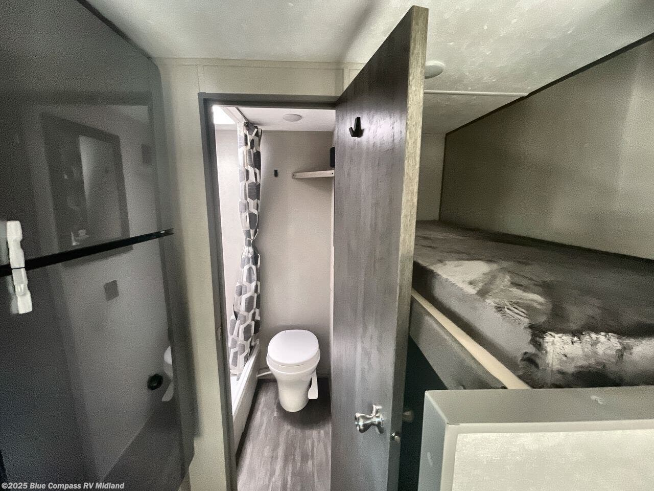 This cozy travel trailer can sleep five, so pack up and head out! You will have a queen bed up front to sleep on each night instead of an air mattress, and the little ones can take the 28" x 70" bunk beds! There is also a 60" sofa here that can sleep an additional guest and is perfect for relaxing during the day. The two burner cooktop and microwave oven means you won't have to cook over a campfire, and the private toilet and shower lets you clean up after a day outdoors. This model includes plenty of storage space, including bedroom storage, an exterior pass-through, plus additional outside storage beneath the bunks for hiking gear!