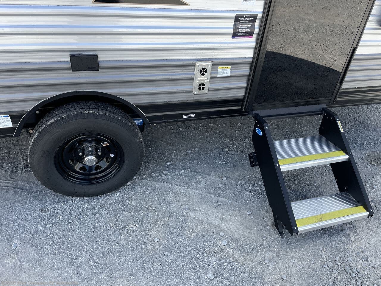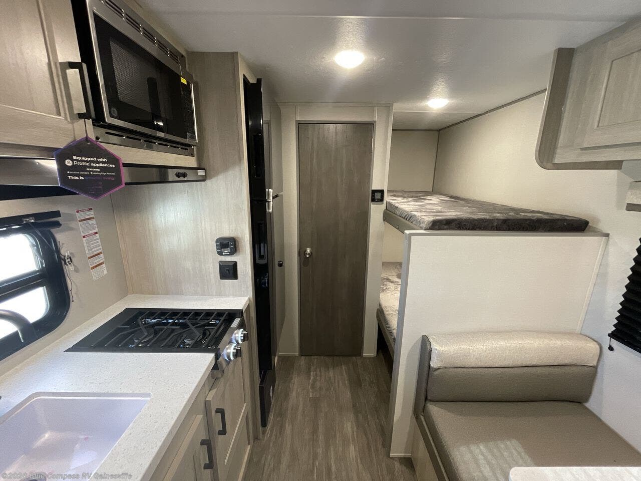 This cozy travel trailer can sleep five, so pack up and head out! You will have a queen bed up front to sleep on each night instead of an air mattress, and the little ones can take the 28" x 70" bunk beds! There is also a 60" sofa here that can sleep an additional guest and is perfect for relaxing during the day. The two burner cooktop and microwave oven means you won't have to cook over a campfire, and the private toilet and shower lets you clean up after a day outdoors. This model includes plenty of storage space, including bedroom storage, an exterior pass-through, plus additional outside storage beneath the bunks for hiking gear!