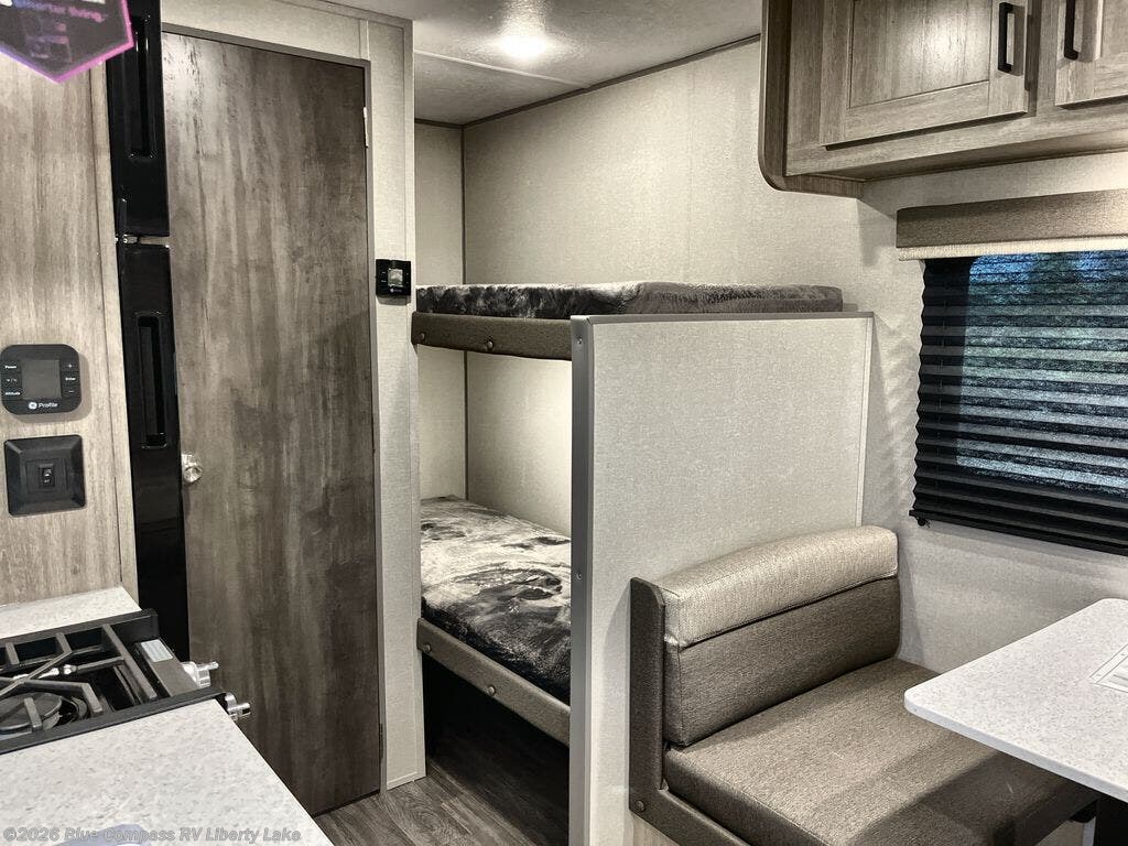 This cozy travel trailer can sleep five, so pack up and head out! You will have a queen bed up front to sleep on each night instead of an air mattress, and the little ones can take the 28" x 70" bunk beds! There is also a 60" sofa here that can sleep an additional guest and is perfect for relaxing during the day. The two burner cooktop and microwave oven means you won't have to cook over a campfire, and the private toilet and shower lets you clean up after a day outdoors. This model includes plenty of storage space, including bedroom storage, an exterior pass-through, plus additional outside storage beneath the bunks for hiking gear!