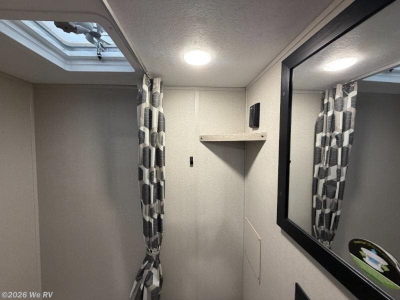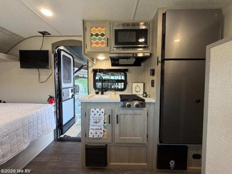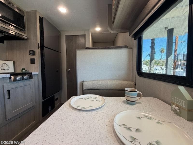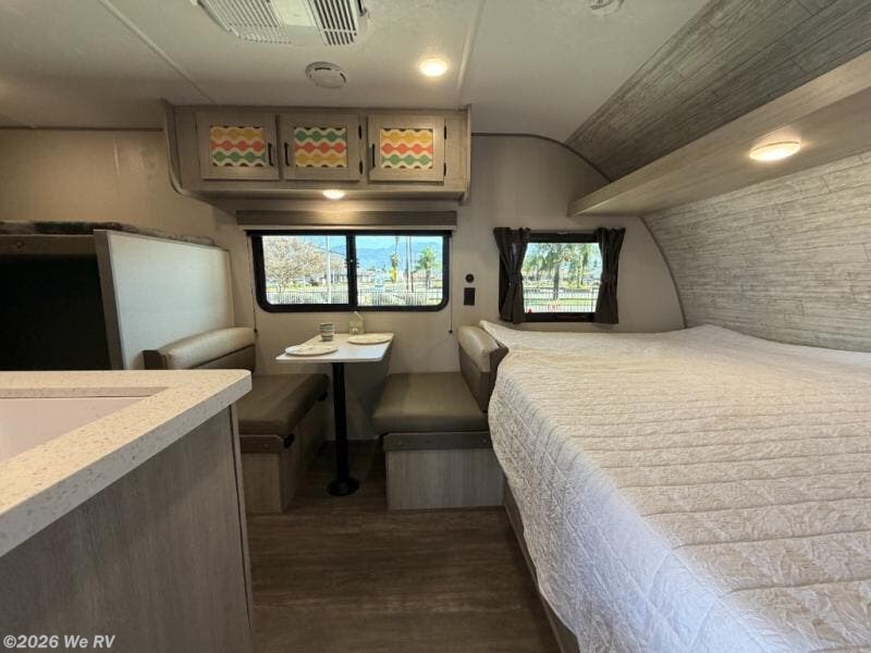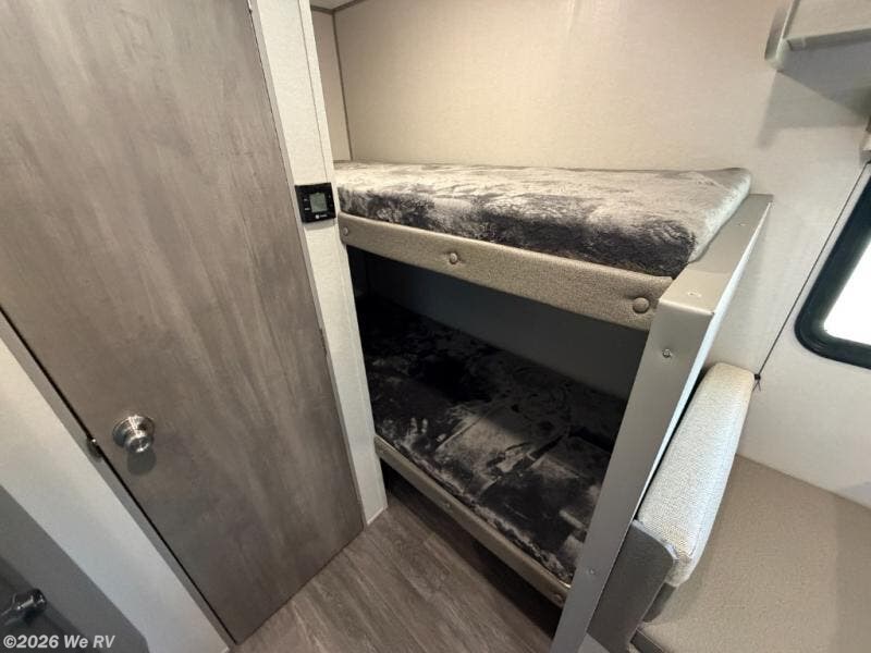 This cozy travel trailer can sleep five, so pack up and head out! You will have a queen bed up front to sleep on each night instead of an air mattress, and the little ones can take the 28" x 70" bunk beds! There is also a booth dinette here that can sleep an additional guest and is perfect for sharing meals during the day. The two burner cooktop and microwave oven means you won't have to cook over a campfire, and the private toilet and shower lets you clean up after a day outdoors. This model includes plenty of storage space, including bedroom storage, an exterior pass-through, plus additional outside storage beneath the bunks for hiking gear!