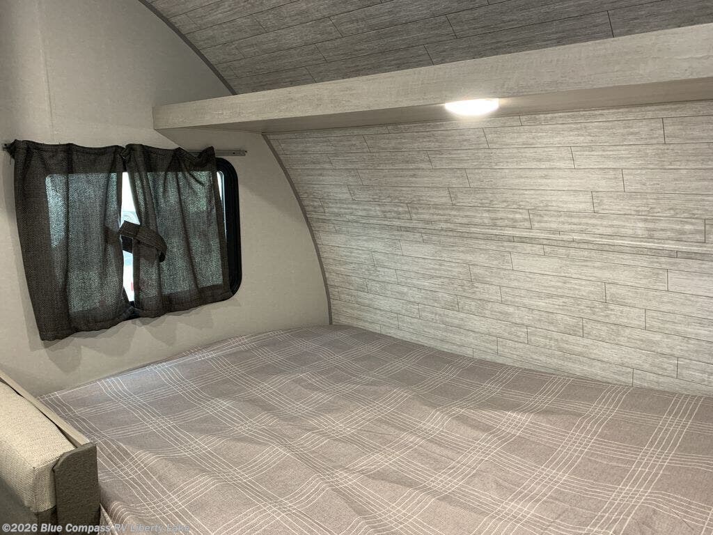 This cozy travel trailer can sleep five, so pack up and head out! You will have a queen bed up front to sleep on each night instead of an air mattress, and the little ones can take the 28" x 70" bunk beds! There is also a 60" sofa here that can sleep an additional guest and is perfect for relaxing during the day. The two burner cooktop and microwave oven means you won't have to cook over a campfire, and the private toilet and shower lets you clean up after a day outdoors. This model includes plenty of storage space, including bedroom storage, an exterior pass-through, plus additional outside storage beneath the bunks for hiking gear!