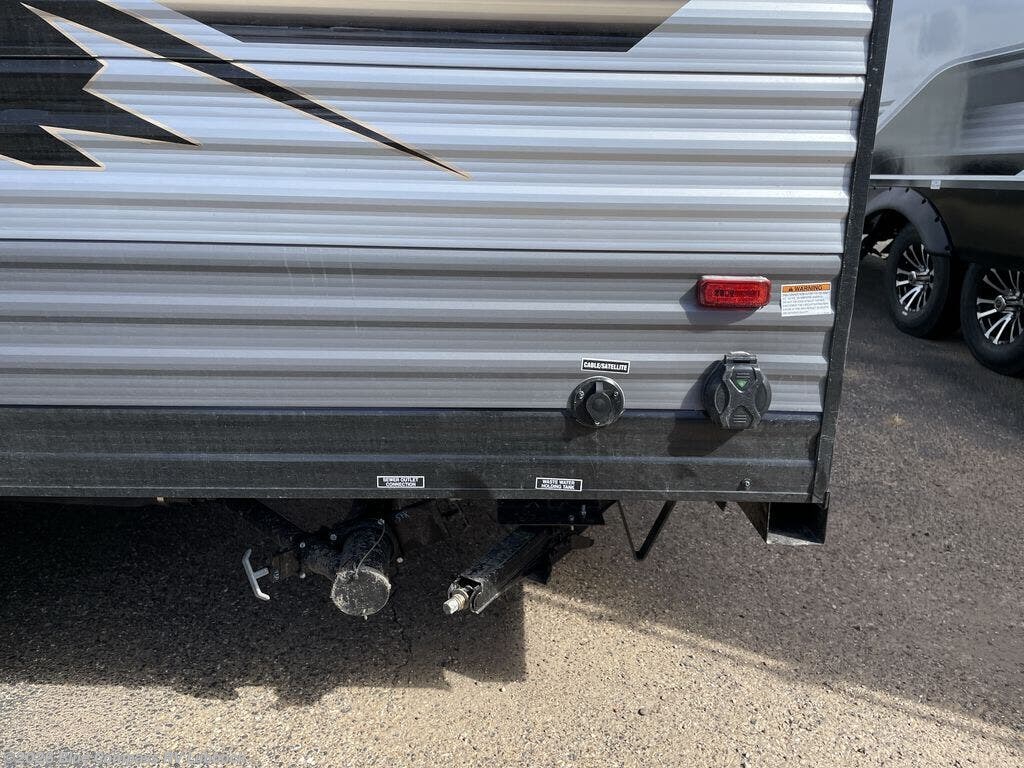 This cozy travel trailer can sleep five, so pack up and head out! You will have a queen bed up front to sleep on each night instead of an air mattress, and the little ones can take the 28" x 70" bunk beds! There is also a booth dinette here that can sleep an additional guest and is perfect for sharing meals during the day. The two burner cooktop and microwave oven means you won't have to cook over a campfire, and the private toilet and shower lets you clean up after a day outdoors. This model includes plenty of storage space, including bedroom storage, an exterior pass-through, plus additional outside storage beneath the bunks for hiking gear!