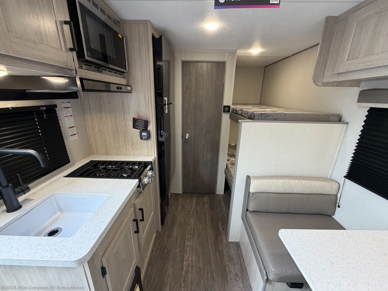 This cozy travel trailer can sleep five, so pack up and head out! You will have a queen bed up front to sleep on each night instead of an air mattress, and the little ones can take the 28" x 70" bunk beds! There is also a booth dinette here that can sleep an additional guest and is perfect for sharing meals during the day. The two burner cooktop and microwave oven means you won't have to cook over a campfire, and the private toilet and shower lets you clean up after a day outdoors. This model includes plenty of storage space, including bedroom storage, an exterior pass-through, plus additional outside storage beneath the bunks for hiking gear!