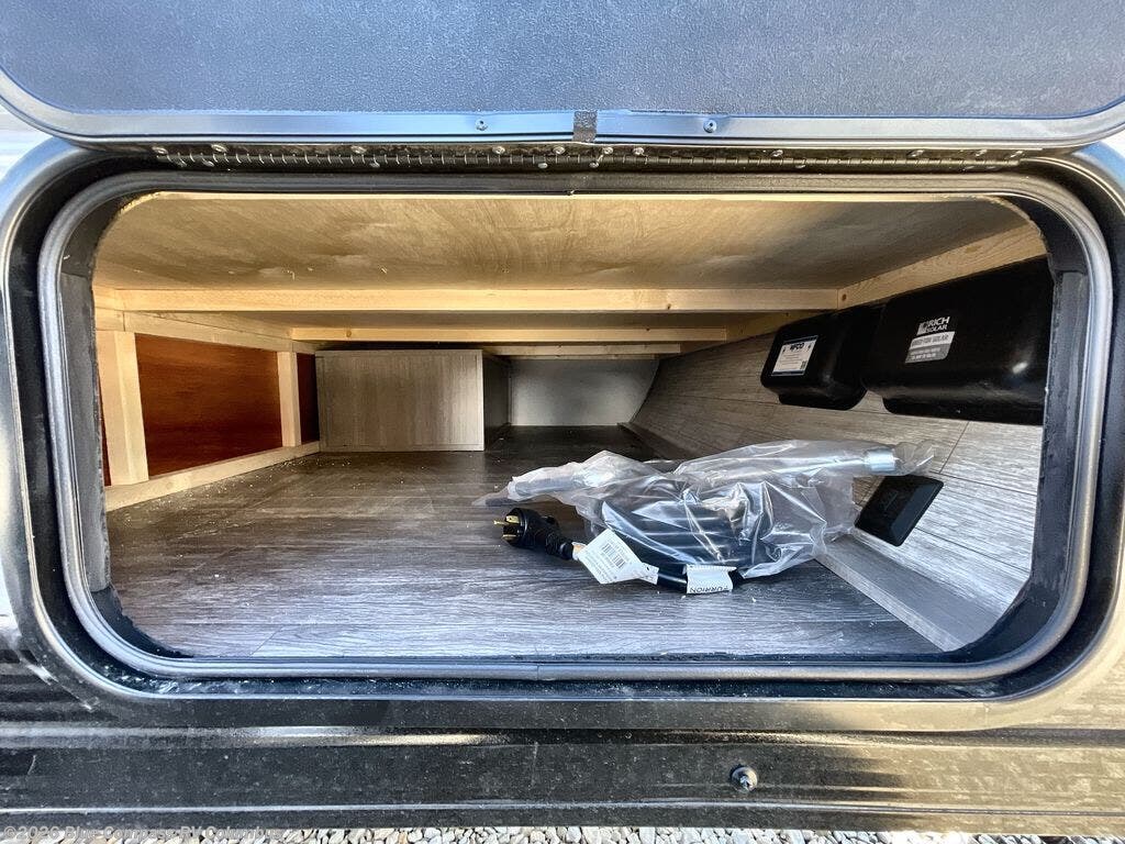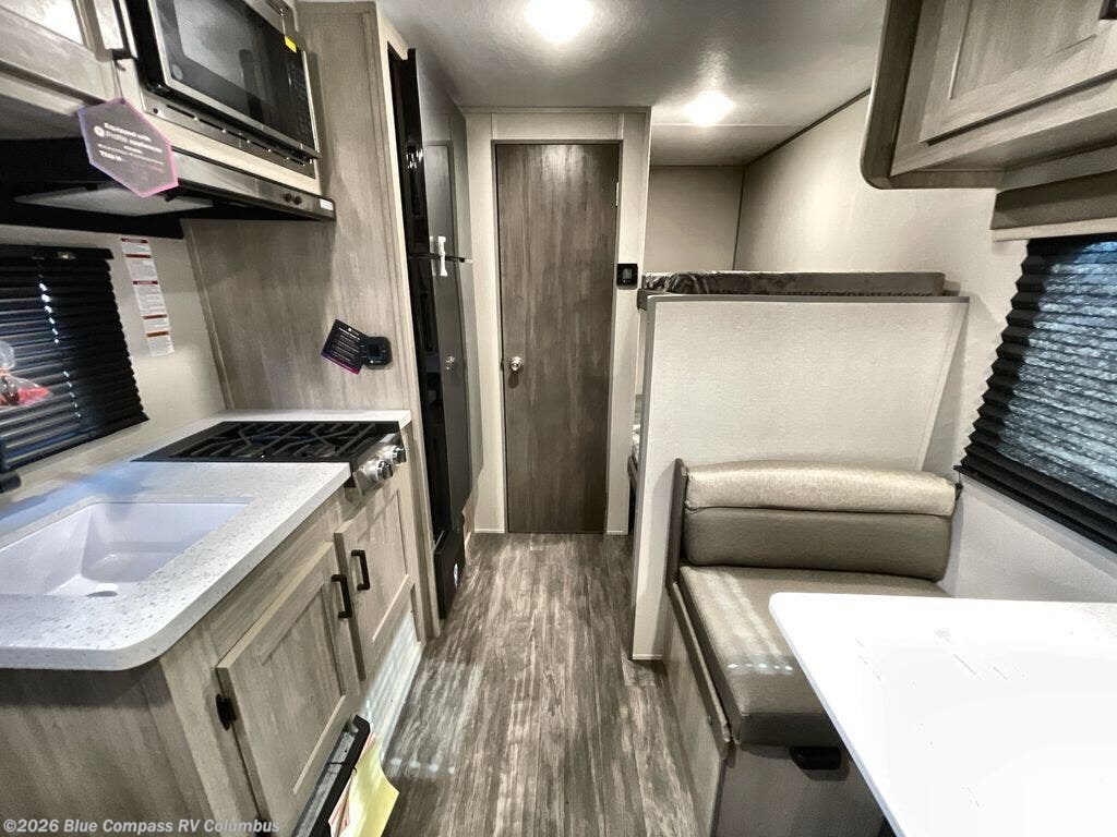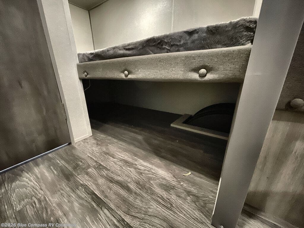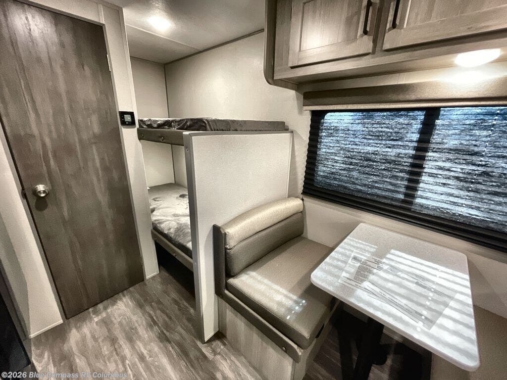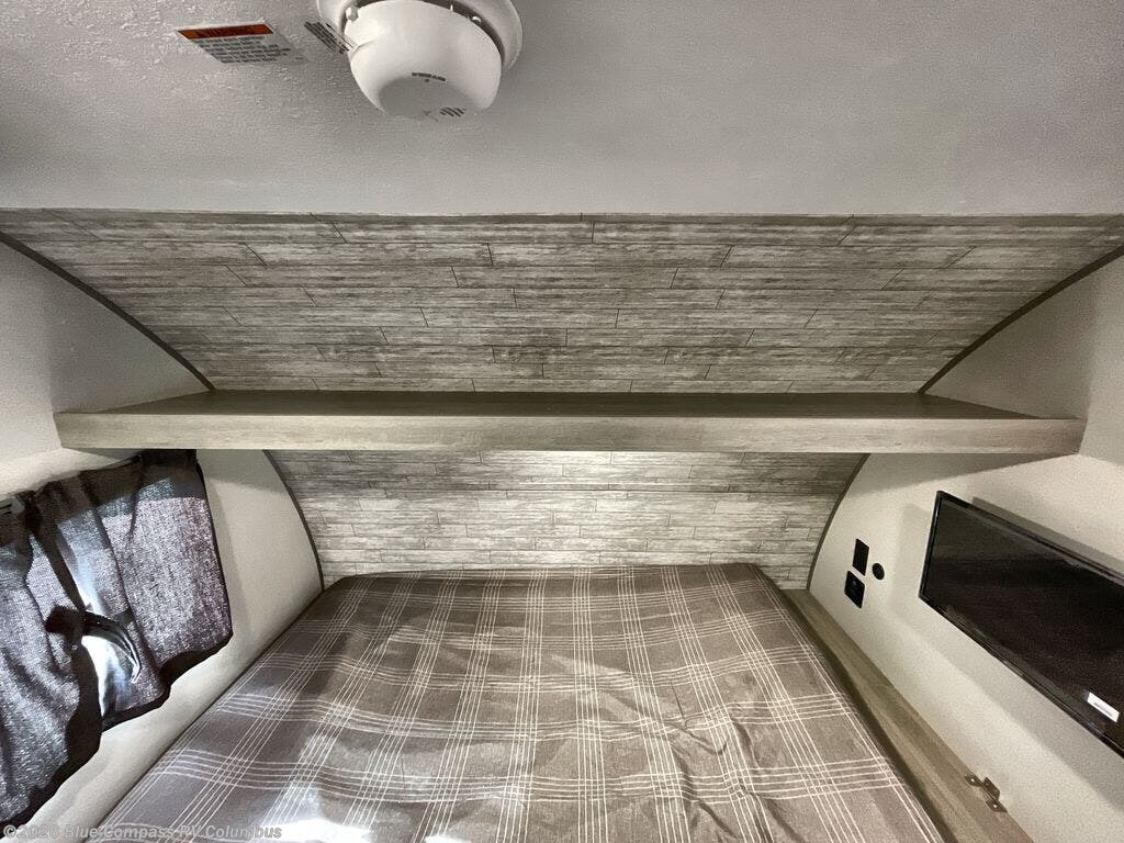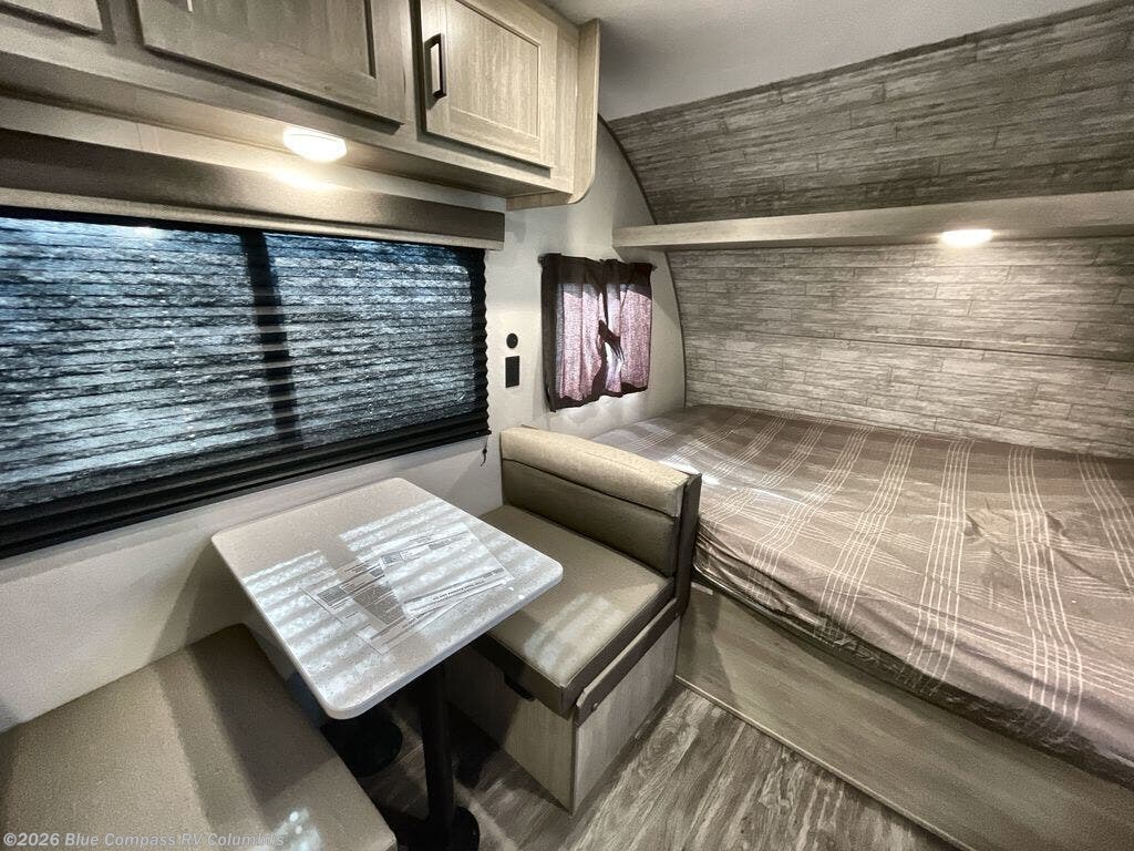 This cozy travel trailer can sleep five, so pack up and head out! You will have a queen bed up front to sleep on each night instead of an air mattress, and the little ones can take the 28" x 70" bunk beds! There is also a booth dinette here that can sleep an additional guest and is perfect for sharing meals during the day. The two burner cooktop and microwave oven means you won't have to cook over a campfire, and the private toilet and shower lets you clean up after a day outdoors. This model includes plenty of storage space, including bedroom storage, an exterior pass-through, plus additional outside storage beneath the bunks for hiking gear!