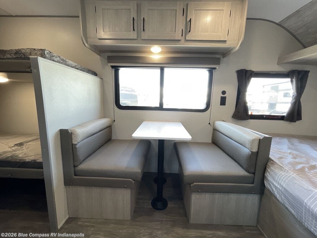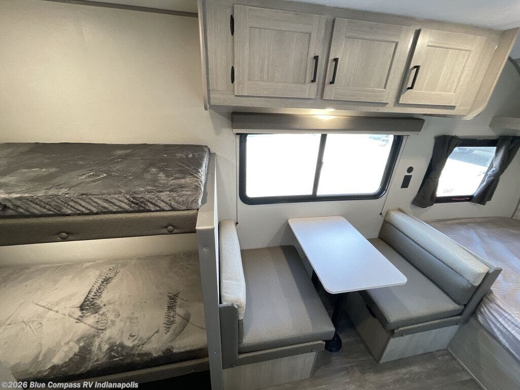 This cozy travel trailer can sleep five, so pack up and head out! You will have a queen bed up front to sleep on each night instead of an air mattress, and the little ones can take the 28" x 70" bunk beds! There is also a booth dinette here that can sleep an additional guest and is perfect for sharing meals during the day. The two burner cooktop and microwave oven means you won't have to cook over a campfire, and the private toilet and shower lets you clean up after a day outdoors. This model includes plenty of storage space, including bedroom storage, an exterior pass-through, plus additional outside storage beneath the bunks for hiking gear!