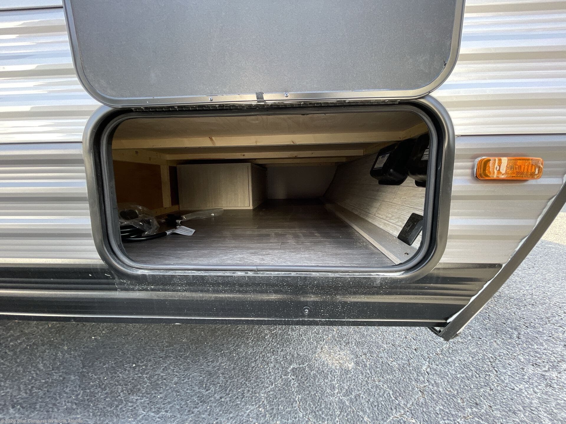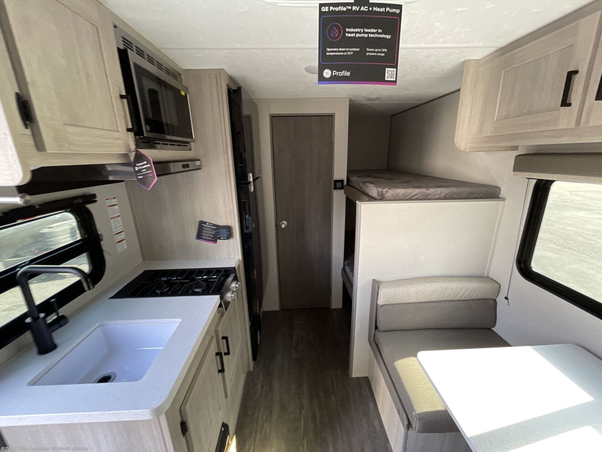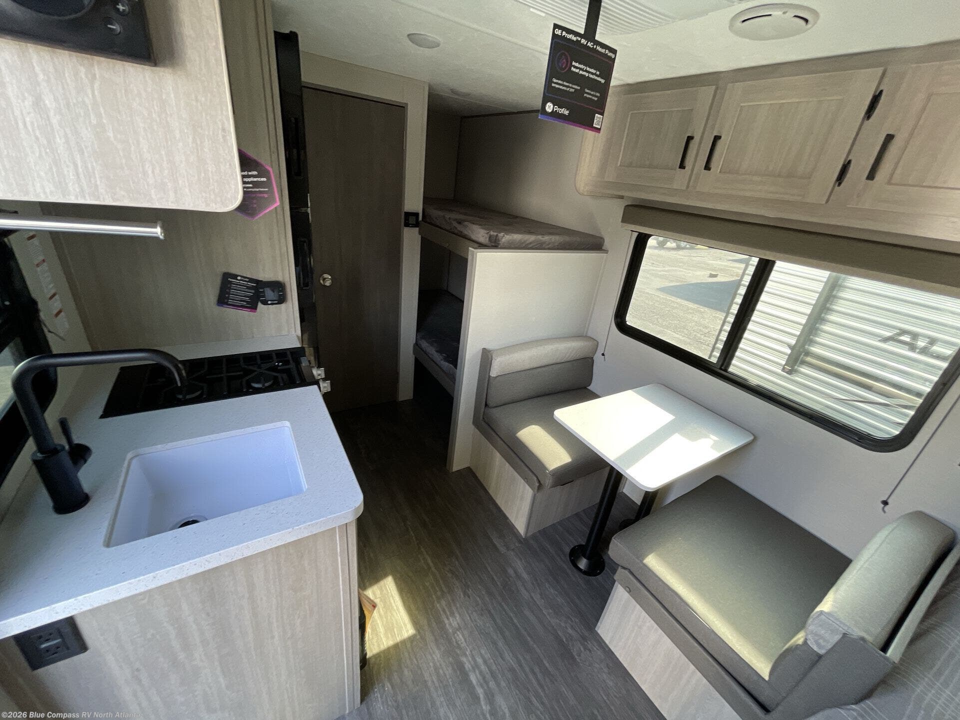 This cozy travel trailer can sleep five, so pack up and head out! You will have a queen bed up front to sleep on each night instead of an air mattress, and the little ones can take the 28" x 70" bunk beds! There is also a booth dinette here that can sleep an additional guest and is perfect for sharing meals during the day. The two burner cooktop and microwave oven means you won't have to cook over a campfire, and the private toilet and shower lets you clean up after a day outdoors. This model includes plenty of storage space, including bedroom storage, an exterior pass-through, plus additional outside storage beneath the bunks for hiking gear!