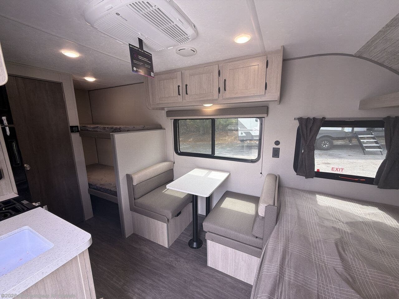 This cozy travel trailer can sleep five, so pack up and head out! You will have a queen bed up front to sleep on each night instead of an air mattress, and the little ones can take the 28" x 70" bunk beds! There is also a booth dinette here that can sleep an additional guest and is perfect for sharing meals during the day. The two burner cooktop and microwave oven means you won't have to cook over a campfire, and the private toilet and shower lets you clean up after a day outdoors. This model includes plenty of storage space, including bedroom storage, an exterior pass-through, plus additional outside storage beneath the bunks for hiking gear!