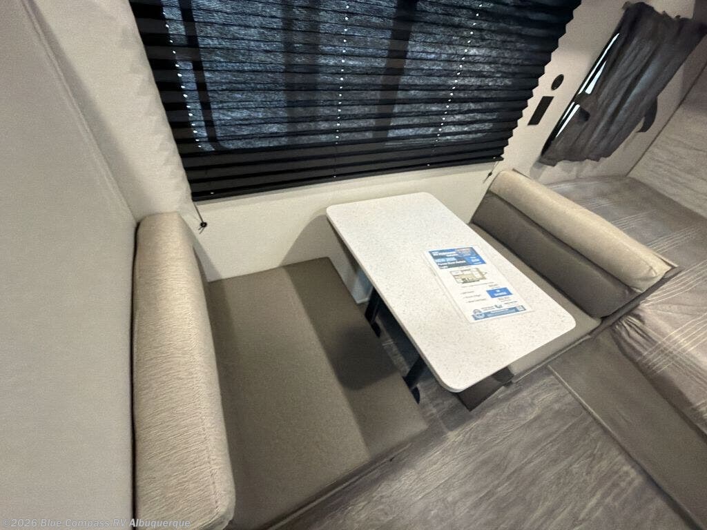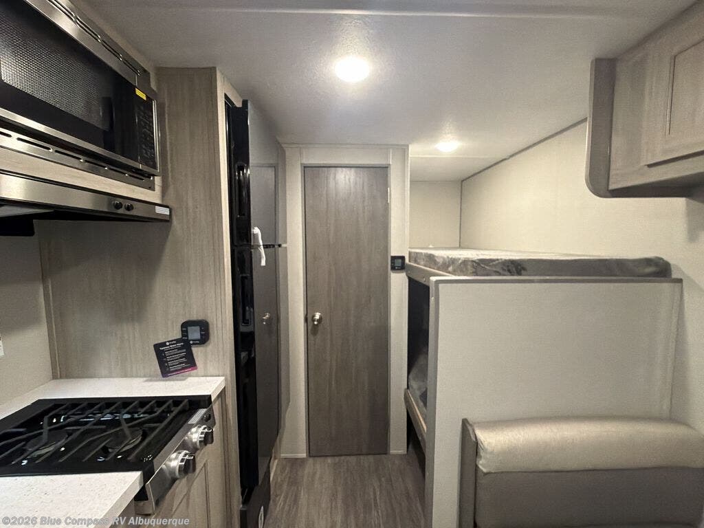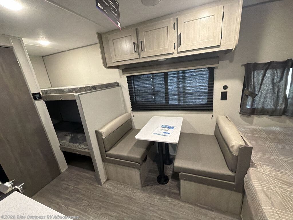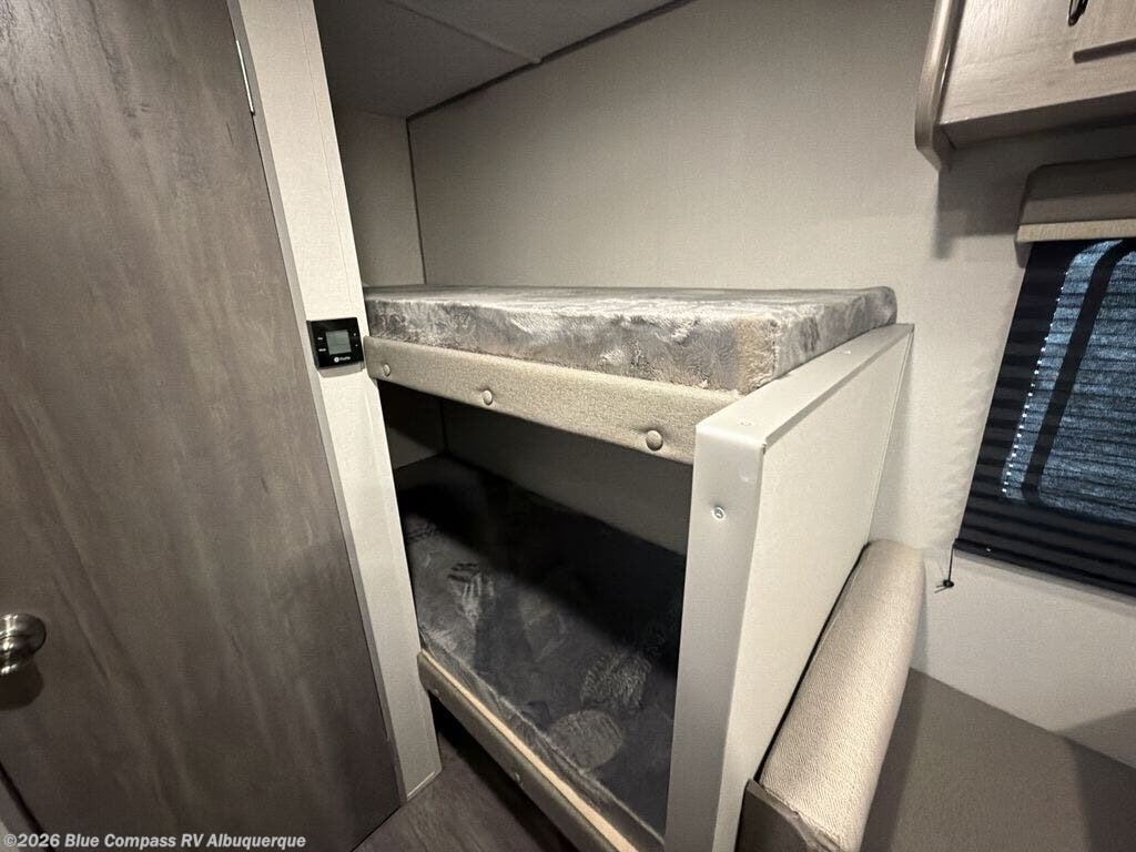 This cozy travel trailer can sleep five, so pack up and head out! You will have a queen bed up front to sleep on each night instead of an air mattress, and the little ones can take the 28" x 70" bunk beds! There is also a booth dinette here that can sleep an additional guest and is perfect for sharing meals during the day. The two burner cooktop and microwave oven means you won't have to cook over a campfire, and the private toilet and shower lets you clean up after a day outdoors. This model includes plenty of storage space, including bedroom storage, an exterior pass-through, plus additional outside storage beneath the bunks for hiking gear!