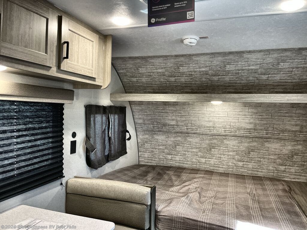 This cozy travel trailer can sleep five, so pack up and head out! You will have a queen bed up front to sleep on each night instead of an air mattress, and the little ones can take the 28" x 70" bunk beds! There is also a booth dinette here that can sleep an additional guest and is perfect for sharing meals during the day. The two burner cooktop and microwave oven means you won't have to cook over a campfire, and the private toilet and shower lets you clean up after a day outdoors. This model includes plenty of storage space, including bedroom storage, an exterior pass-through, plus additional outside storage beneath the bunks for hiking gear!