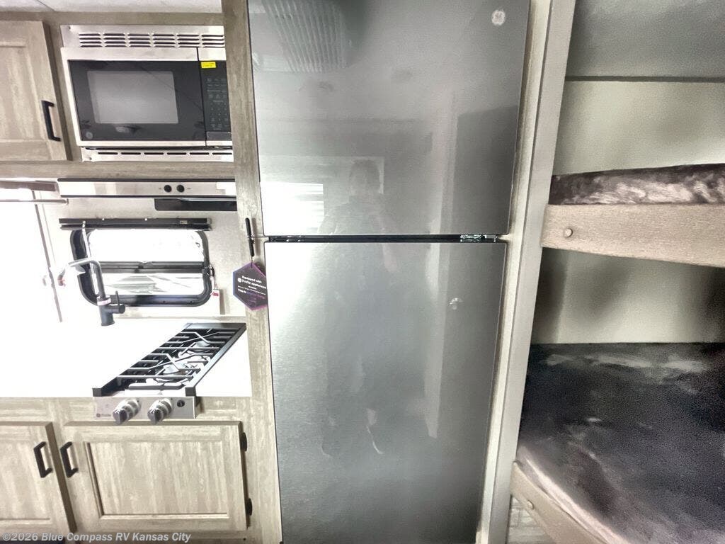 Your family or group will have a fun time camping in this travel trailer! The front Murphy bed provides versatility with a sofa to sit on during the day and a 60" x 74" bed to sleep on at night. The U-shaped dinette slide creates more interior space, a comfortable place to eat, and even an extra sleeping space for a guest or two depending on their sizes. The 46" x 74" double-size bunk beds are also a comfortable place to rest, and they are conveniently next to the rear corner bathroom. If you wish to cook out in the great outdoors then add the optional camper kitchen which comes with a cabinet, a refrigerator, and a pull out griddle!