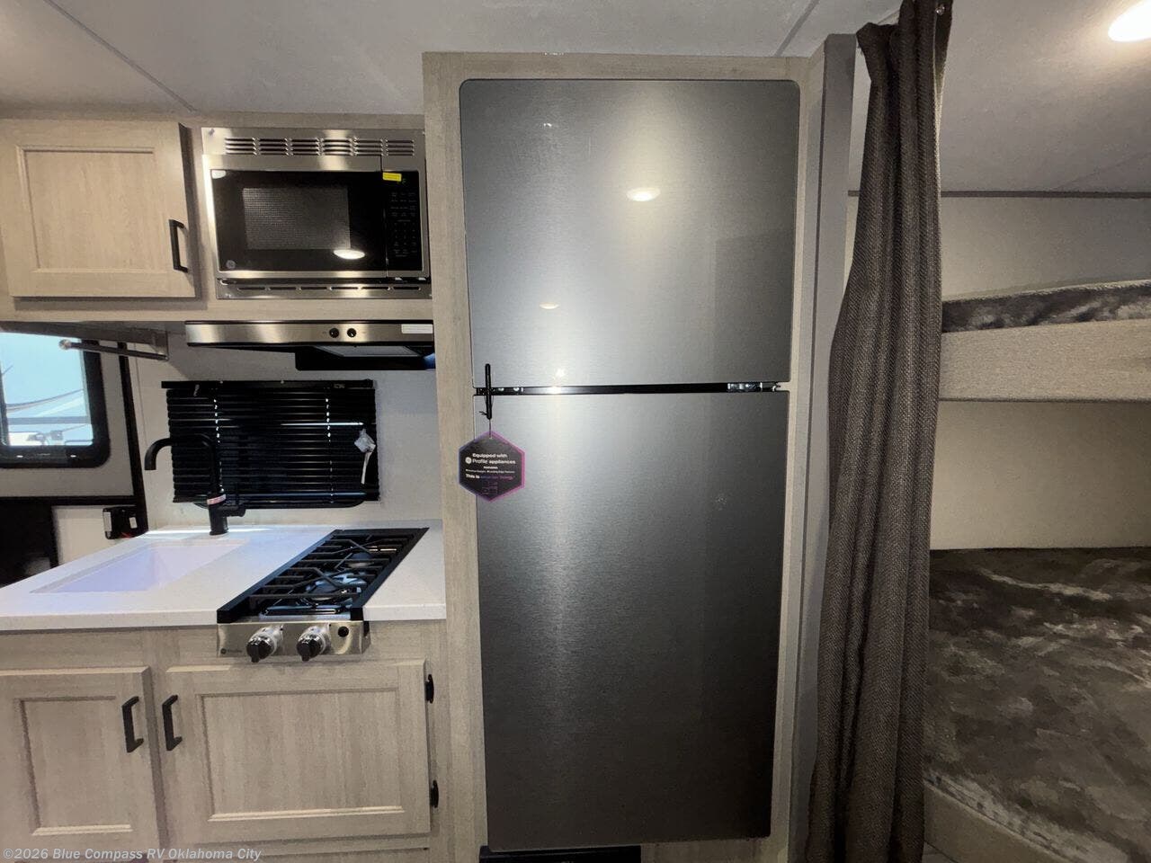 Your family or group will have a fun time camping in this travel trailer! The front Murphy bed provides versatility with a sofa to sit on during the day and a 60" x 74" bed to sleep on at night. The U-shaped dinette slide creates more interior space, a comfortable place to eat, and even an extra sleeping space for a guest or two depending on their sizes. The 46" x 74" double-size bunk beds are also a comfortable place to rest, and they are conveniently next to the rear corner bathroom. If you wish to cook out in the great outdoors then add the optional camper kitchen which comes with a cabinet, a refrigerator, and a pull out griddle!