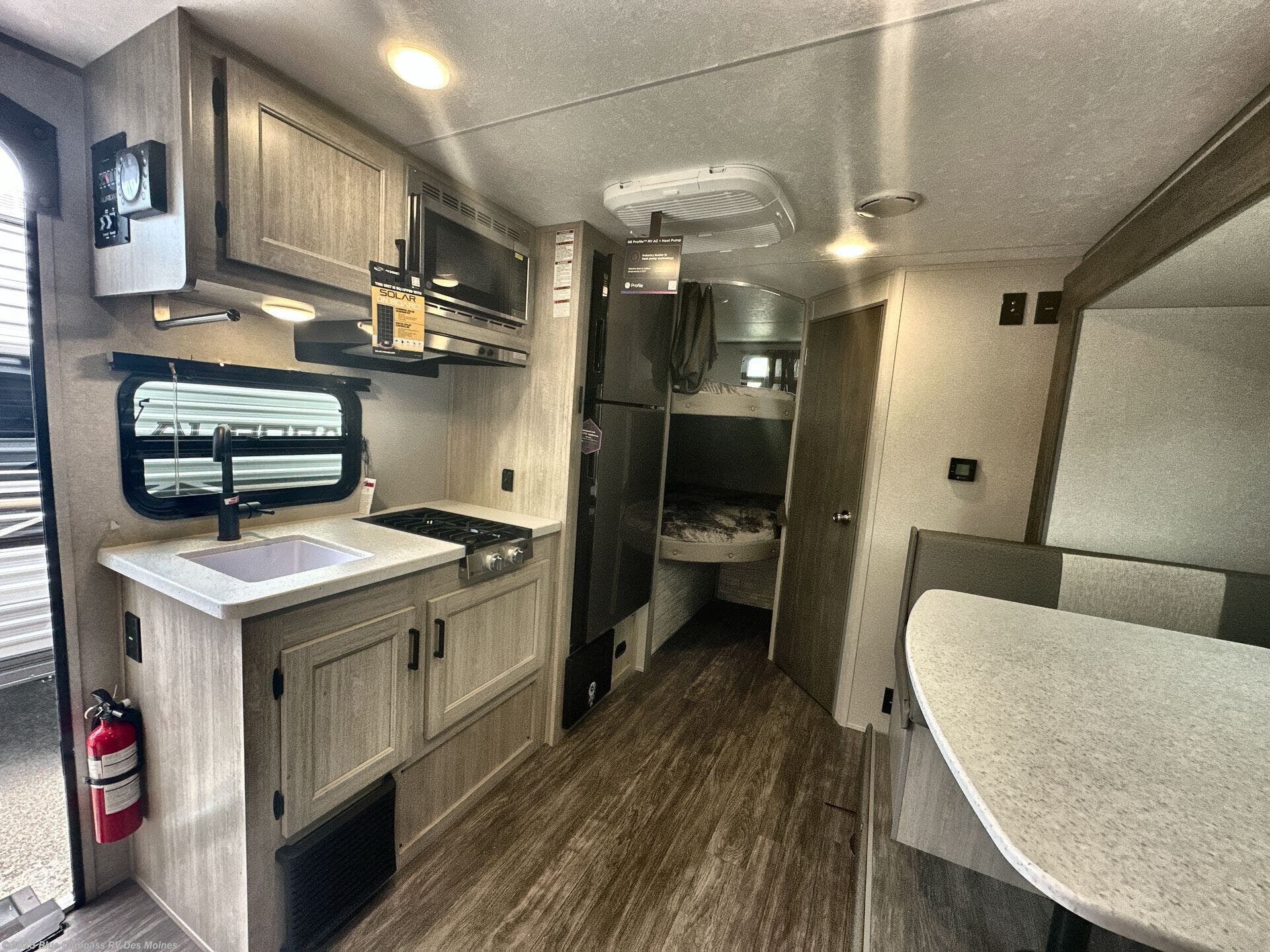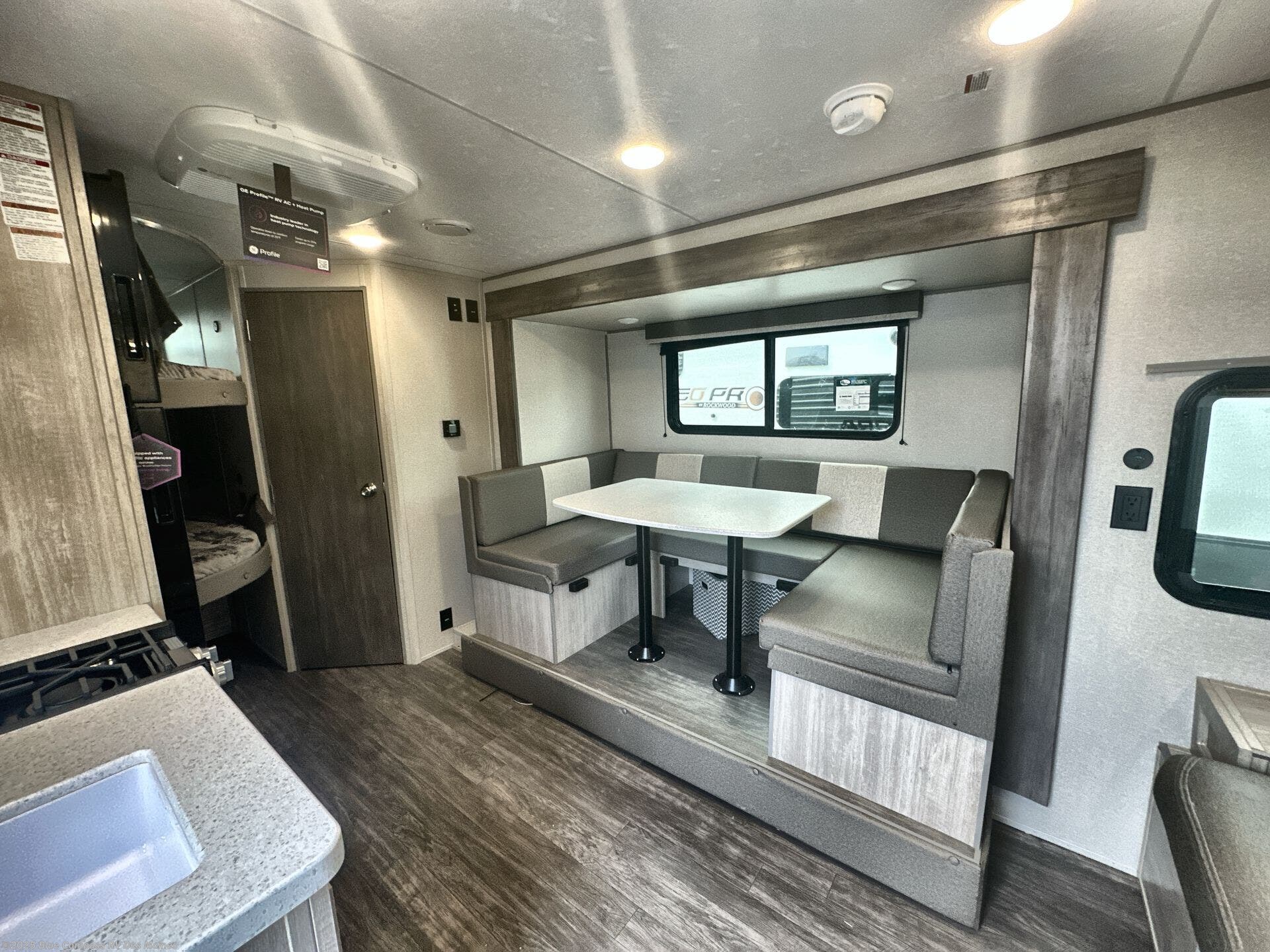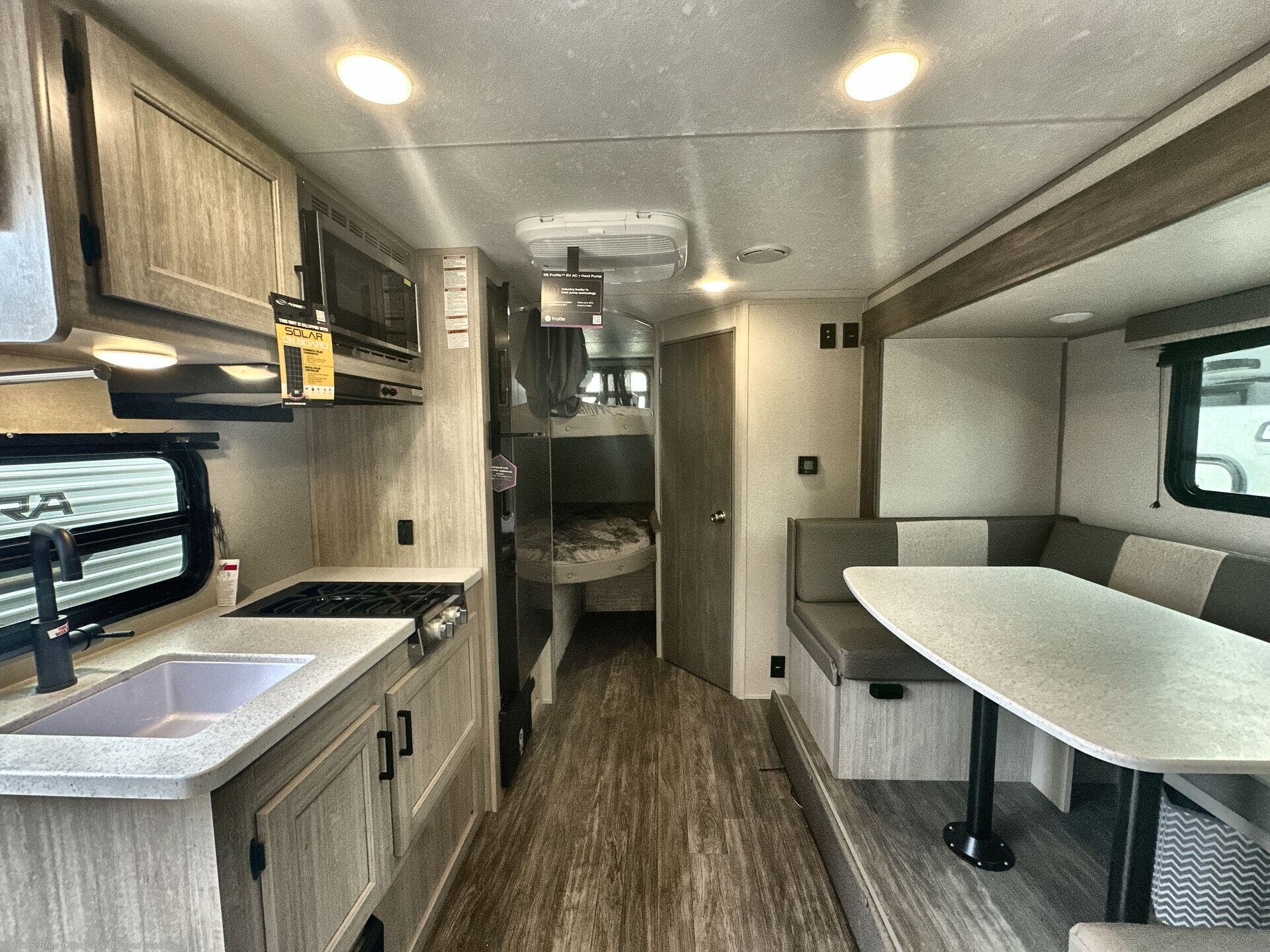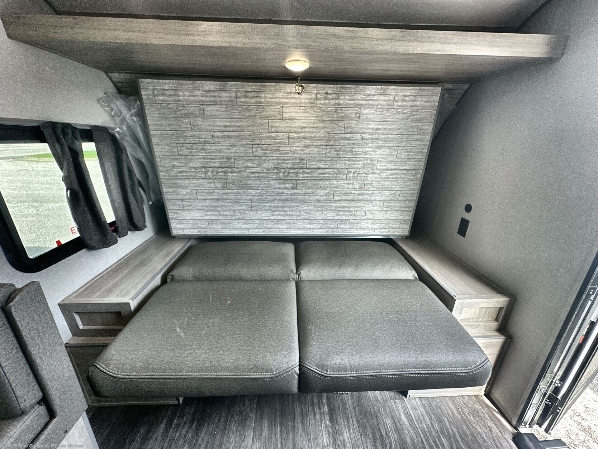 Your family or group will have a fun time camping in this travel trailer! The front Murphy bed provides versatility with a sofa to sit on during the day and a 60" x 74" bed to sleep on at night. The U-shaped dinette slide creates more interior space, a comfortable place to eat, and even an extra sleeping space for a guest or two depending on their sizes. The 46" x 74" double-size bunk beds are also a comfortable place to rest, and they are conveniently next to the rear corner bathroom. If you wish to cook out in the great outdoors then add the optional camper kitchen which comes with a cabinet, a refrigerator, and a pull out griddle!