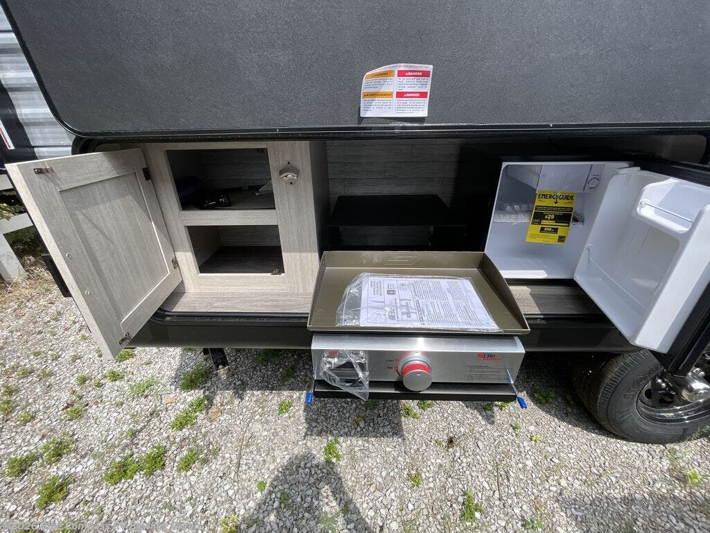 Your family or group will have a fun time camping in this travel trailer! The front Murphy bed provides versatility with a sofa to sit on during the day and a 60" x 74" bed to sleep on at night. The U-shaped dinette slide creates more interior space, a comfortable place to eat, and even an extra sleeping space for a guest or two depending on their sizes. The 46" x 74" double-size bunk beds are also a comfortable place to rest, and they are conveniently next to the rear corner bathroom. If you wish to cook out in the great outdoors then add the optional camper kitchen which comes with a cabinet, a refrigerator, and a pull out griddle!