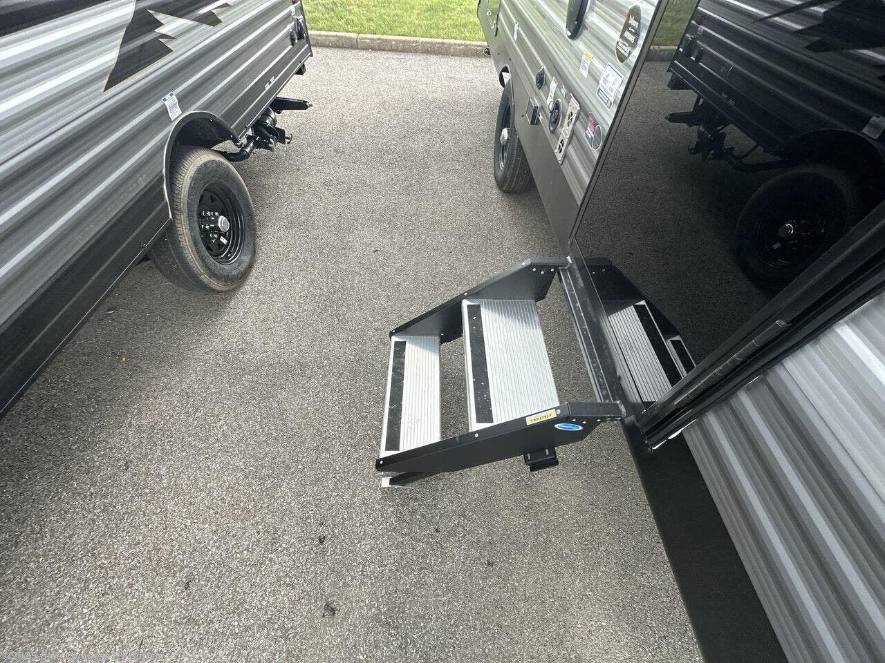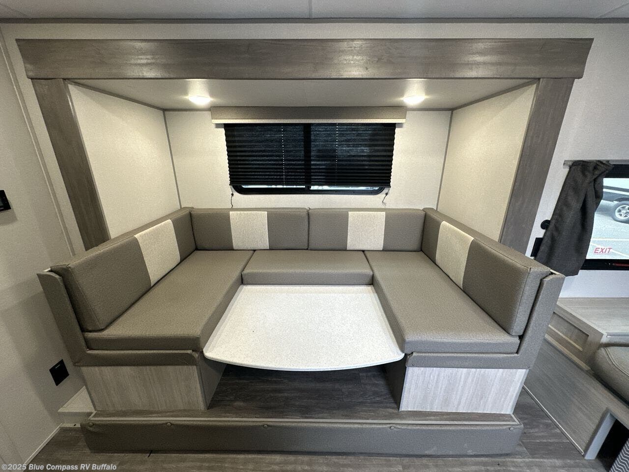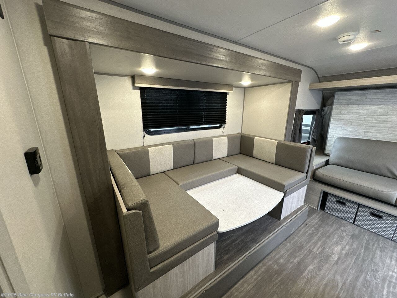 Your family or group will have a fun time camping in this travel trailer! The front Murphy bed provides versatility with a sofa to sit on during the day and a 60" x 74" bed to sleep on at night. The U-shaped dinette slide creates more interior space, a comfortable place to eat, and even an extra sleeping space for a guest or two depending on their sizes. The 46" x 74" double-size bunk beds are also a comfortable place to rest, and they are conveniently next to the rear corner bathroom. If you wish to cook out in the great outdoors then add the optional camper kitchen which comes with a cabinet, a refrigerator, and a pull out griddle!