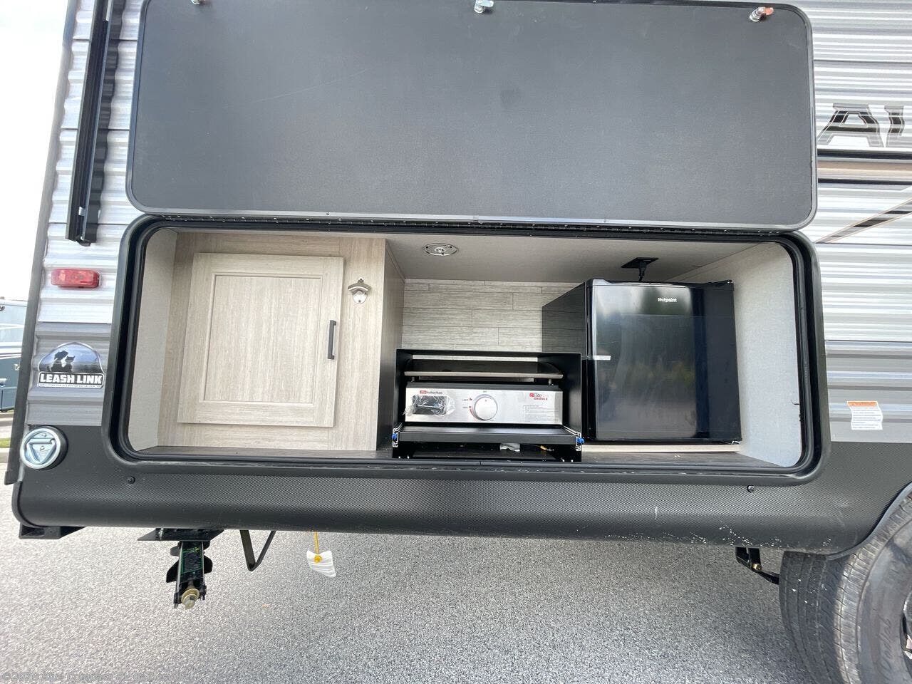 Comfortability, usability, and quality is what you will find in each one of these Forest River Aurora Light travel trailers! They are designed with a superior build and packed full with industry leading, functional, and distinctive standard features. The diamond plate rock guard will protect your unit from road debris and the nitrogen filled radial tires, which keep their pressure longer, offer better fuel economy. You will also find upgraded JBL Elite exterior speaker outside, an electric awning with multicolor lights and remote, plus flush mount baggage doors for easy packing. The interiors are beautifully designed with matte black kitchen and bath faucets, black nightshades in the living room, and GE kitchen appliances!
