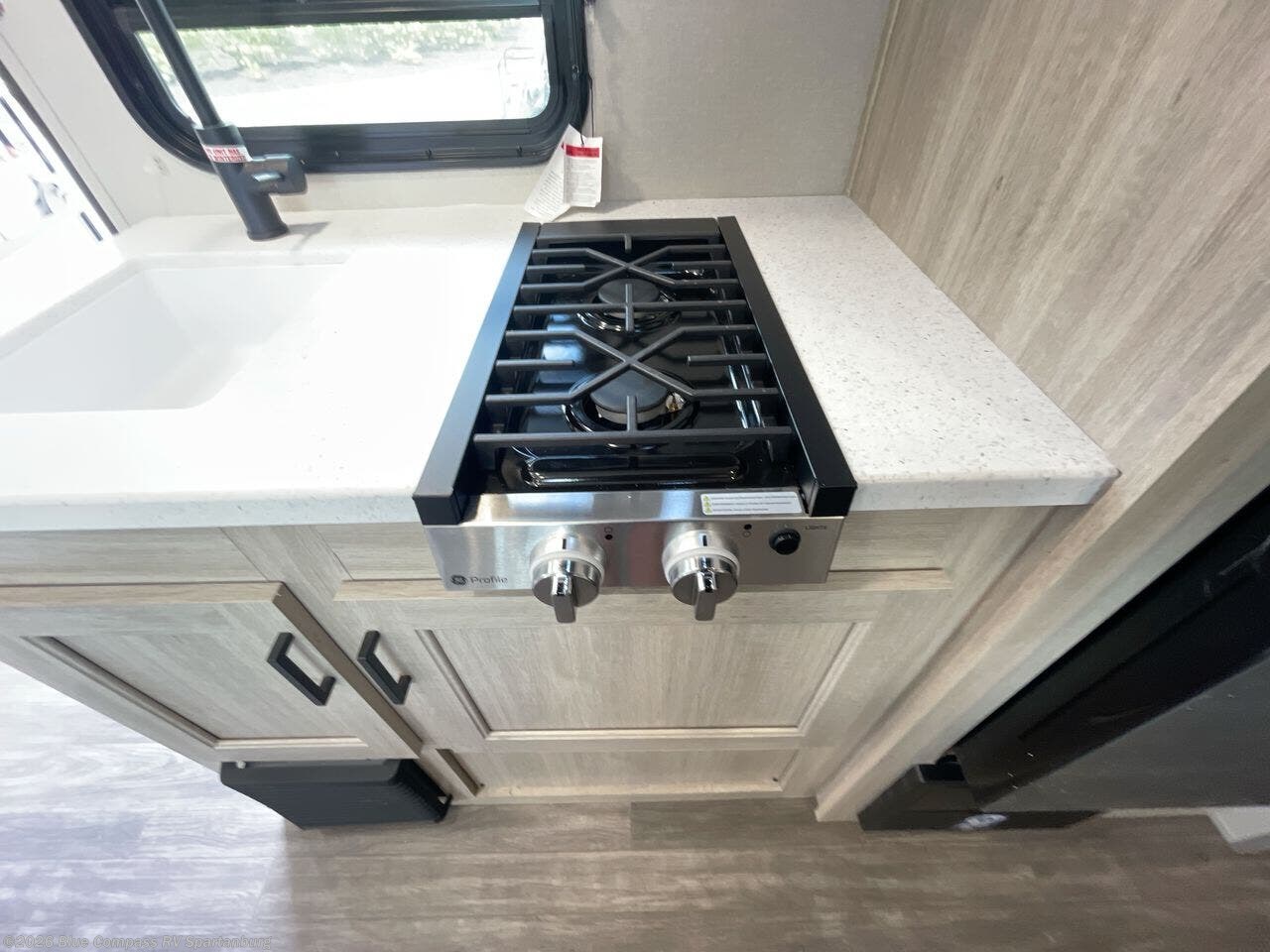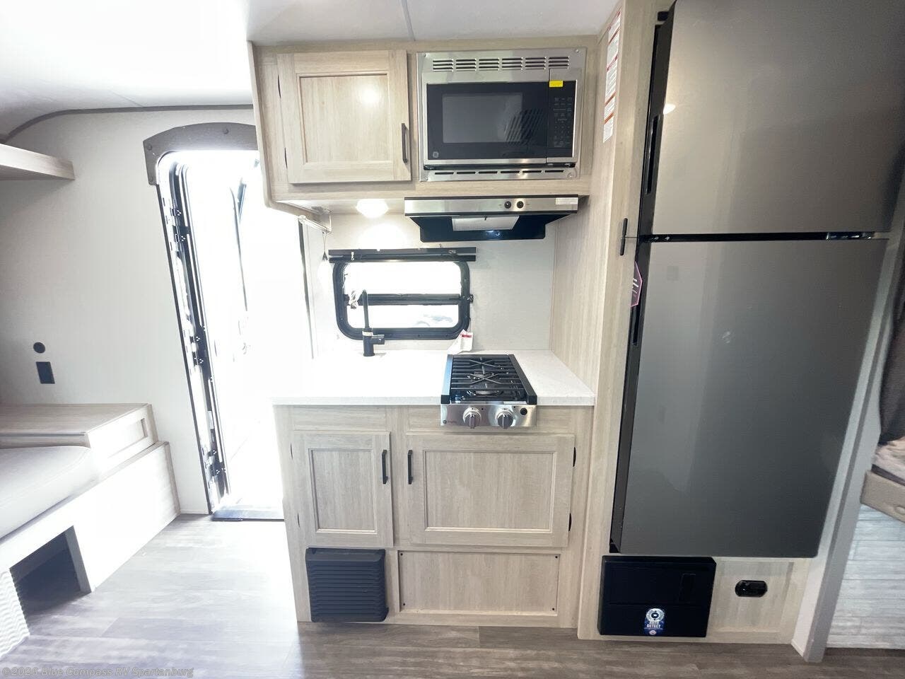 Your family or group will have a fun time camping in this travel trailer! The front Murphy bed provides versatility with a sofa to sit on during the day and a 60" x 74" bed to sleep on at night. The U-shaped dinette slide creates more interior space, a comfortable place to eat, and even an extra sleeping space for a guest or two depending on their sizes. The 46" x 74" double-size bunk beds are also a comfortable place to rest, and they are conveniently next to the rear corner bathroom. If you wish to cook out in the great outdoors then add the optional camper kitchen which comes with a cabinet, a refrigerator, and a pull out griddle!