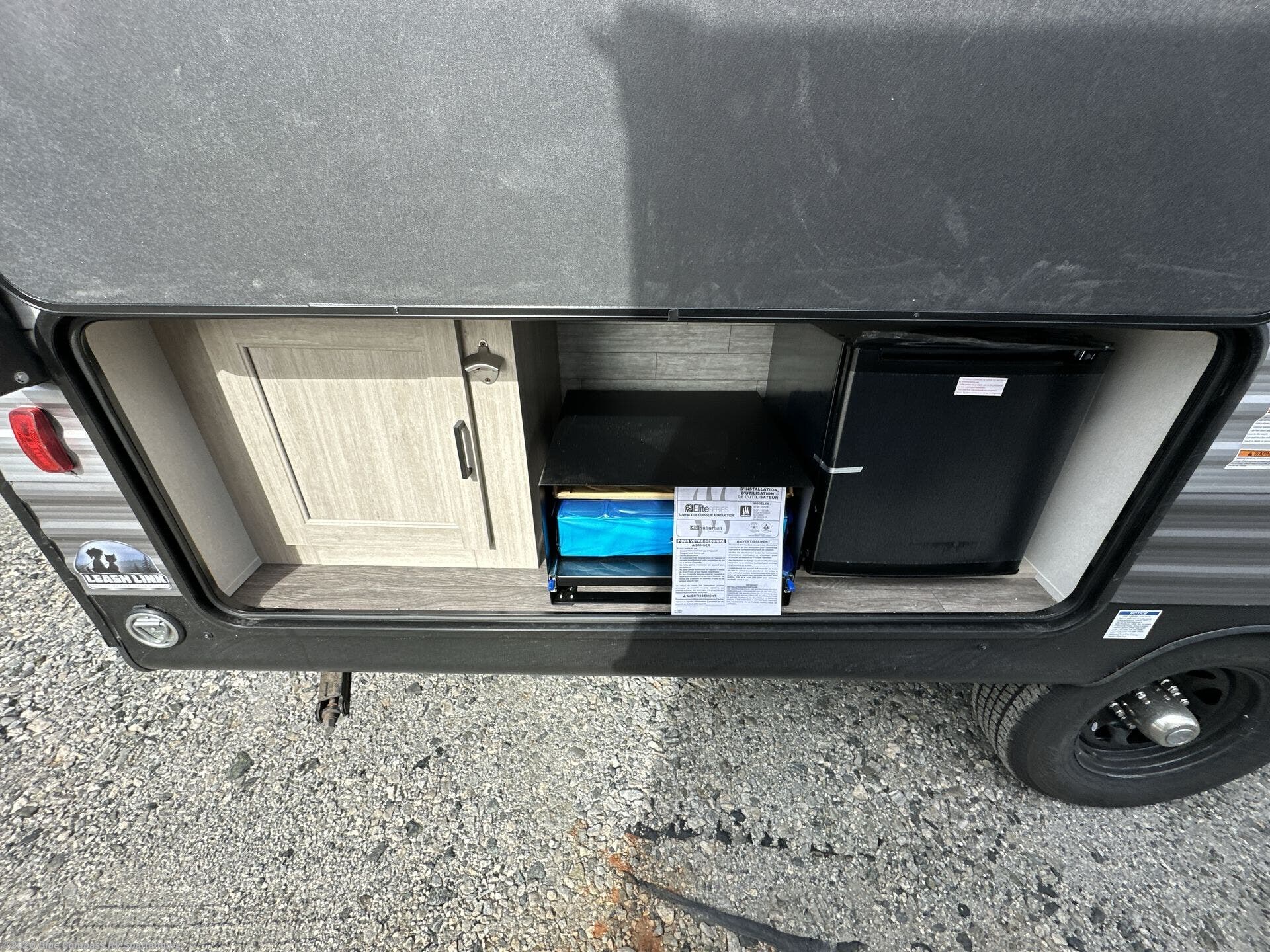 Your family or group will have a fun time camping in this travel trailer! The front Murphy bed provides versatility with a sofa to sit on during the day and a 60" x 74" bed to sleep on at night. The U-shaped dinette slide creates more interior space, a comfortable place to eat, and even an extra sleeping space for a guest or two depending on their sizes. The 46" x 74" double-size bunk beds are also a comfortable place to rest, and they are conveniently next to the rear corner bathroom. If you wish to cook out in the great outdoors then add the optional camper kitchen which comes with a cabinet, a refrigerator, and a pull out griddle!