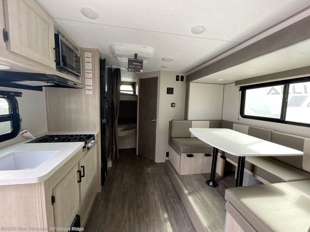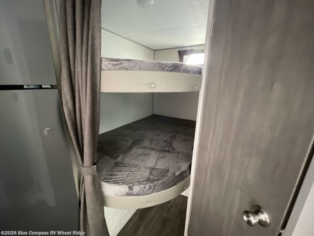 This travel trailer is ideal for anyone seeking a comfortable, stress-free getaway. Gather around the U-shaped dinette for meals, games, or movie nights – it's the perfect spot to make memories with loved ones. You can unwind in the full bathroom, complete with a tub/shower combo, or catch some Z's on the double-size bunk beds, perfect for kids or guests. The kitchen is equipped with a refrigerator, microwave, and sink, making it easy to whip up meals on the go. Overhead cabinets provide ample storage for your culinary needs. Finally, drift off to sleep under the stars, feeling refreshed and rejuvenated in the comfy queen bed surrounded by storage galore for your belongings.