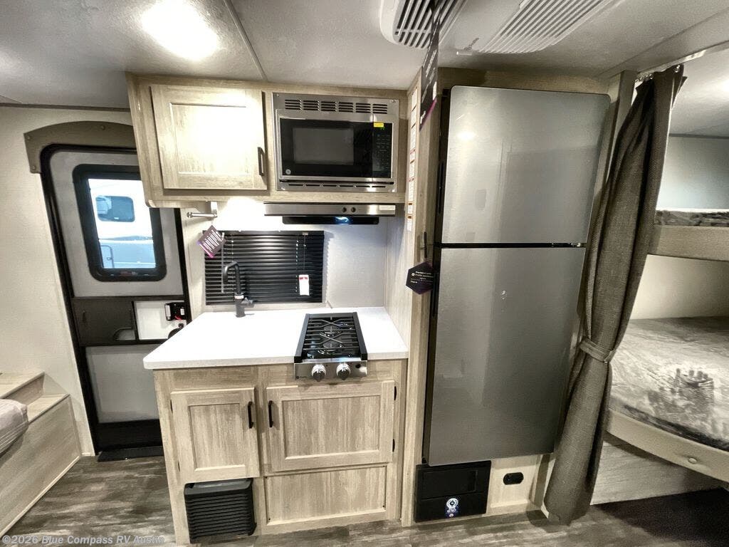 This travel trailer is ideal for anyone seeking a comfortable, stress-free getaway. Gather around the U-shaped dinette for meals, games, or movie nights – it's the perfect spot to make memories with loved ones. You can unwind in the full bathroom, complete with a tub/shower combo, or catch some Z's on the double-size bunk beds, perfect for kids or guests. The kitchen is equipped with a refrigerator, microwave, and sink, making it easy to whip up meals on the go. Overhead cabinets provide ample storage for your culinary needs. Finally, drift off to sleep under the stars, feeling refreshed and rejuvenated in the comfy queen bed surrounded by storage galore for your belongings.