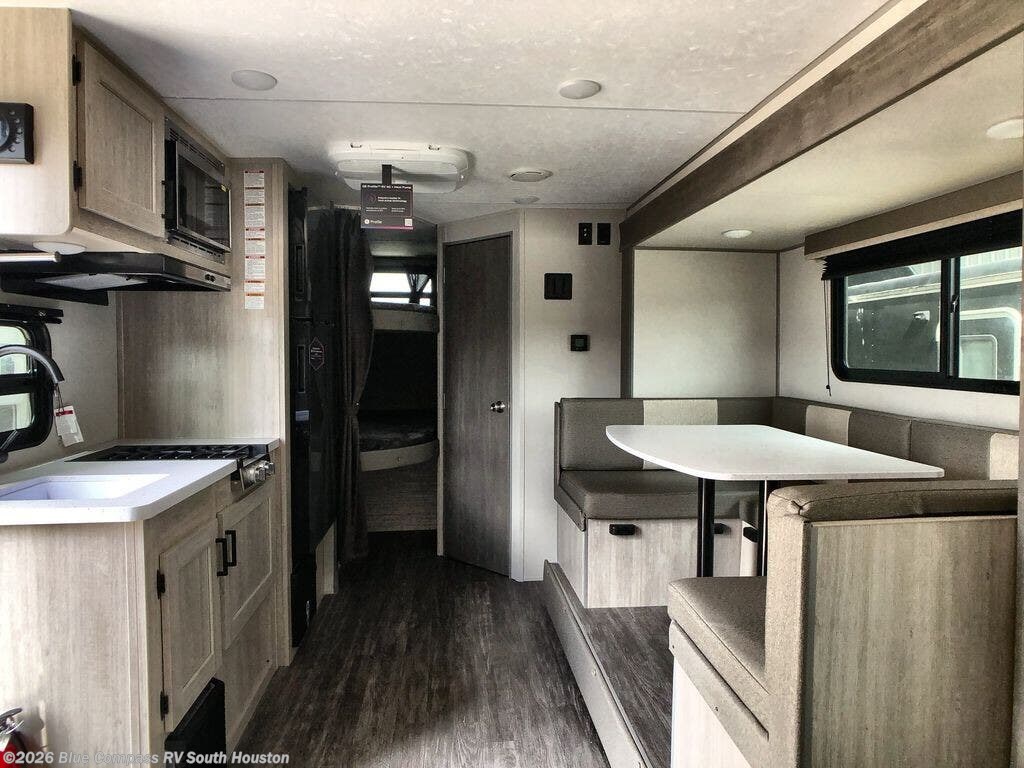 This travel trailer is ideal for anyone seeking a comfortable, stress-free getaway. Gather around the U-shaped dinette for meals, games, or movie nights – it's the perfect spot to make memories with loved ones. You can unwind in the full bathroom, complete with a tub/shower combo, or catch some Z's on the double-size bunk beds, perfect for kids or guests. The kitchen is equipped with a refrigerator, microwave, and sink, making it easy to whip up meals on the go. Overhead cabinets provide ample storage for your culinary needs. Finally, drift off to sleep under the stars, feeling refreshed and rejuvenated in the comfy queen bed surrounded by storage galore for your belongings.