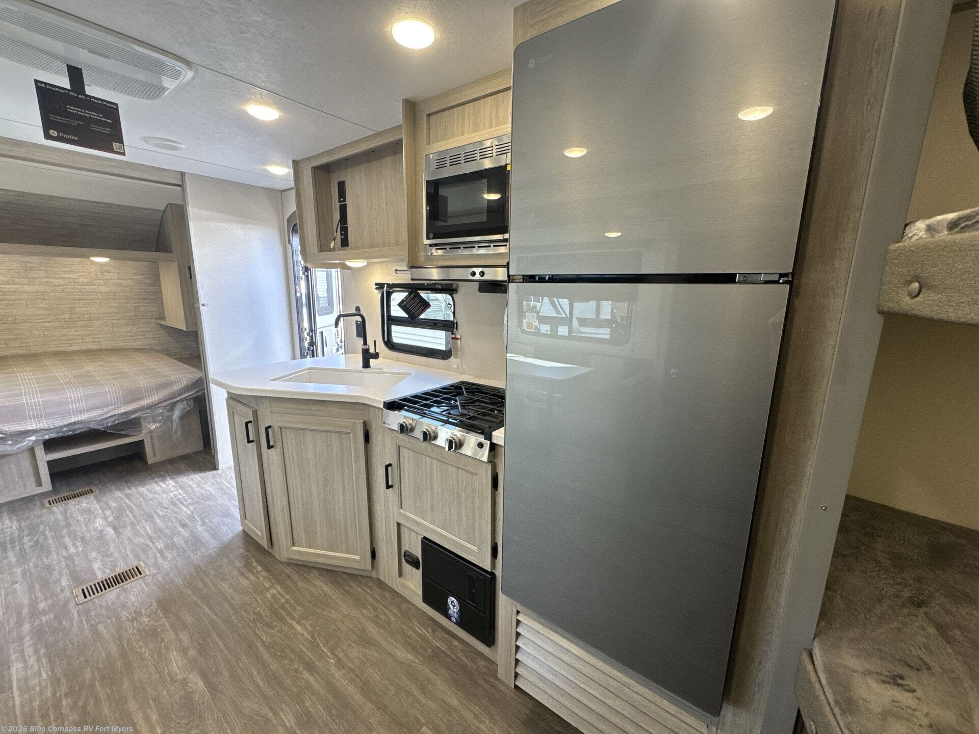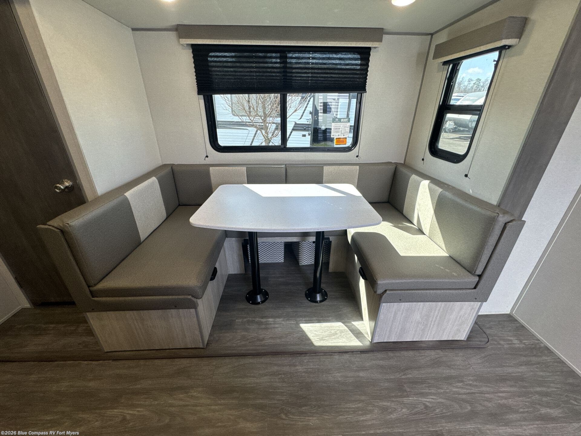 Find your happy place in this charming travel trailer, where comfort and adventure blend seamlessly! This unit’s booth dinette is a warm and inviting space for meals, games, or movie nights, and the theater seating is the perfect spot to relax and enjoy some downtime. In the rear area of this unit, the kitchen offers a refrigerator, a two-burner cooktop, and a sink, while the full bathroom features a spa-like oasis, perfect for unwinding after a day of exploring. Additionally, the queen bed serves as a cozy sanctuary, surrounded by wardrobes and shelves for storing your belongings.