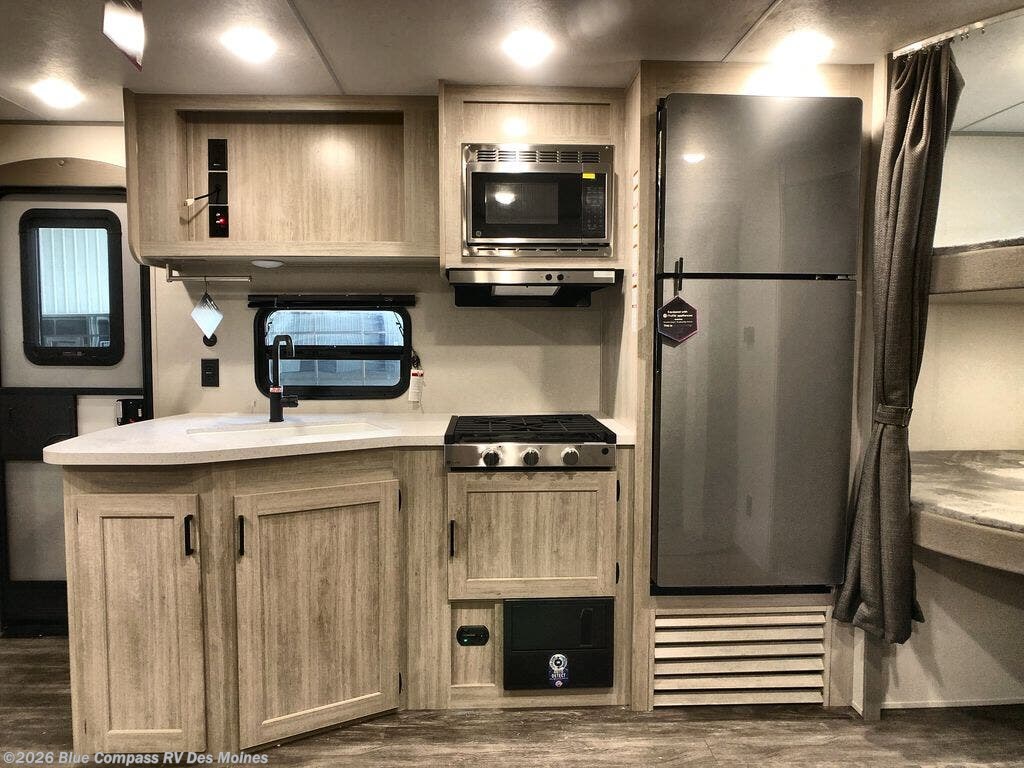 Find your happy place in this charming travel trailer, where comfort and adventure blend seamlessly! This unit’s booth dinette is a warm and inviting space for meals, games, or movie nights, and the theater seating is the perfect spot to relax and enjoy some downtime. In the rear area of this unit, the kitchen offers a refrigerator, a two-burner cooktop, and a sink, while the full bathroom features a spa-like oasis, perfect for unwinding after a day of exploring. Additionally, the queen bed serves as a cozy sanctuary, surrounded by wardrobes and shelves for storing your belongings.
