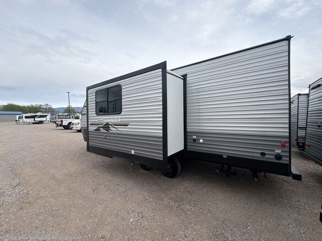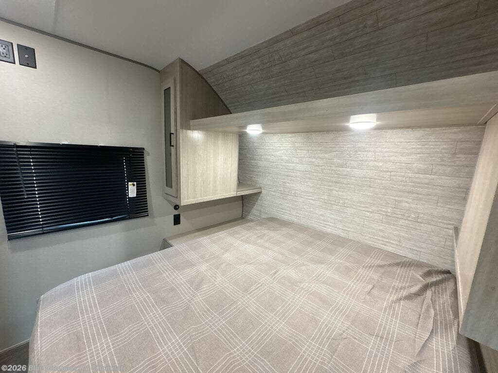 Find your happy place in this charming travel trailer, where comfort and adventure blend seamlessly! This unit’s booth dinette is a warm and inviting space for meals, games, or movie nights, and the theater seating is the perfect spot to relax and enjoy some downtime. In the rear area of this unit, the kitchen offers a refrigerator, a two-burner cooktop, and a sink, while the full bathroom features a spa-like oasis, perfect for unwinding after a day of exploring. Additionally, the queen bed serves as a cozy sanctuary, surrounded by wardrobes and shelves for storing your belongings.