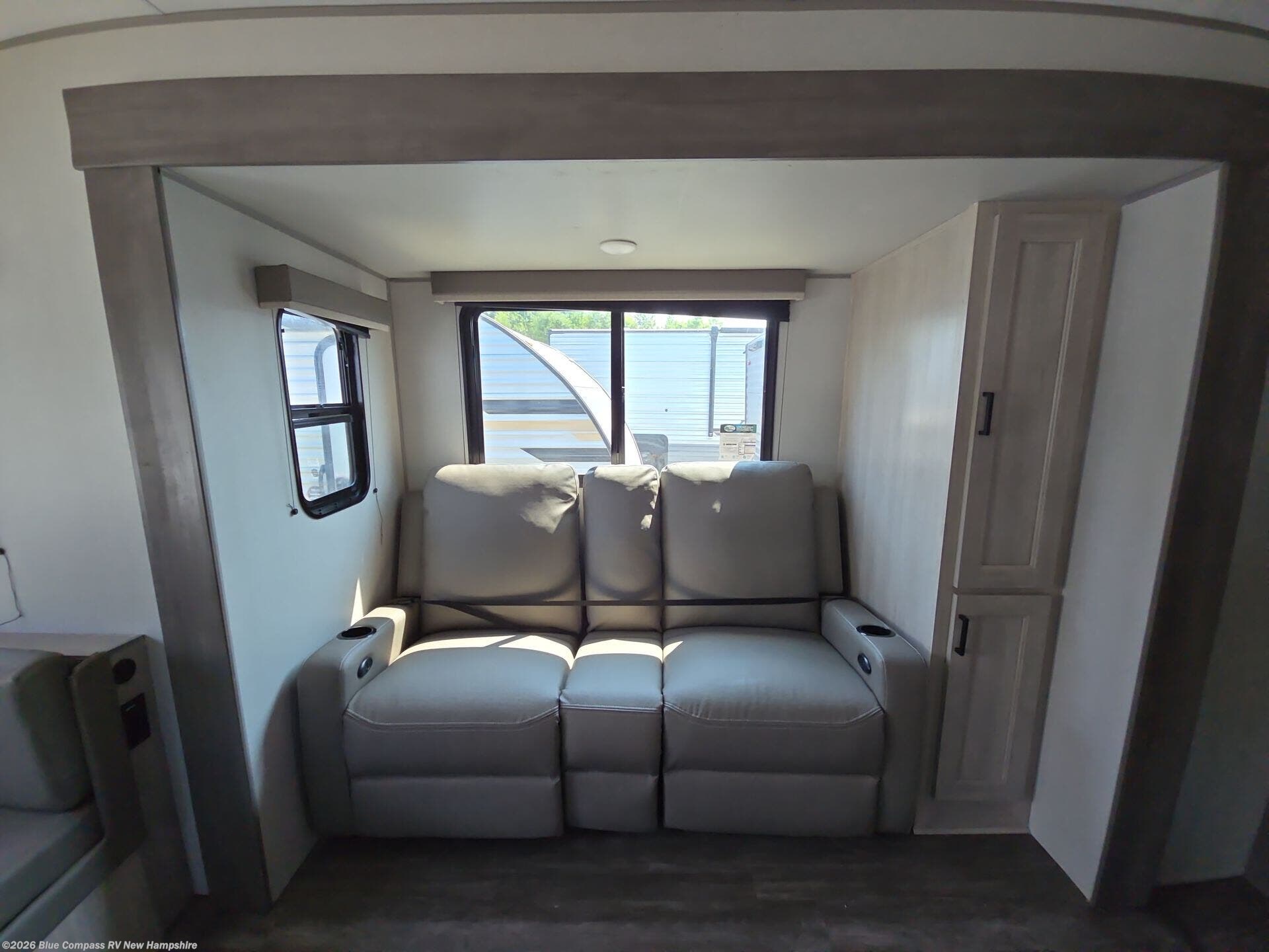 Pack your bags and head to your favorite camping spot with this travel trailer in tow! You can relax on the theater seating slide, dine around the rear U-shaped dinette, or visit outdoors under the 18' power awning. There is also a pass-thru storage outside to bring along fishing poles, camp chairs, and yard games. A full kitchen includes a three burner gas range and microwave oven, along with a 10.7 cu. ft. 12V refrigerator and pantry for food storage. The walk-thru bath will create a front master bedroom you are sure to love, especially with its queen bed, dual bedside wardrobes and an overhead shelf for storage!