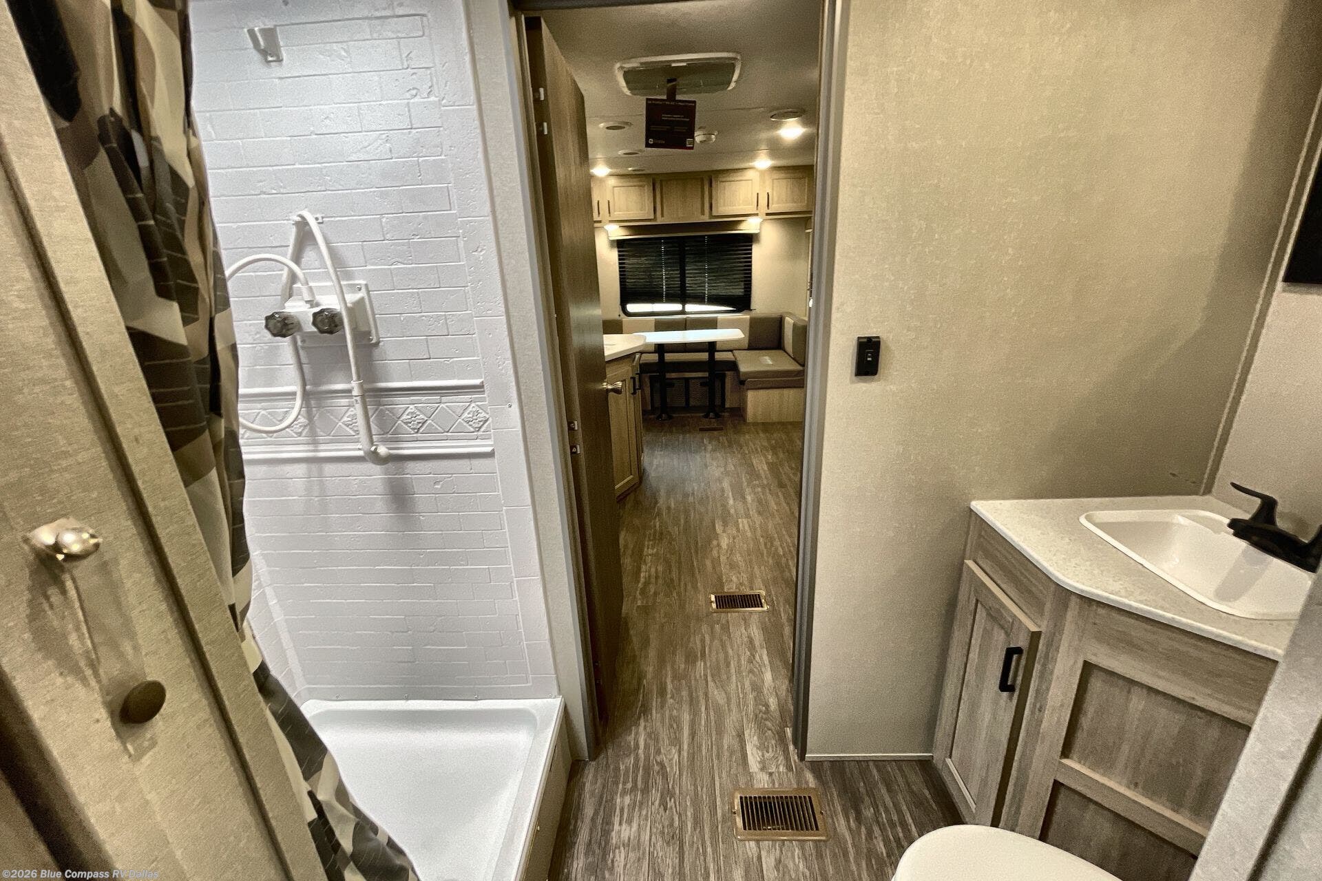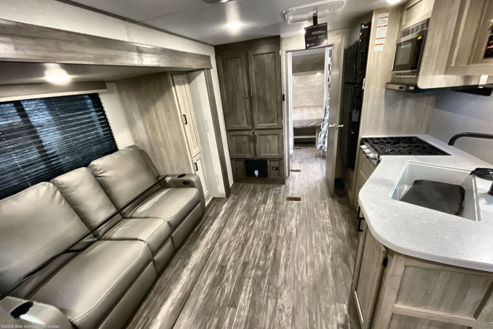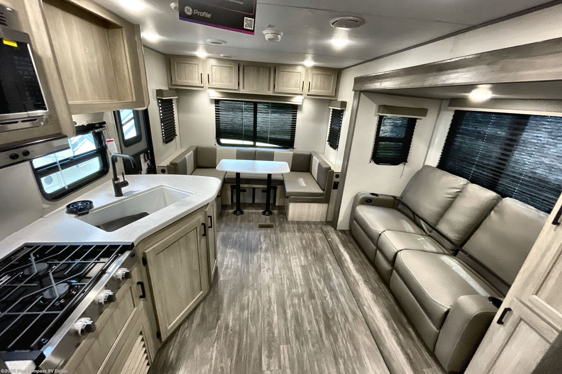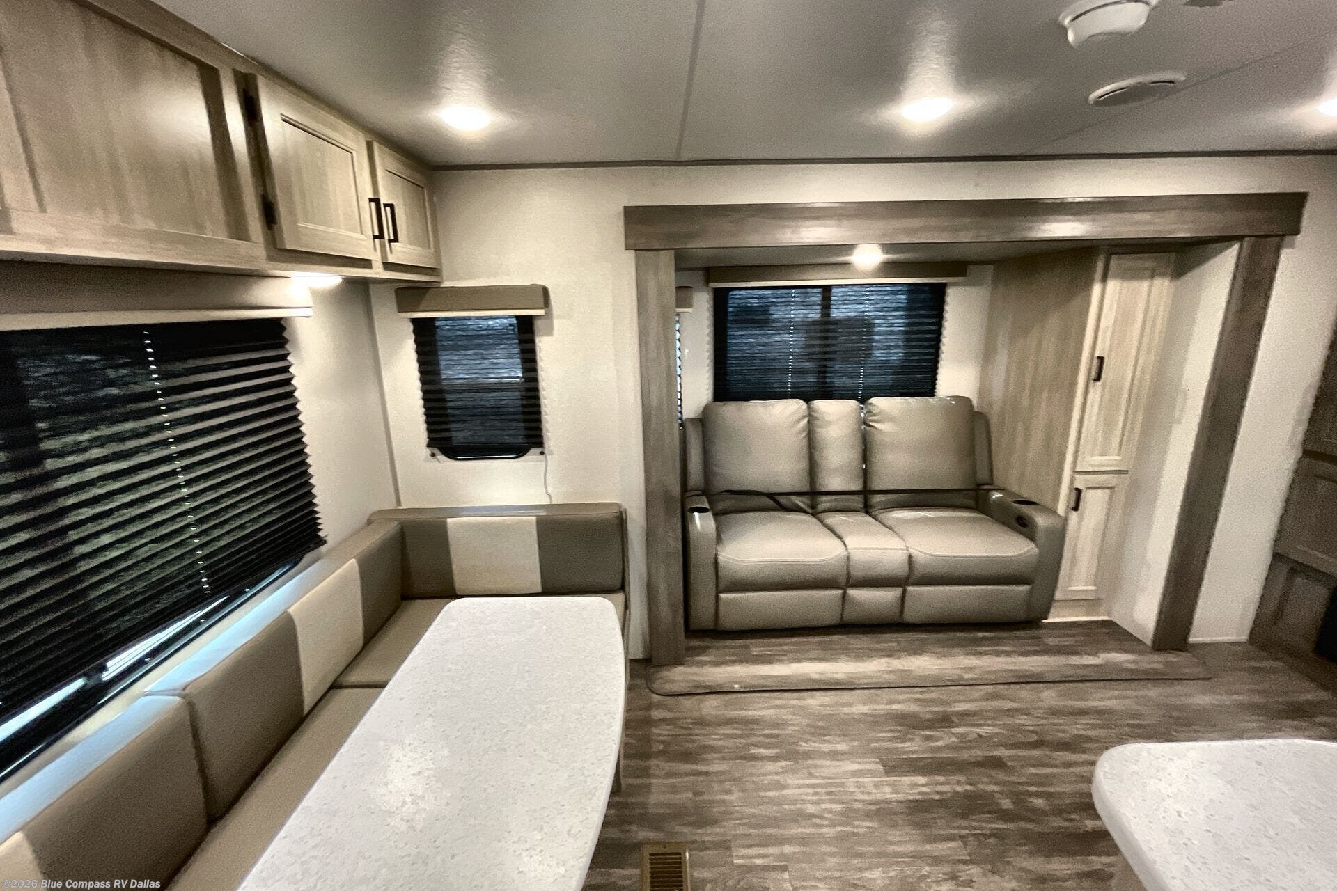 Pack your bags and head to your favorite camping spot with this travel trailer in tow! You can relax on the theater seating slide, dine around the rear U-shaped dinette, or visit outdoors under the 18' power awning. There is also a pass-thru storage outside to bring along fishing poles, camp chairs, and yard games. A full kitchen includes a three burner gas range and microwave oven, along with a 10.7 cu. ft. 12V refrigerator and pantry for food storage. The walk-thru bath will create a front master bedroom you are sure to love, especially with its queen bed, dual bedside wardrobes and an overhead shelf for storage!