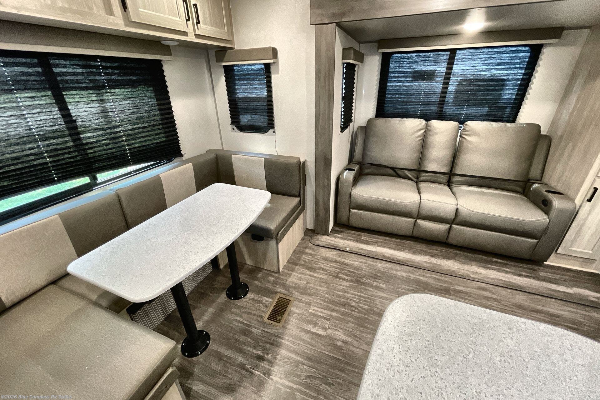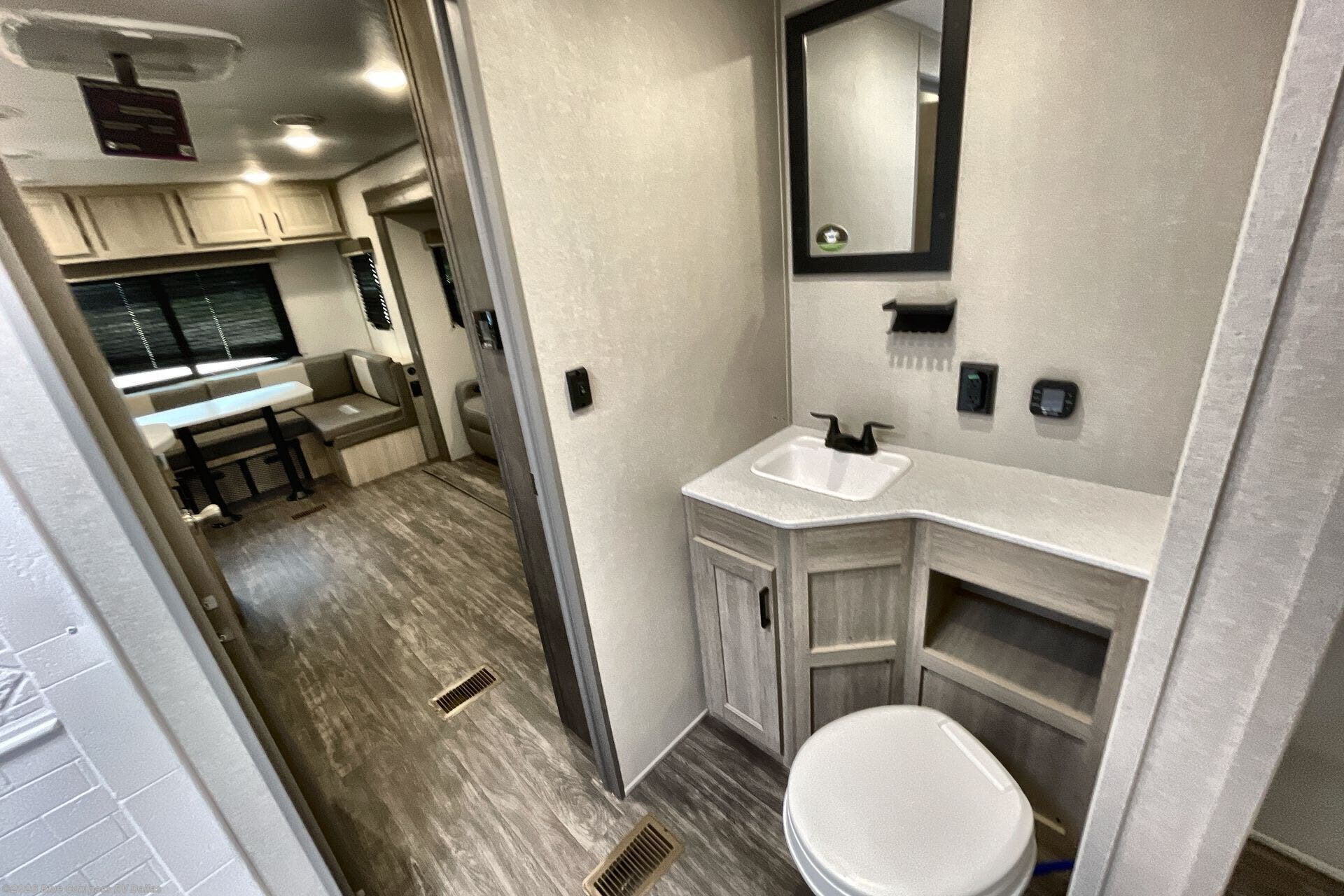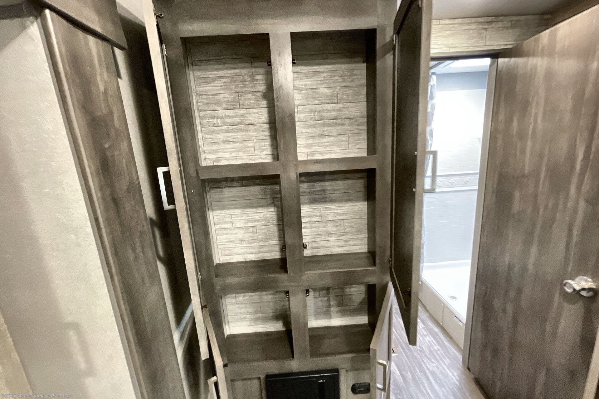 Pack your bags and head to your favorite camping spot with this travel trailer in tow! You can relax on the theater seating slide, dine around the rear U-shaped dinette, or visit outdoors under the 18' power awning. There is also a pass-thru storage outside to bring along fishing poles, camp chairs, and yard games. A full kitchen includes a three burner gas range and microwave oven, along with a 10.7 cu. ft. 12V refrigerator and pantry for food storage. The walk-thru bath will create a front master bedroom you are sure to love, especially with its queen bed, dual bedside wardrobes and an overhead shelf for storage!