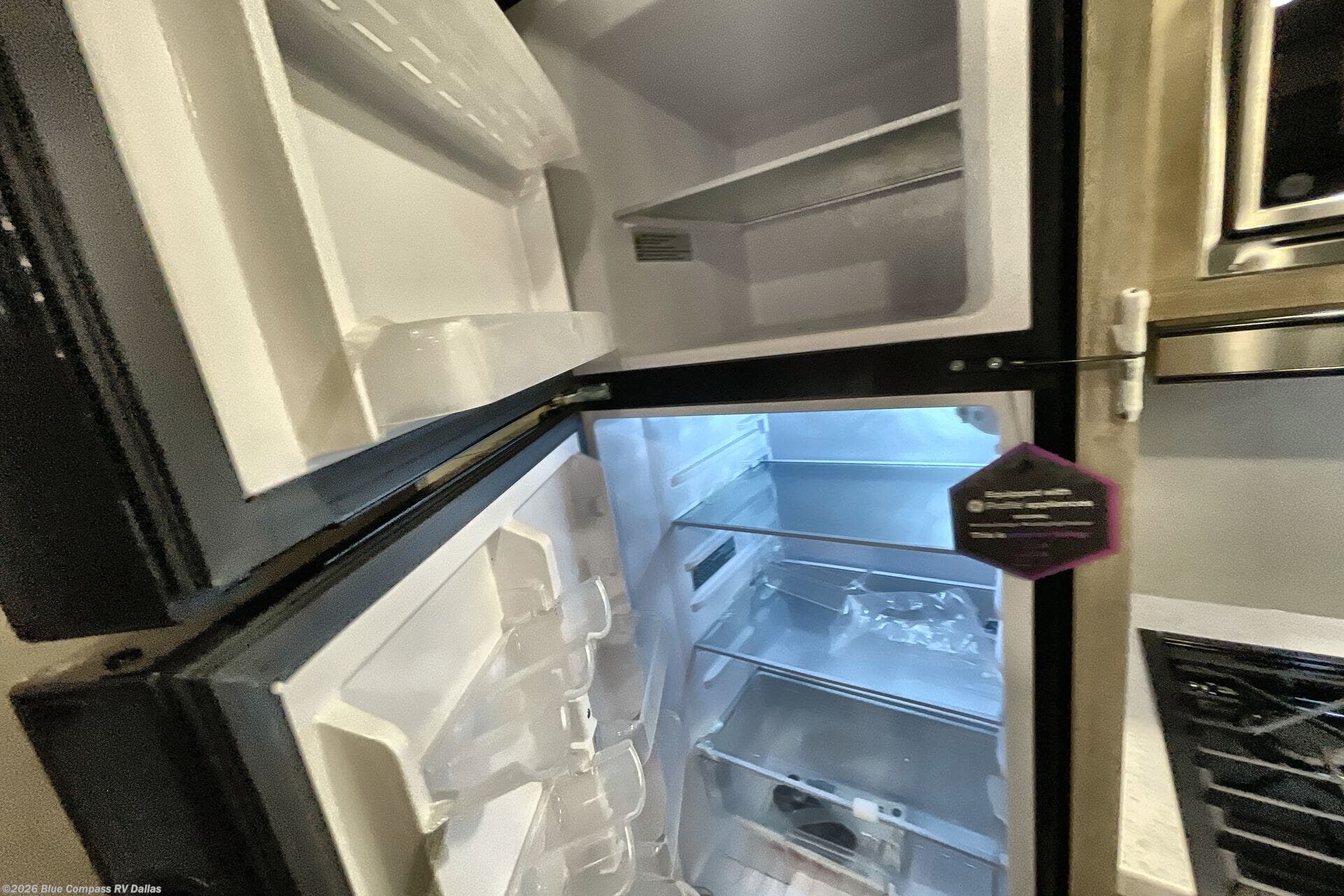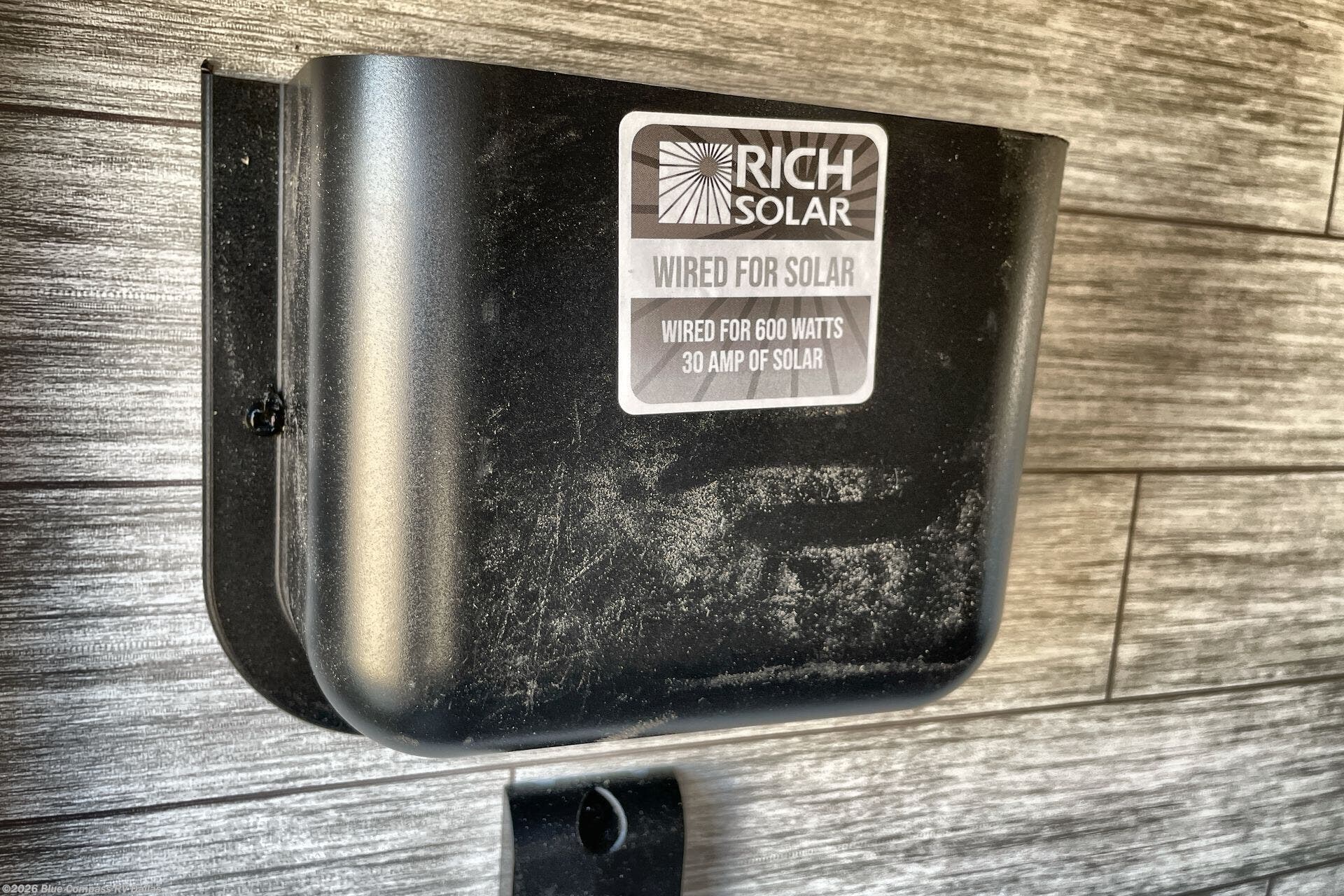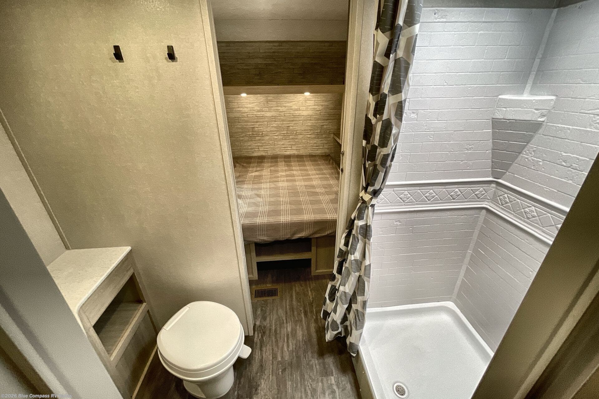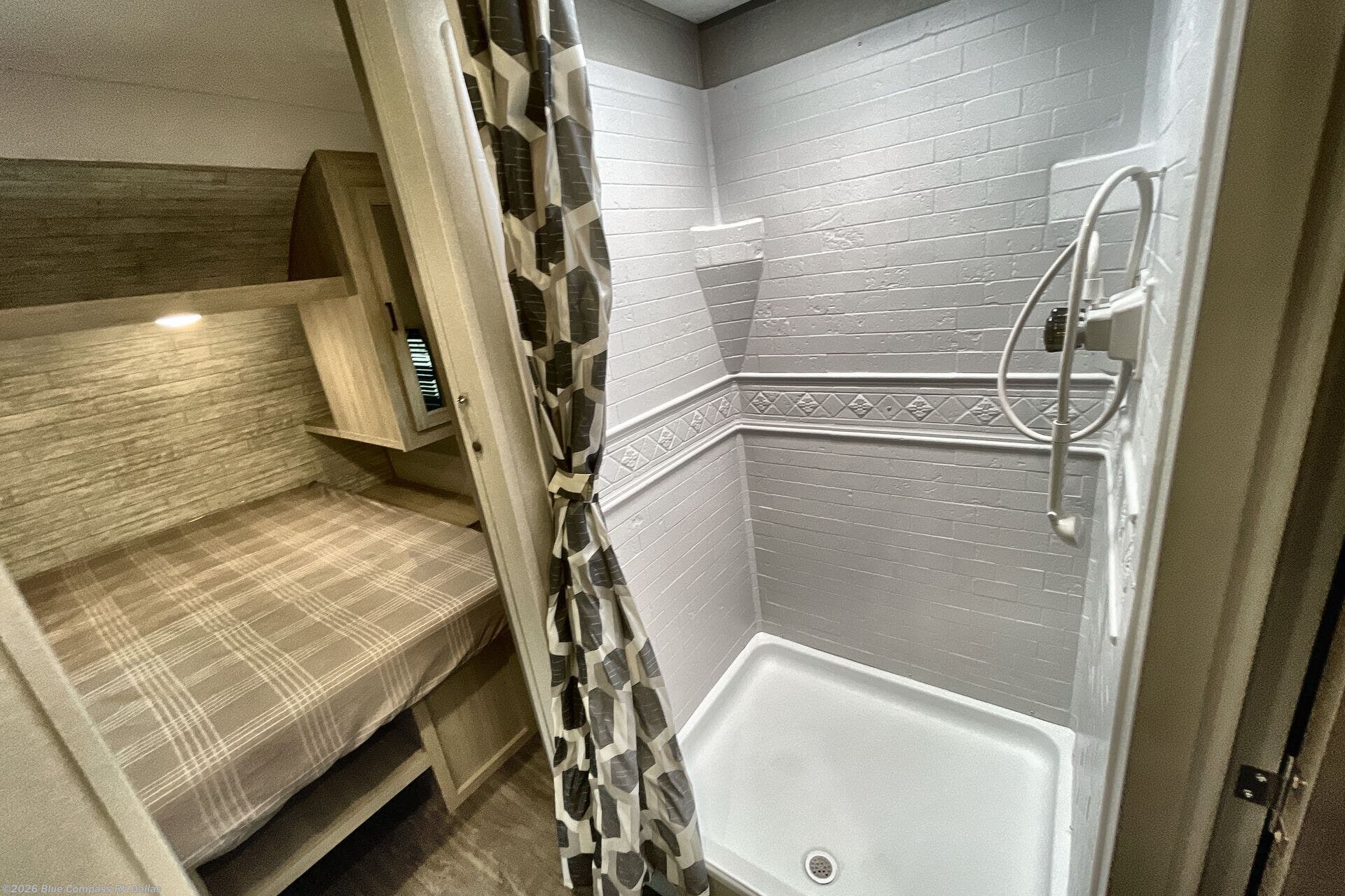 Pack your bags and head to your favorite camping spot with this travel trailer in tow! You can relax on the theater seating slide, dine around the rear U-shaped dinette, or visit outdoors under the 18' power awning. There is also a pass-thru storage outside to bring along fishing poles, camp chairs, and yard games. A full kitchen includes a three burner gas range and microwave oven, along with a 10.7 cu. ft. 12V refrigerator and pantry for food storage. The walk-thru bath will create a front master bedroom you are sure to love, especially with its queen bed, dual bedside wardrobes and an overhead shelf for storage!
