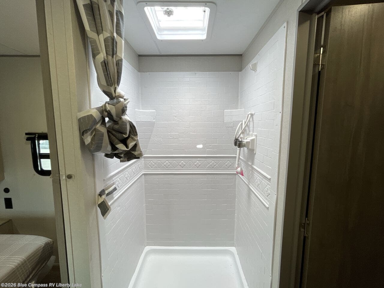 Pack your bags and head to your favorite camping spot with this travel trailer in tow! You can relax on the theater seating slide, dine around the rear U-shaped dinette, or visit outdoors under the 18' power awning. There is also a pass-thru storage outside to bring along fishing poles, camp chairs, and yard games. A full kitchen includes a three burner gas range and microwave oven, along with a 10.7 cu. ft. 12V refrigerator and pantry for food storage. The walk-thru bath will create a front master bedroom you are sure to love, especially with its queen bed, dual bedside wardrobes and an overhead shelf for storage!