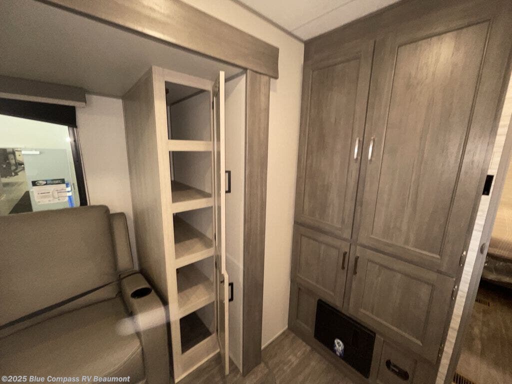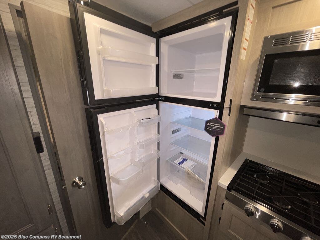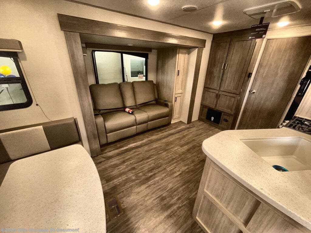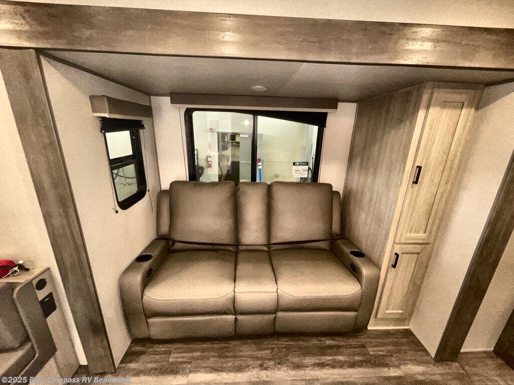 Pack your bags and head to your favorite camping spot with this travel trailer in tow! You can relax on the theater seating slide, dine around the rear U-shaped dinette, or visit outdoors under the 18' power awning. There is also a pass-thru storage outside to bring along fishing poles, camp chairs, and yard games. A full kitchen includes a three burner gas range and microwave oven, along with a 10.7 cu. ft. 12V refrigerator and pantry for food storage. The walk-thru bath will create a front master bedroom you are sure to love, especially with its queen bed, dual bedside wardrobes and an overhead shelf for storage!
