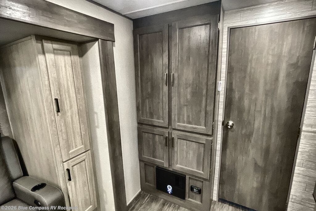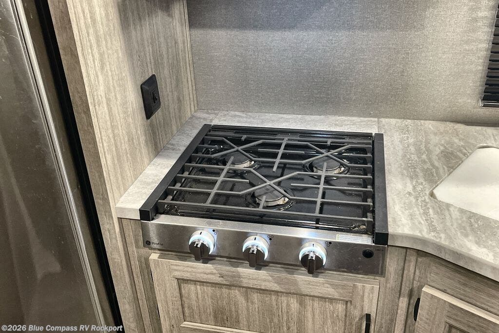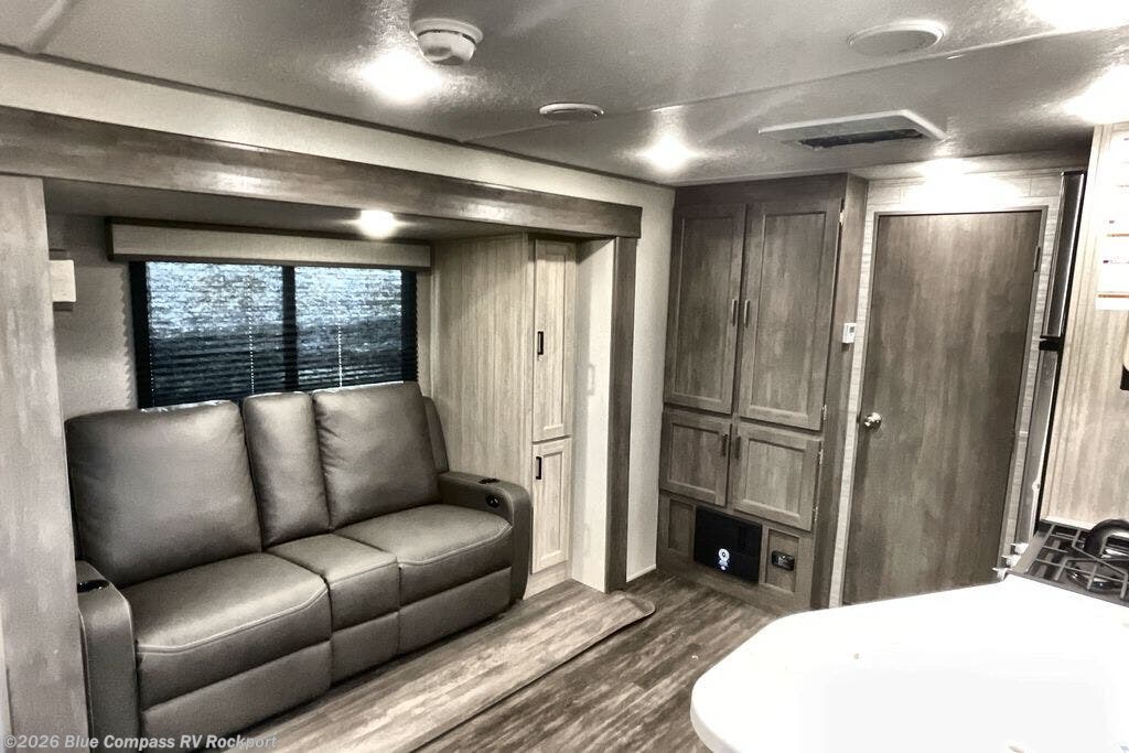 Pack your bags and head to your favorite camping spot with this travel trailer in tow! You can relax on the theater seating slide, dine around the rear U-shaped dinette, or visit outdoors under the 18' power awning. There is also a pass-thru storage outside to bring along fishing poles, camp chairs, and yard games. A full kitchen includes a three burner gas range and microwave oven, along with a 10.7 cu. ft. 12V refrigerator and pantry for food storage. The walk-thru bath will create a front master bedroom you are sure to love, especially with its queen bed, dual bedside wardrobes and an overhead shelf for storage!