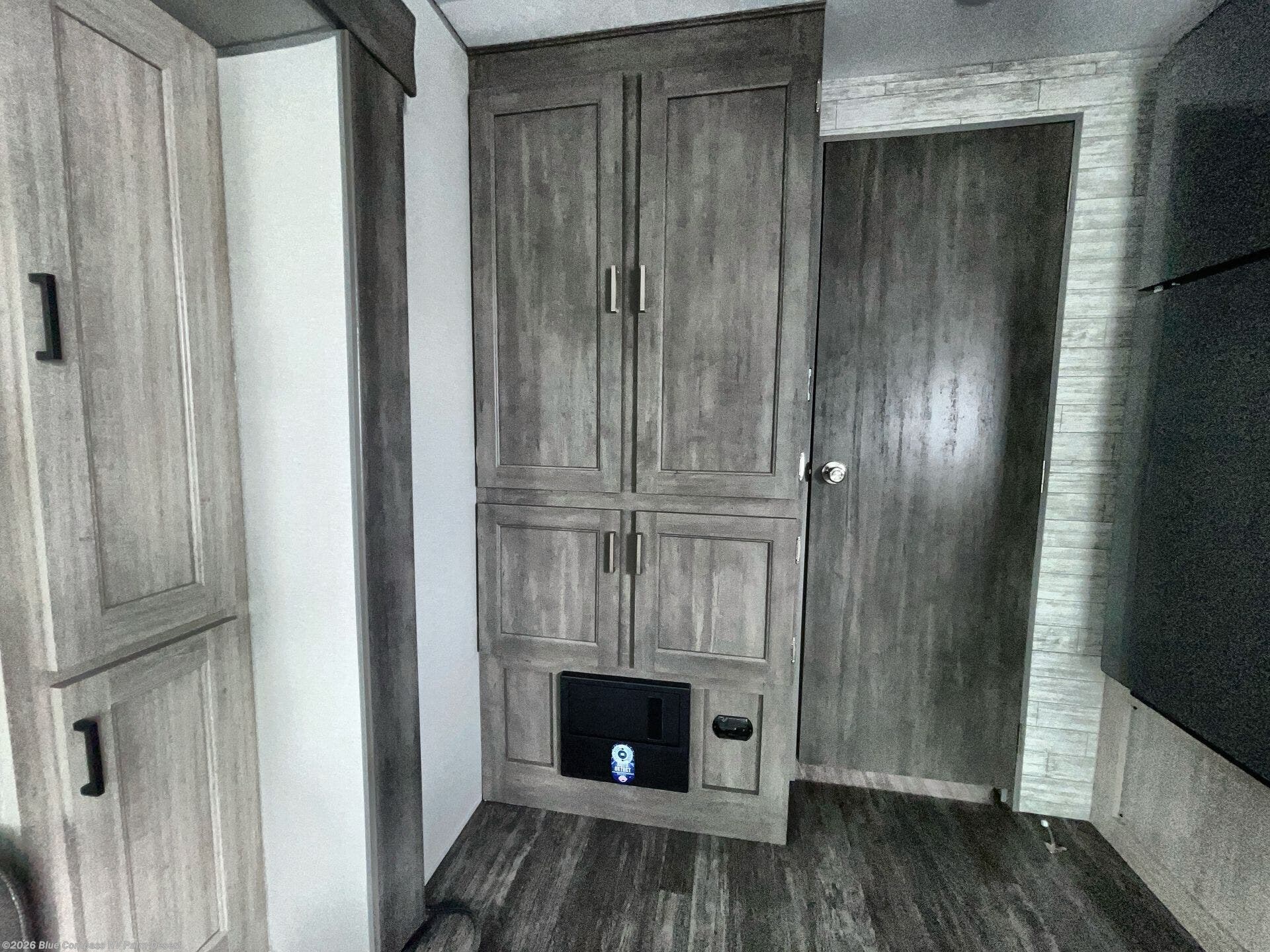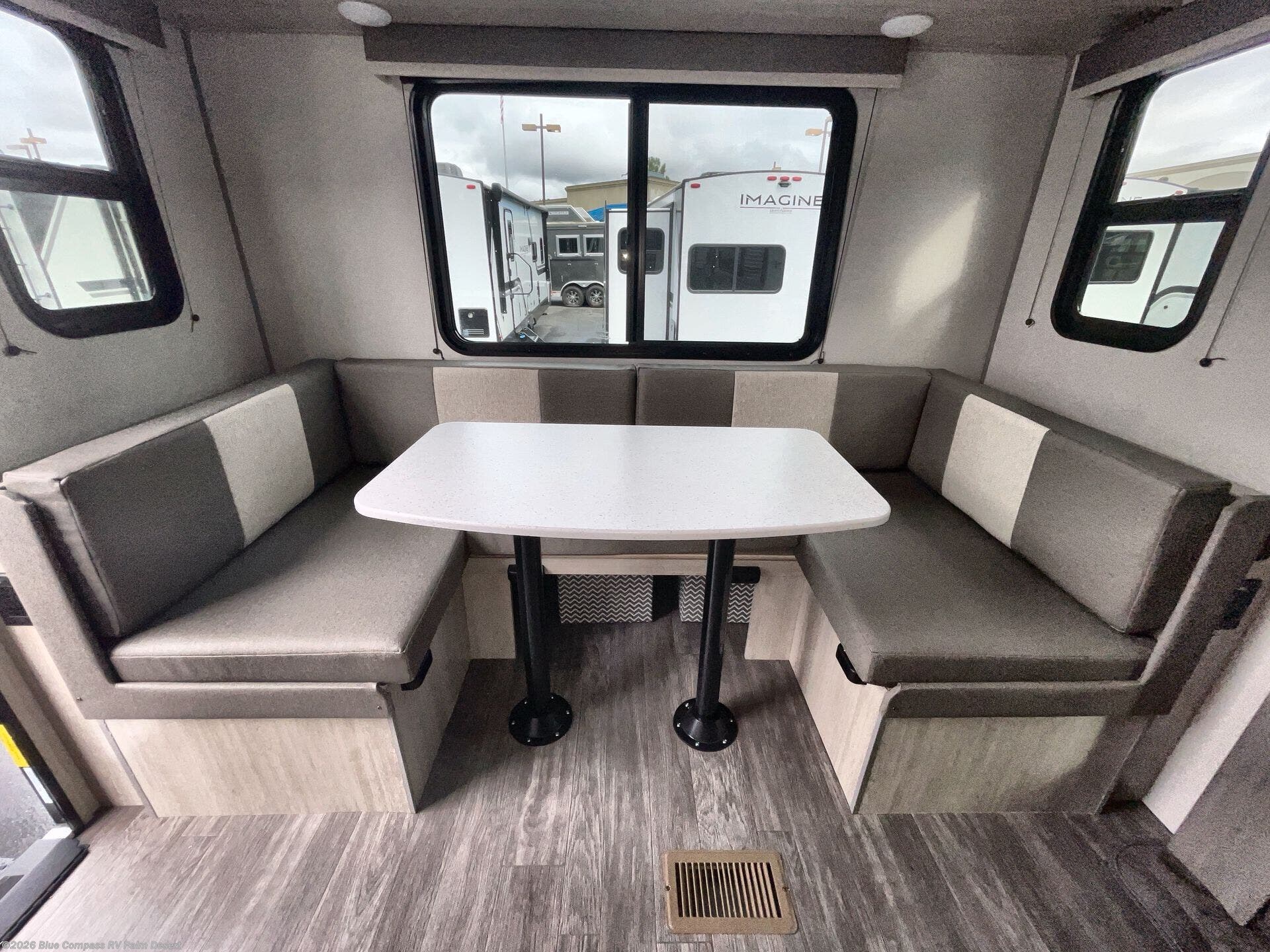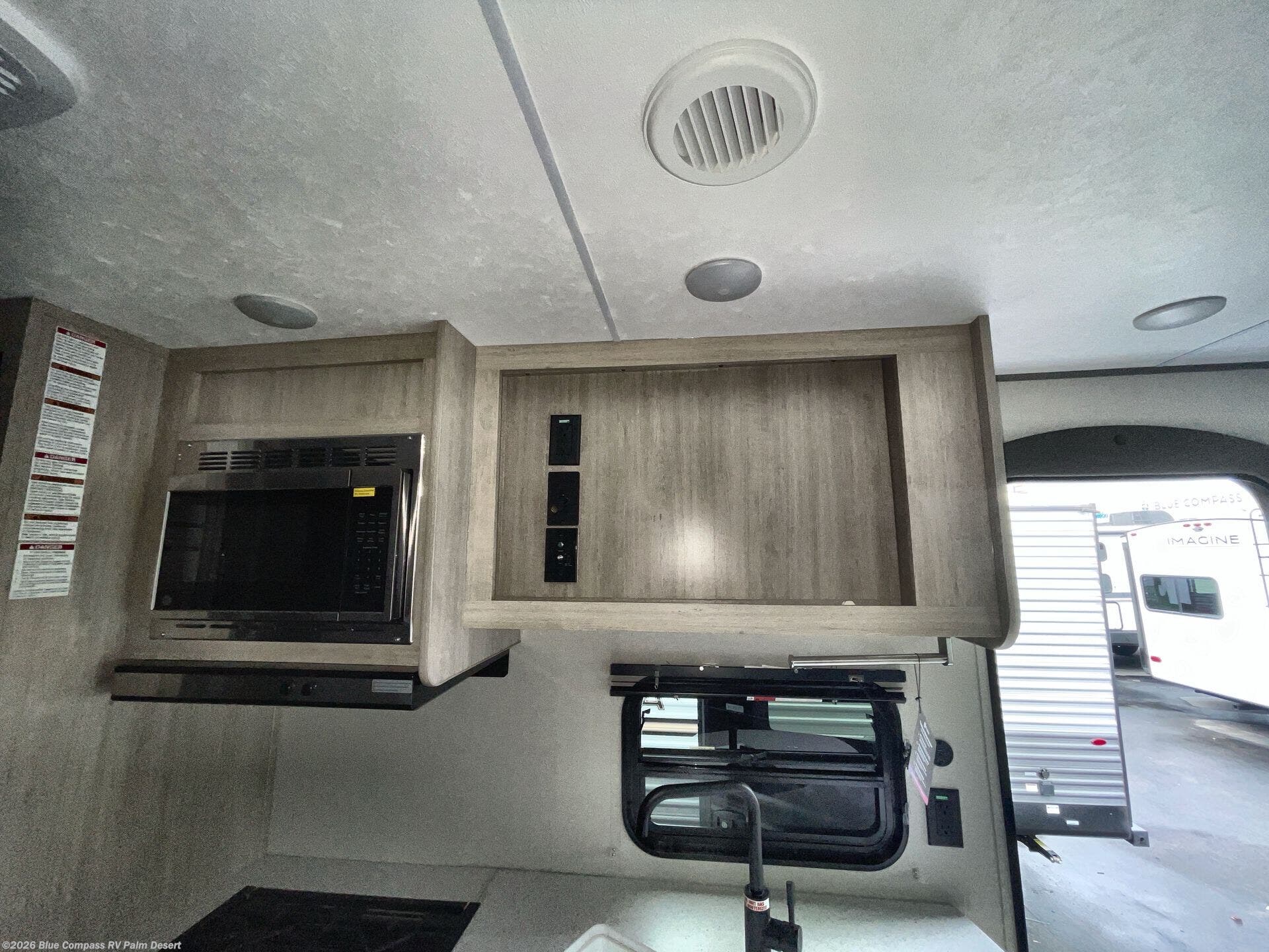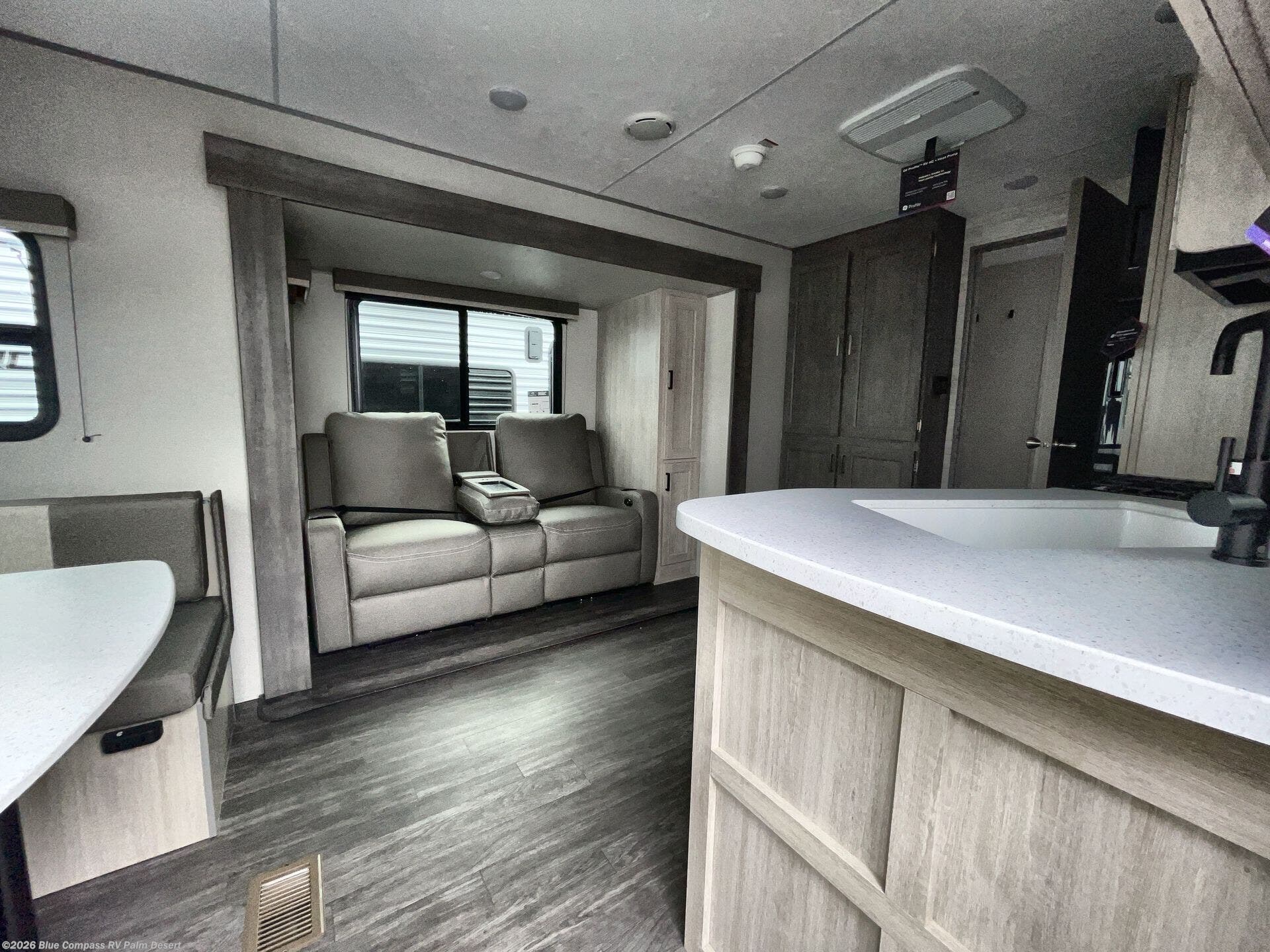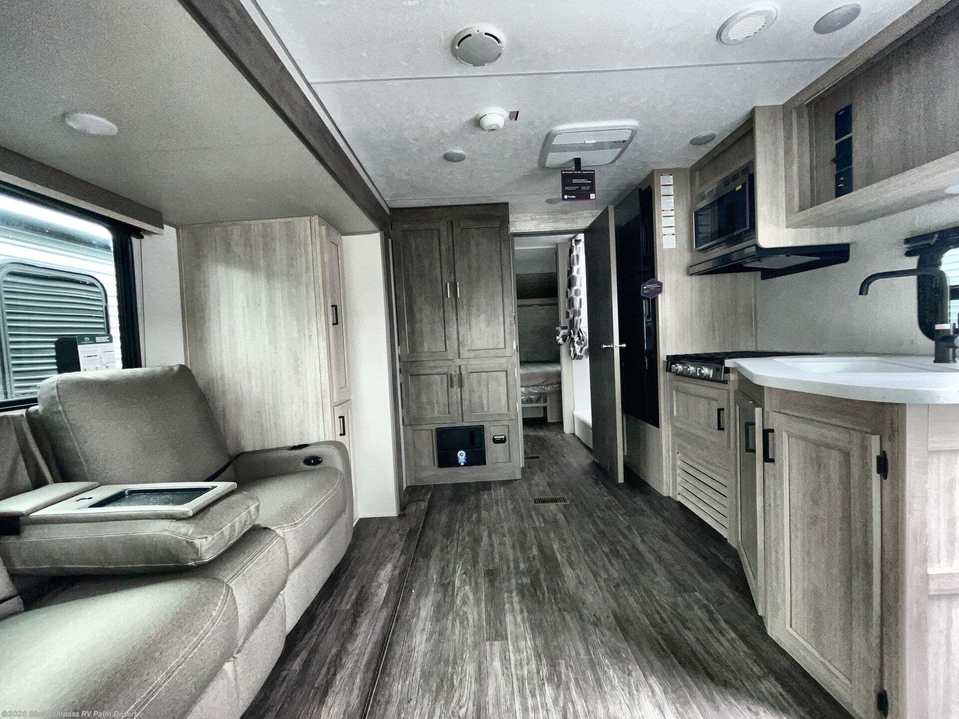 Pack your bags and head to your favorite camping spot with this travel trailer in tow! You can relax on the theater seating slide, dine around the rear U-shaped dinette, or visit outdoors under the 18' power awning. There is also a pass-thru storage outside to bring along fishing poles, camp chairs, and yard games. A full kitchen includes a three burner gas range and microwave oven, along with a 10.7 cu. ft. 12V refrigerator and pantry for food storage. The walk-thru bath will create a front master bedroom you are sure to love, especially with its queen bed, dual bedside wardrobes and an overhead shelf for storage!