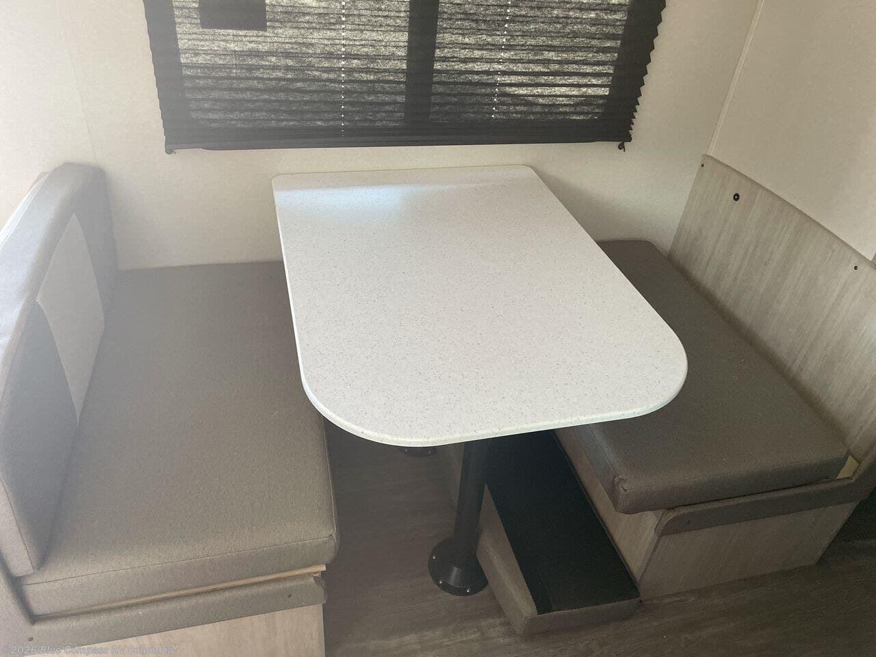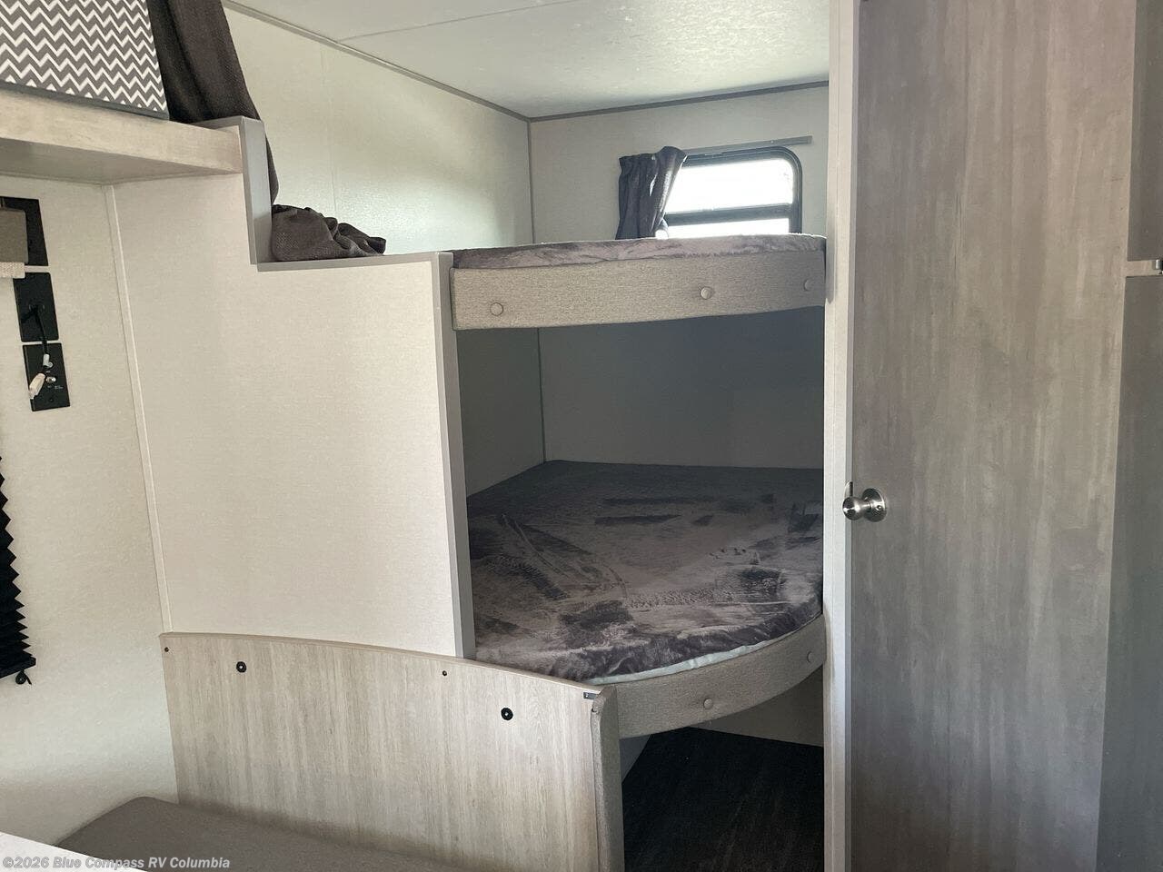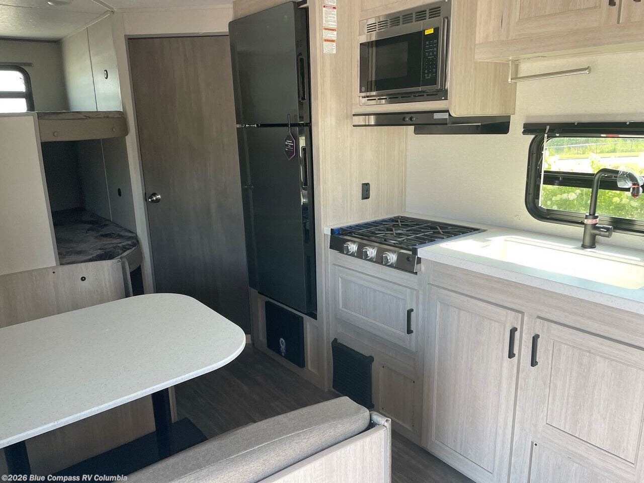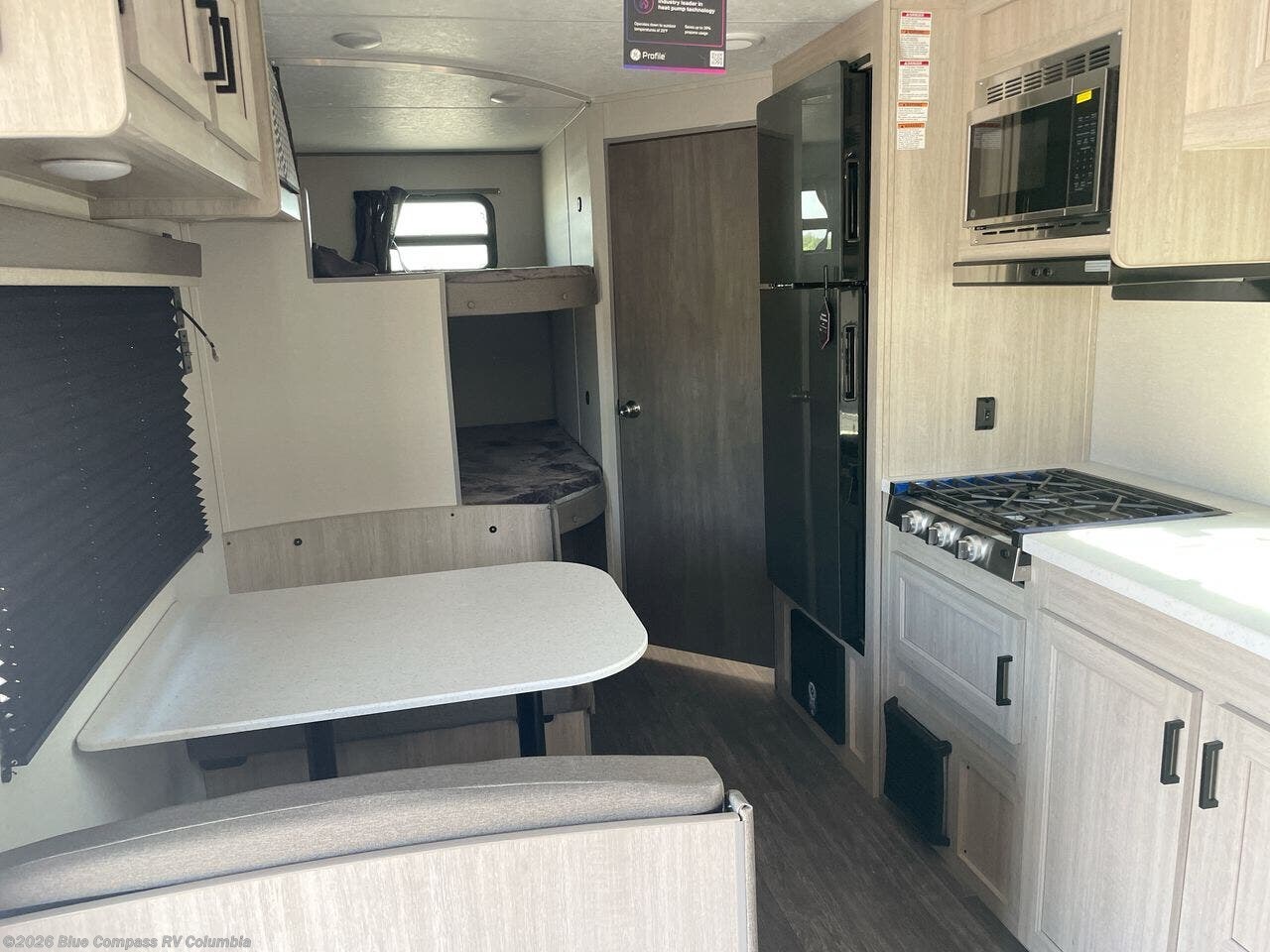 Pack your bags and head out on a fun weekend camping trip with this travel trailer! Whether you have a small family or a few guests wanting to come along, there will be enough sleeping spaces between the double-size bunk beds, the 60" x 74" queen bed in the front semi-private bedroom, and even the booth dinette. The chef can prepare meals indoors using the three burner cooktop or microwave oven, and there is a 12V 10.7 cu. ft. refrigerator for perishables. There is plenty of storage throughout with the overhead cabinets and wardrobes, as well as outside with the front pass-through storage area!