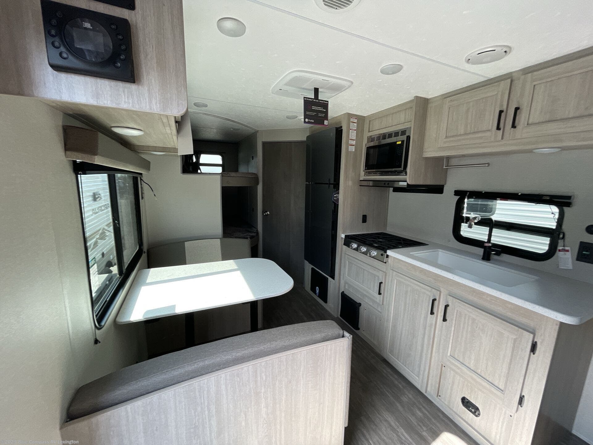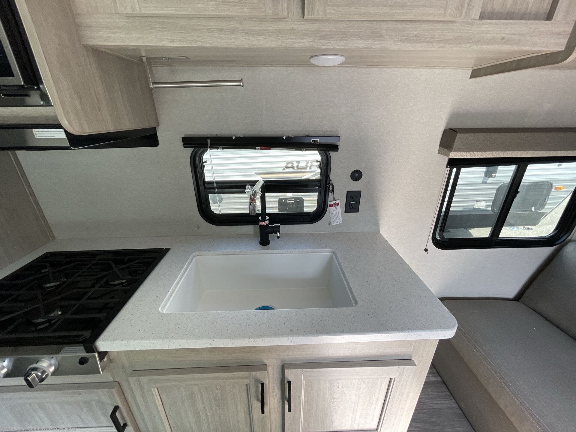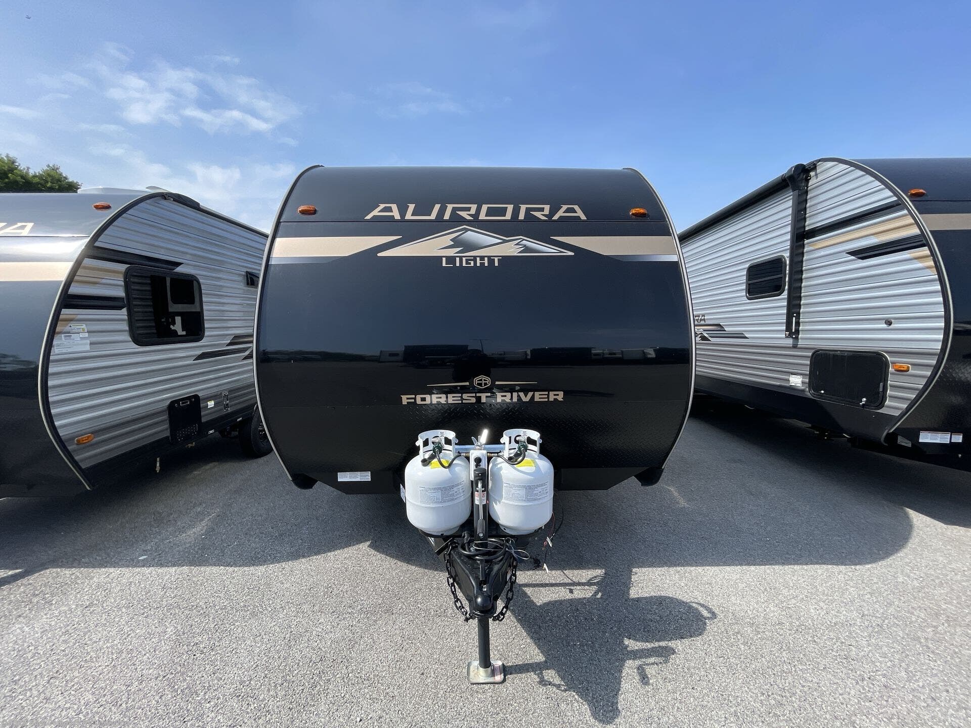 Comfortability, usability, and quality is what you will find in each one of these Forest River Aurora Light travel trailers! They are designed with a superior build and packed full with industry leading, functional, and distinctive standard features. The diamond plate rock guard will protect your unit from road debris and the nitrogen filled radial tires, which keep their pressure longer, offer better fuel economy. You will also find upgraded JBL Elite exterior speaker outside, an electric awning with multicolor lights and remote, plus flush mount baggage doors for easy packing. The interiors are beautifully designed with matte black kitchen and bath faucets, black nightshades in the living room, and GE kitchen appliances!